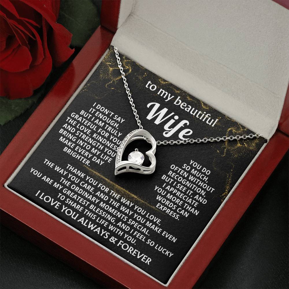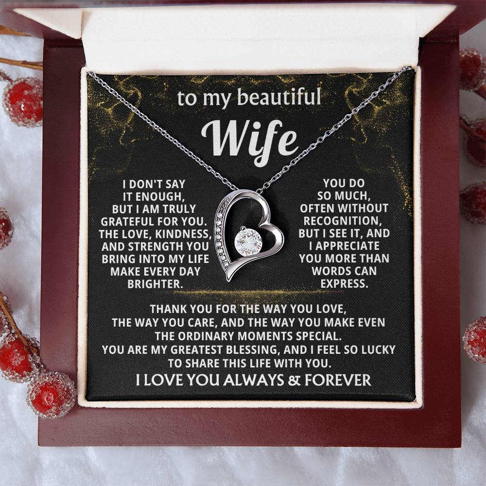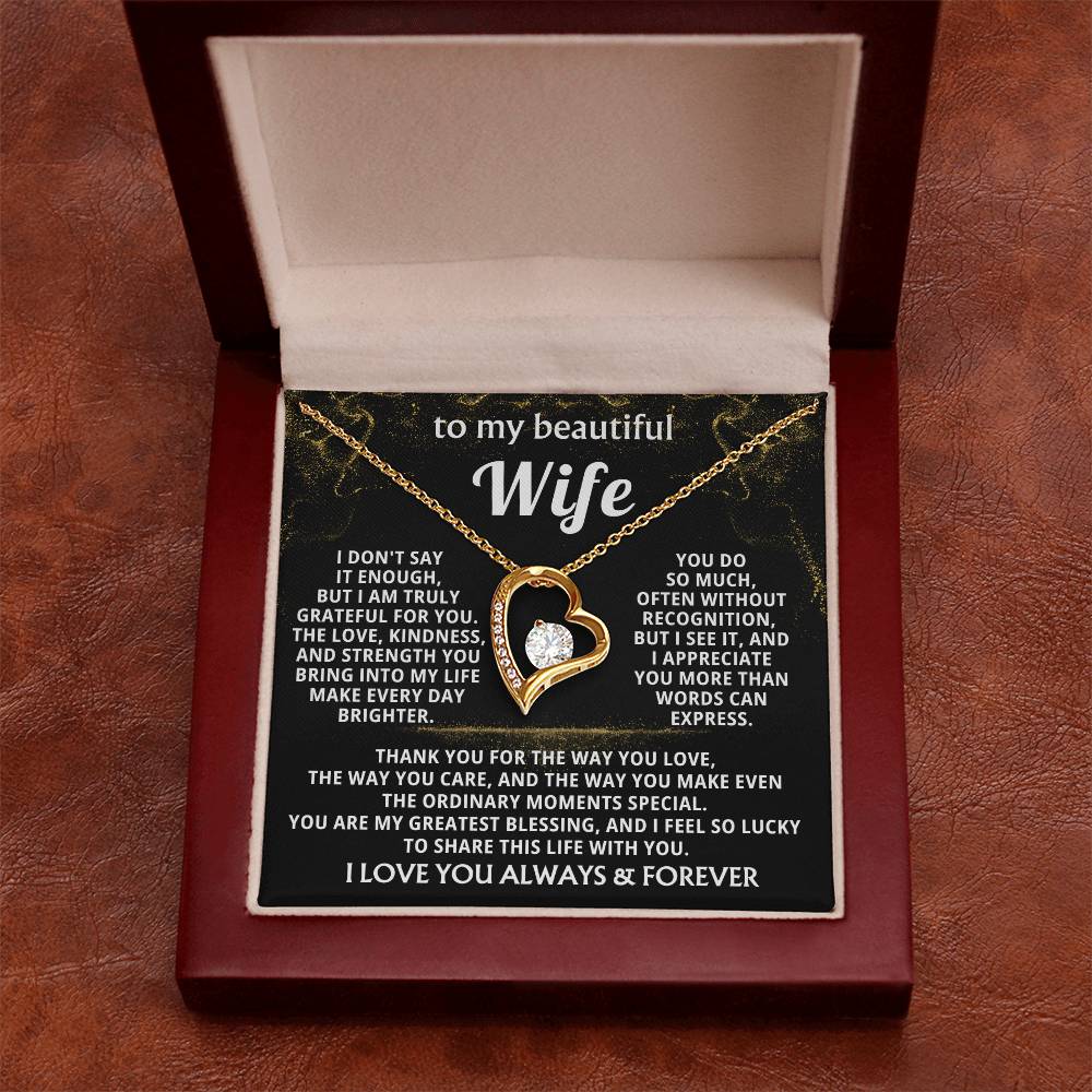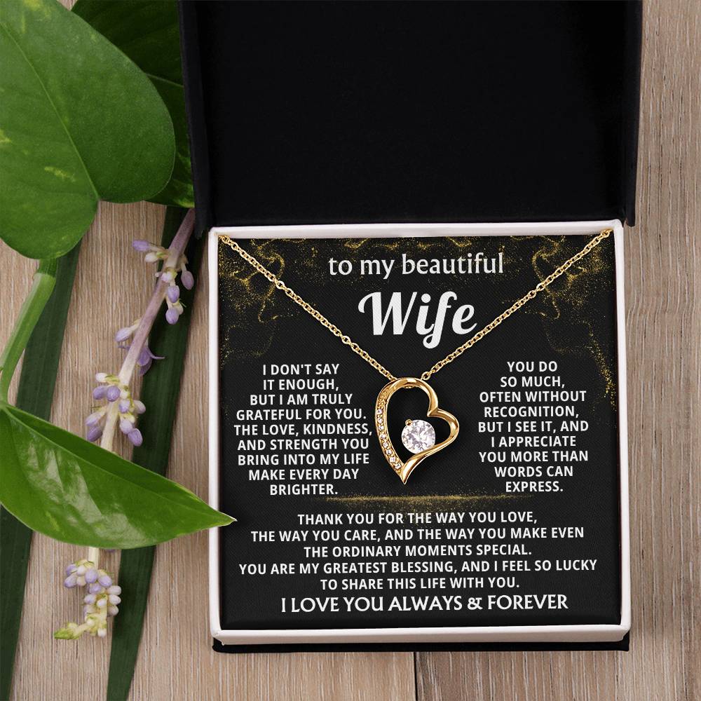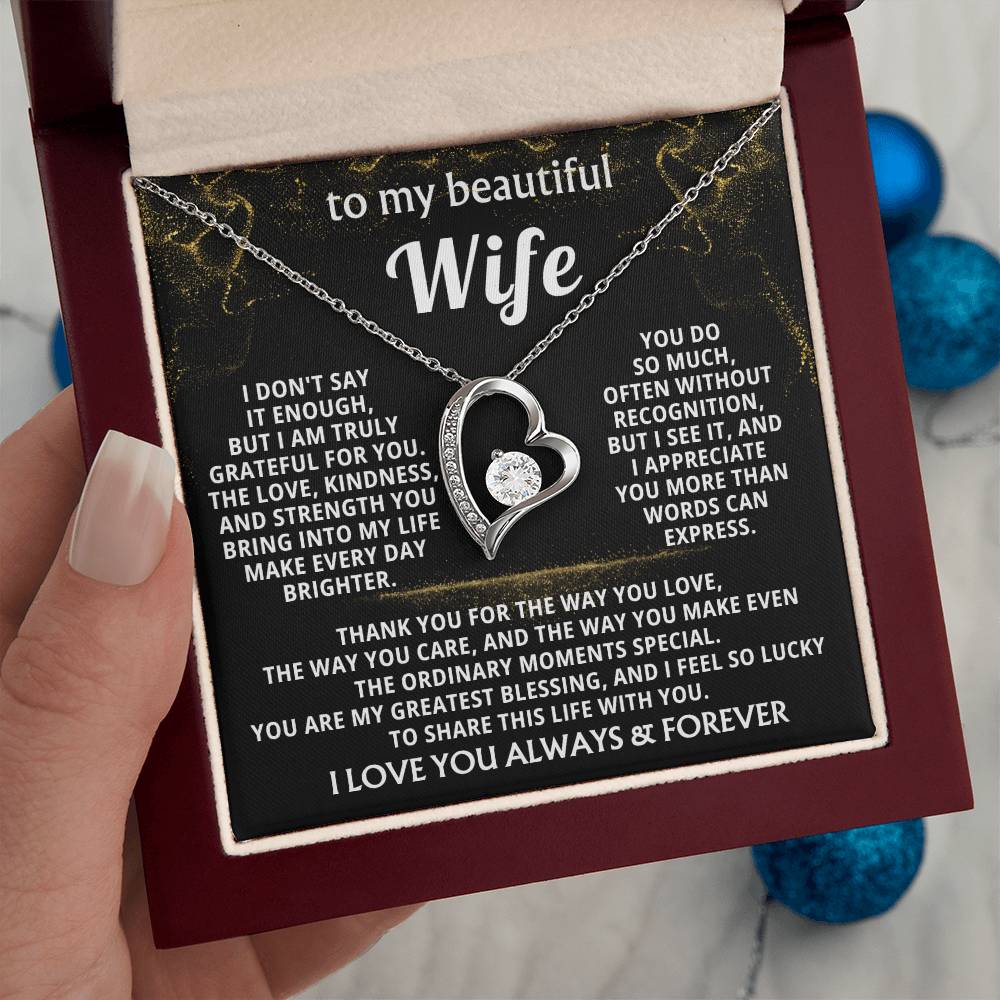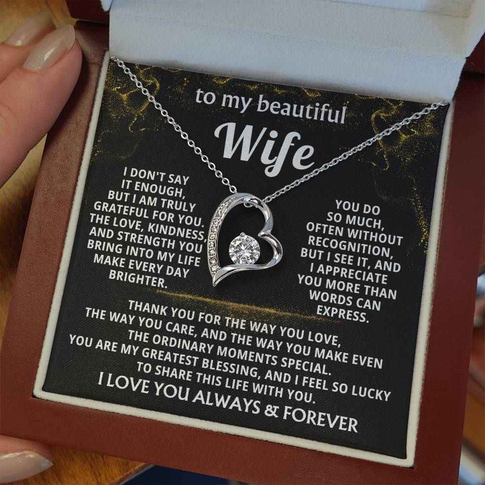 Quote On Card: TO MY BEAUTIFUL WIFE - I don't say it enough, but I am truly grateful for you. The love, kindness, and strength you bring into my life make every day brighter. You do so much, often without recognition, but I see it, and I appreciate you more than words can express.Thank you for the way you love, the way you care, and the way you make even the ordinary moments special. You are my greatest blessing, and I feel so lucky to share this life with you. I LOVE YOU ALWAYS & FOREVER