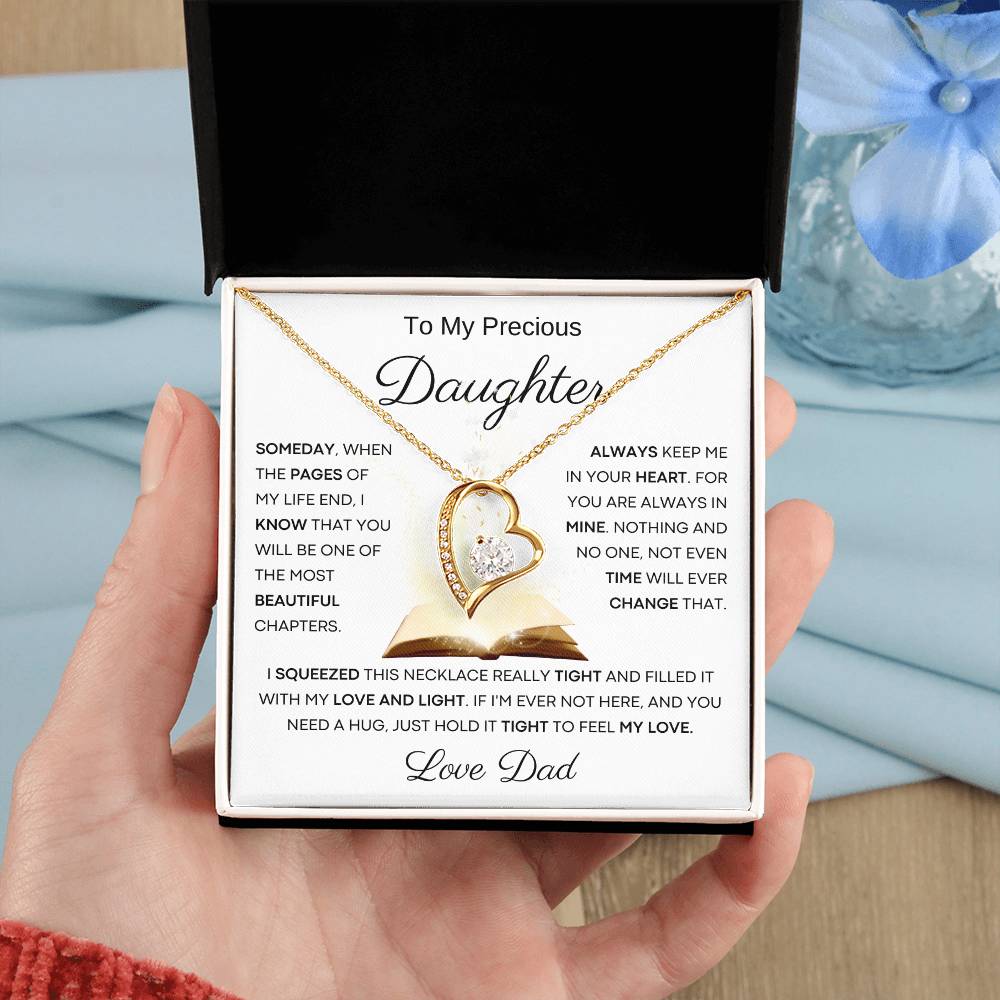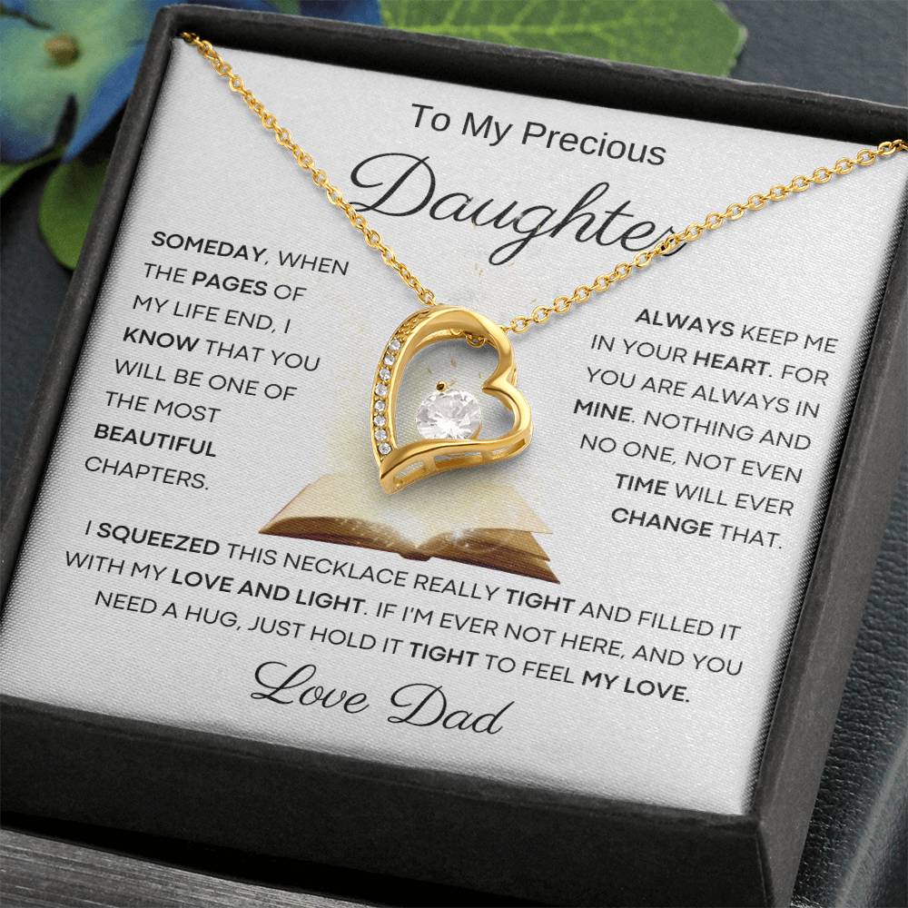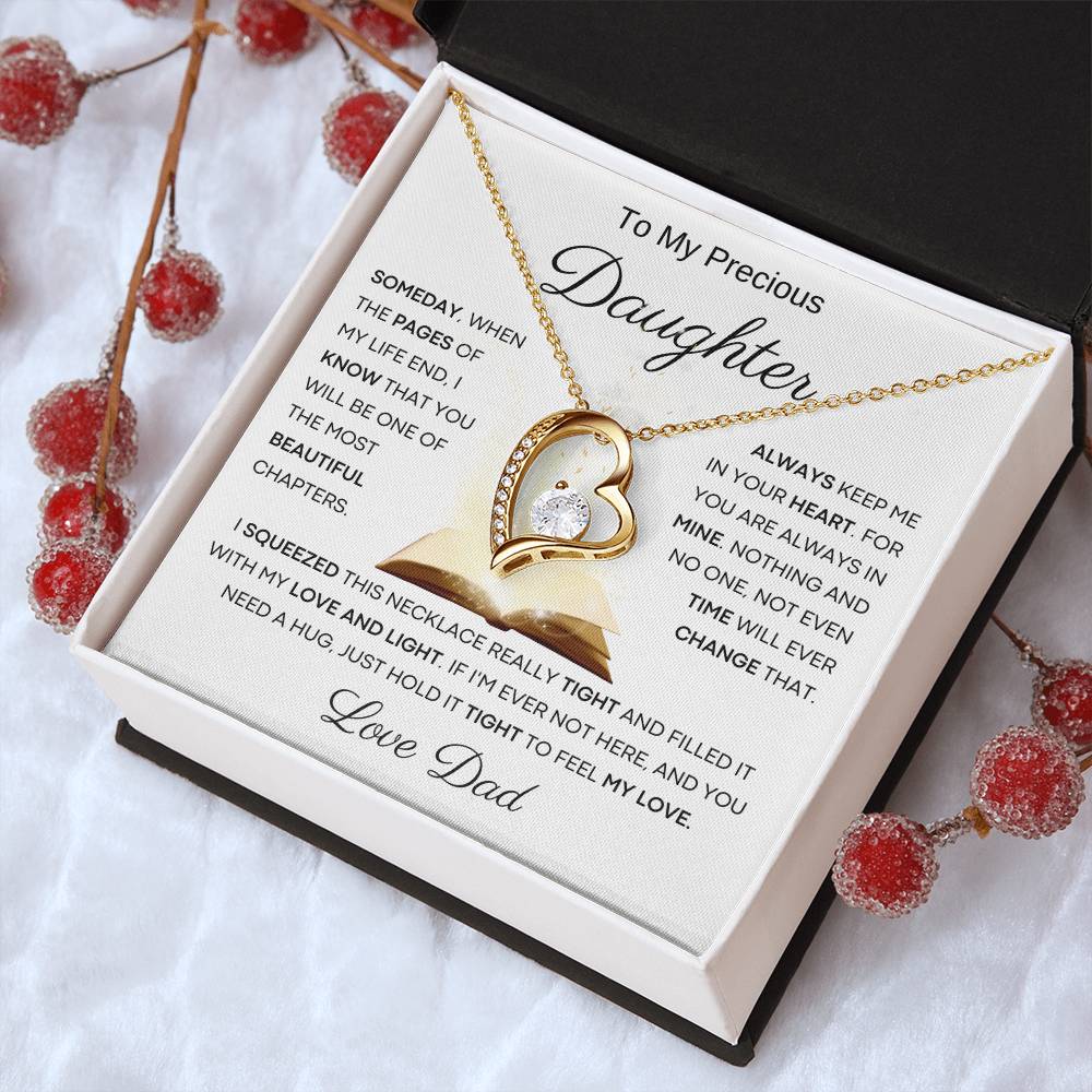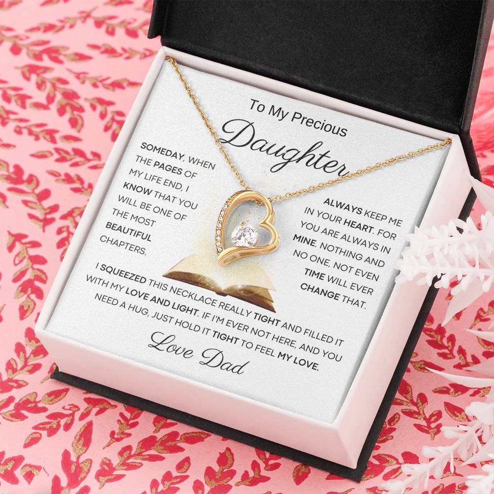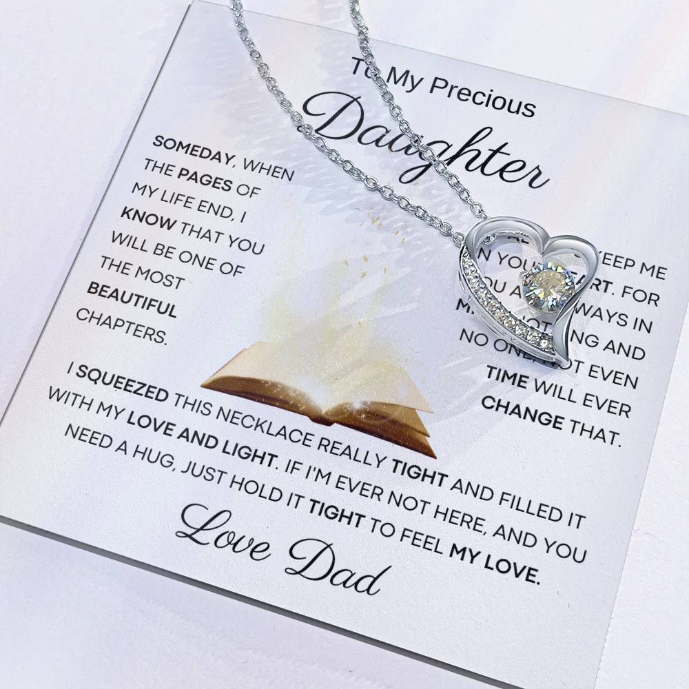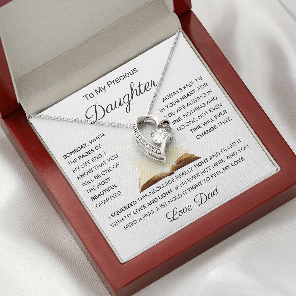 Quote On Card: To My Beautiful Daughter , Someday, When The Pages Of My Life End, I Know That You Will Be One Of The Most Beautiful Chapters. Always Keep Me In Your Heart. For You Are Always In Mine. Nothing And No One, Not Even Time Will Ever Change That .I Squeezed This Necklace Really Tight And Filled It With My Love, And Light. If I'm Ever Not Here, And You Need A Hug, Just Hold It Tight To Feel My Love. I Love You
