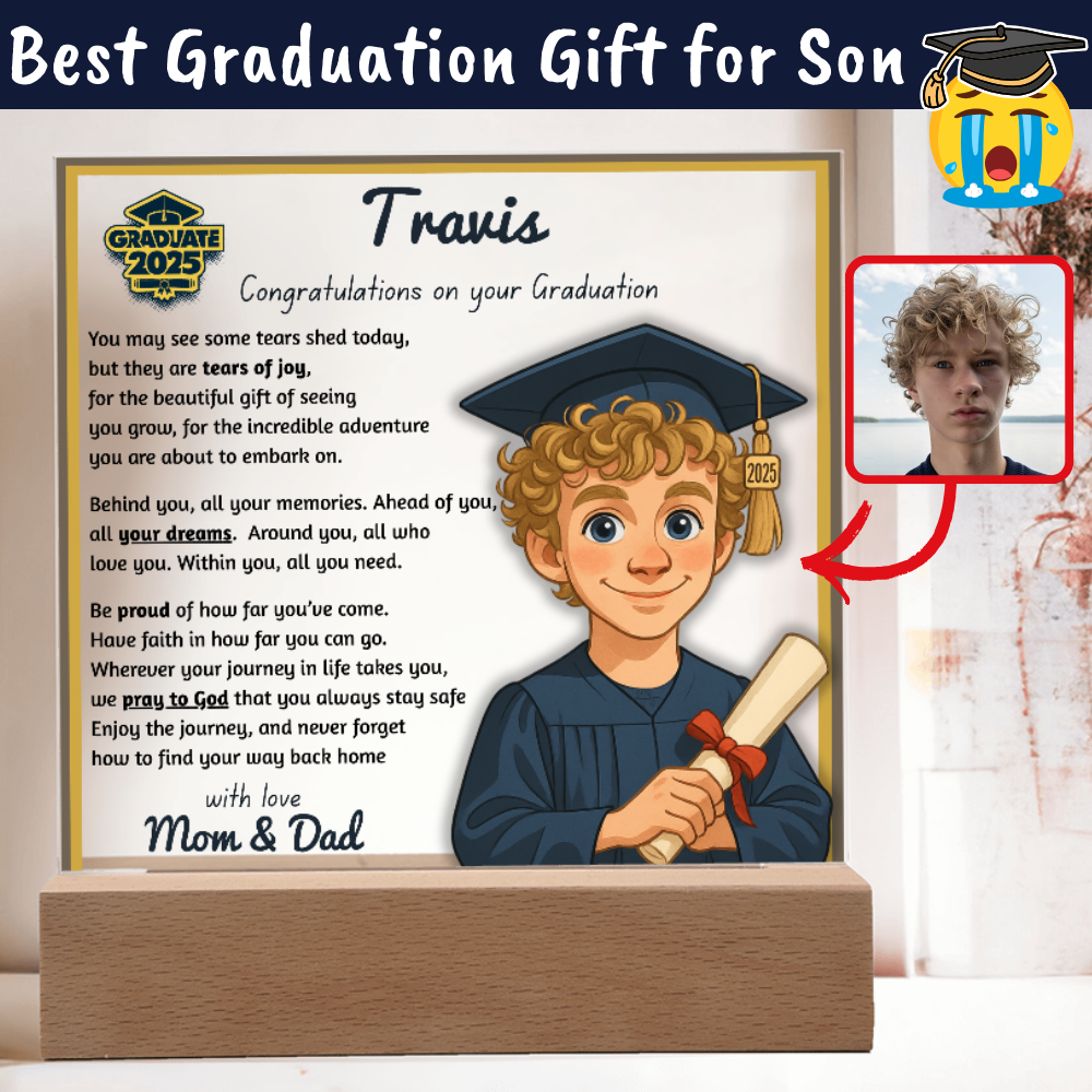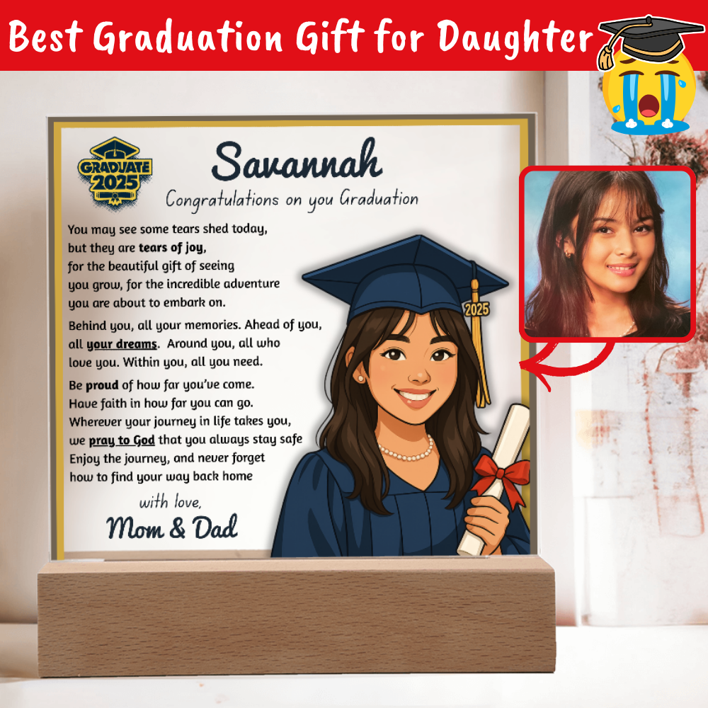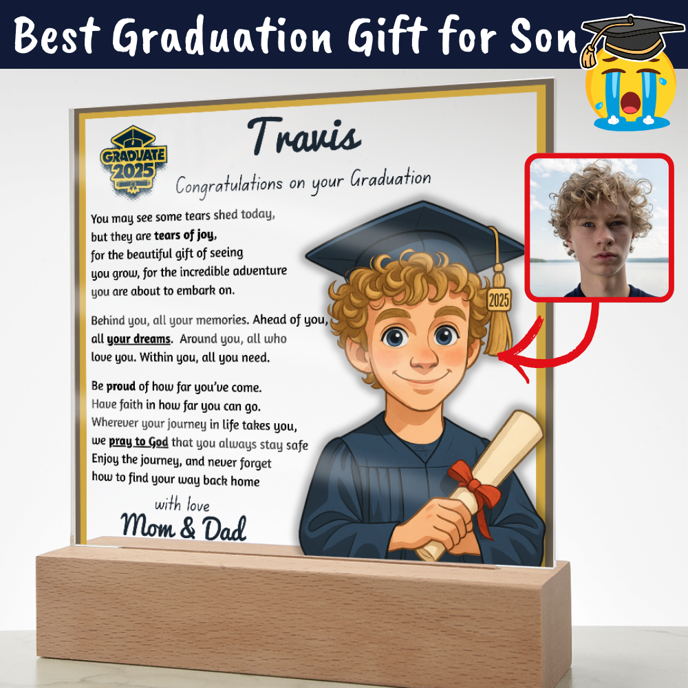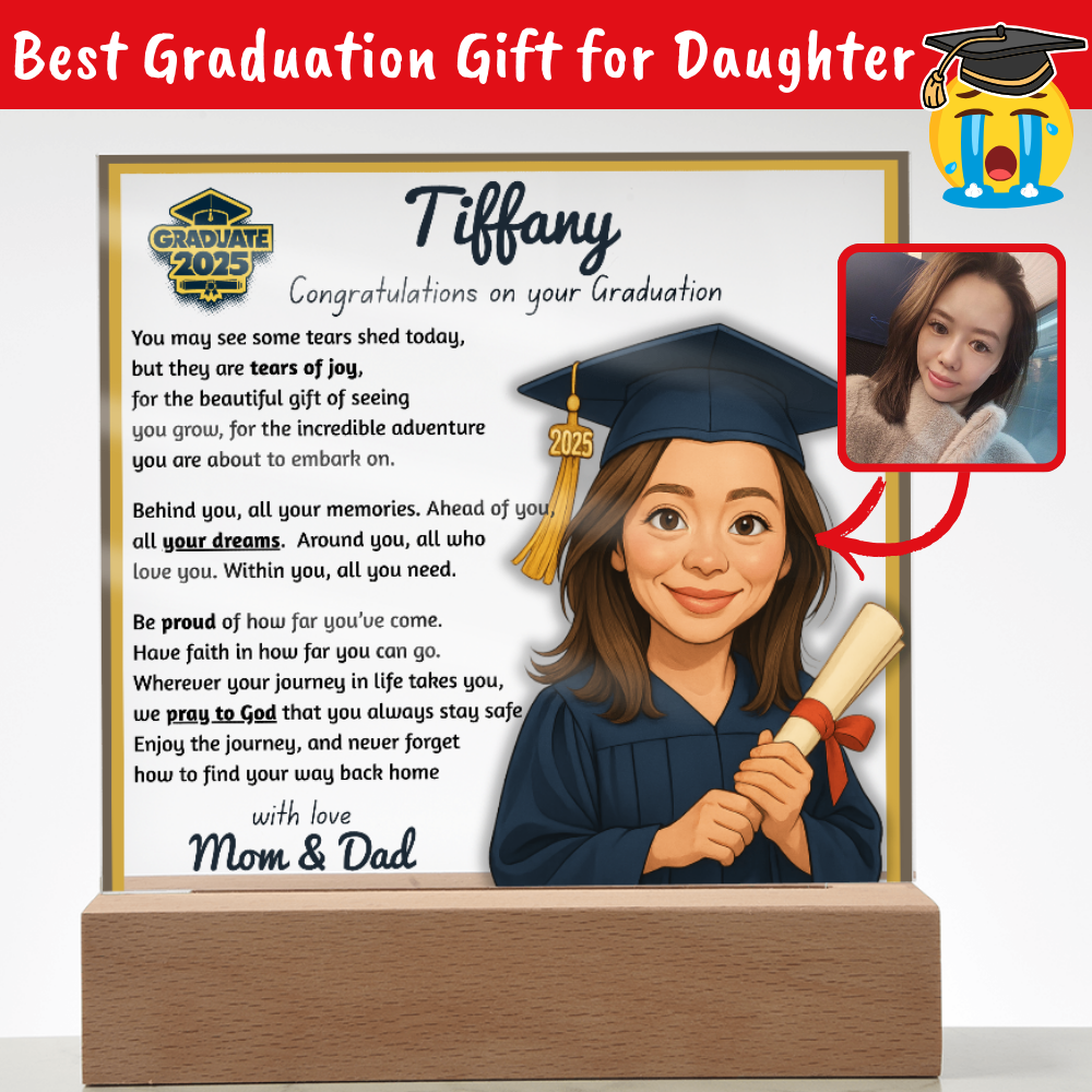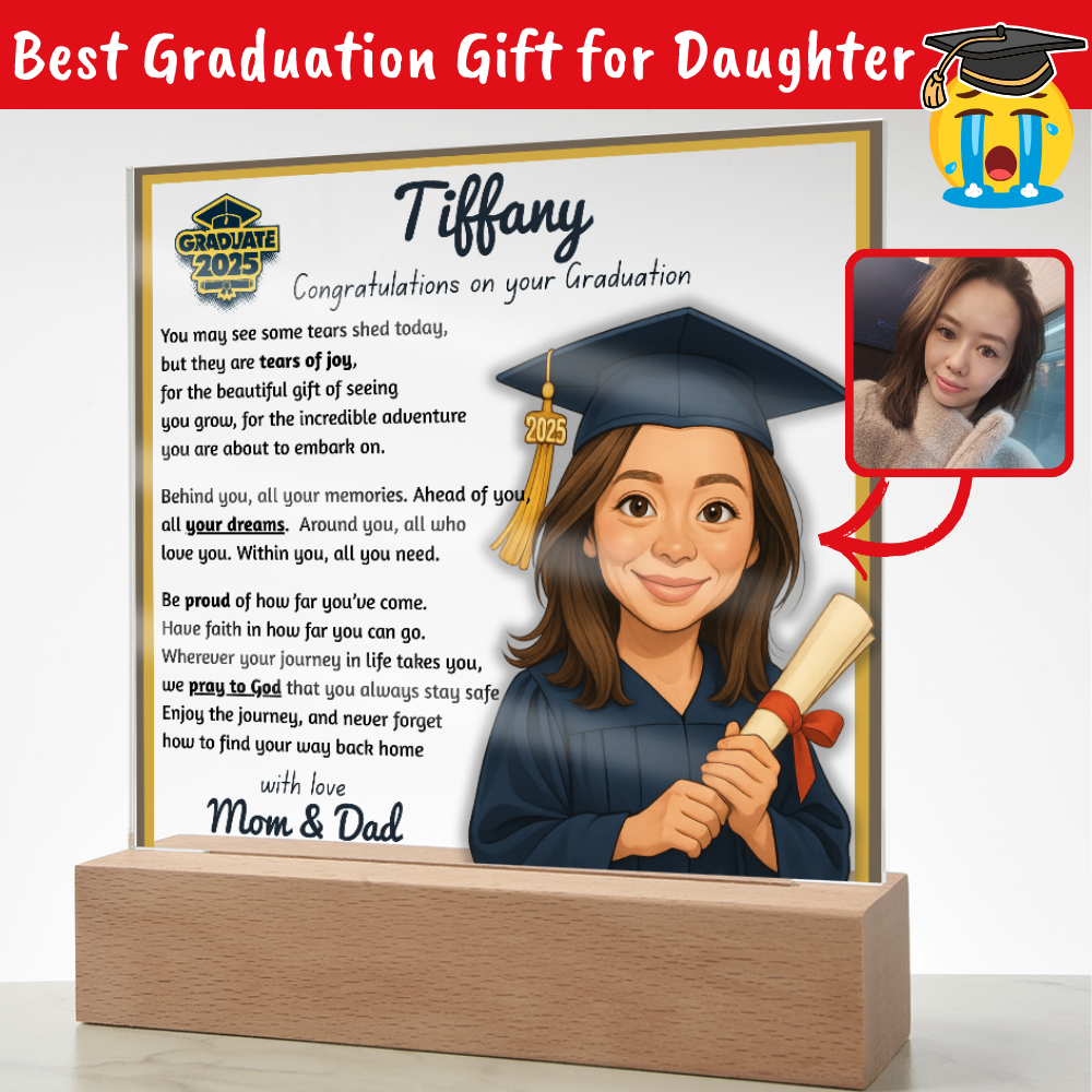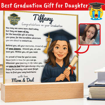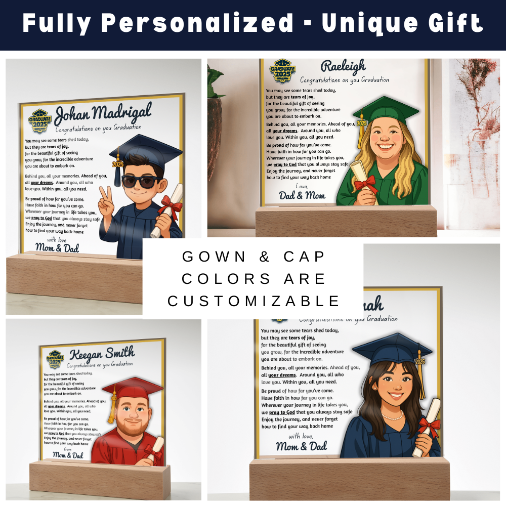 Make their graduation unforgettable with a beautiful, personalized acrylic plaque—featuring their name, outfit, skin tone, and a touching message. Crafted from premium crystal-clear acrylic and paired with a solid wooden base, it’s a keepsake they’ll display proudly for years.