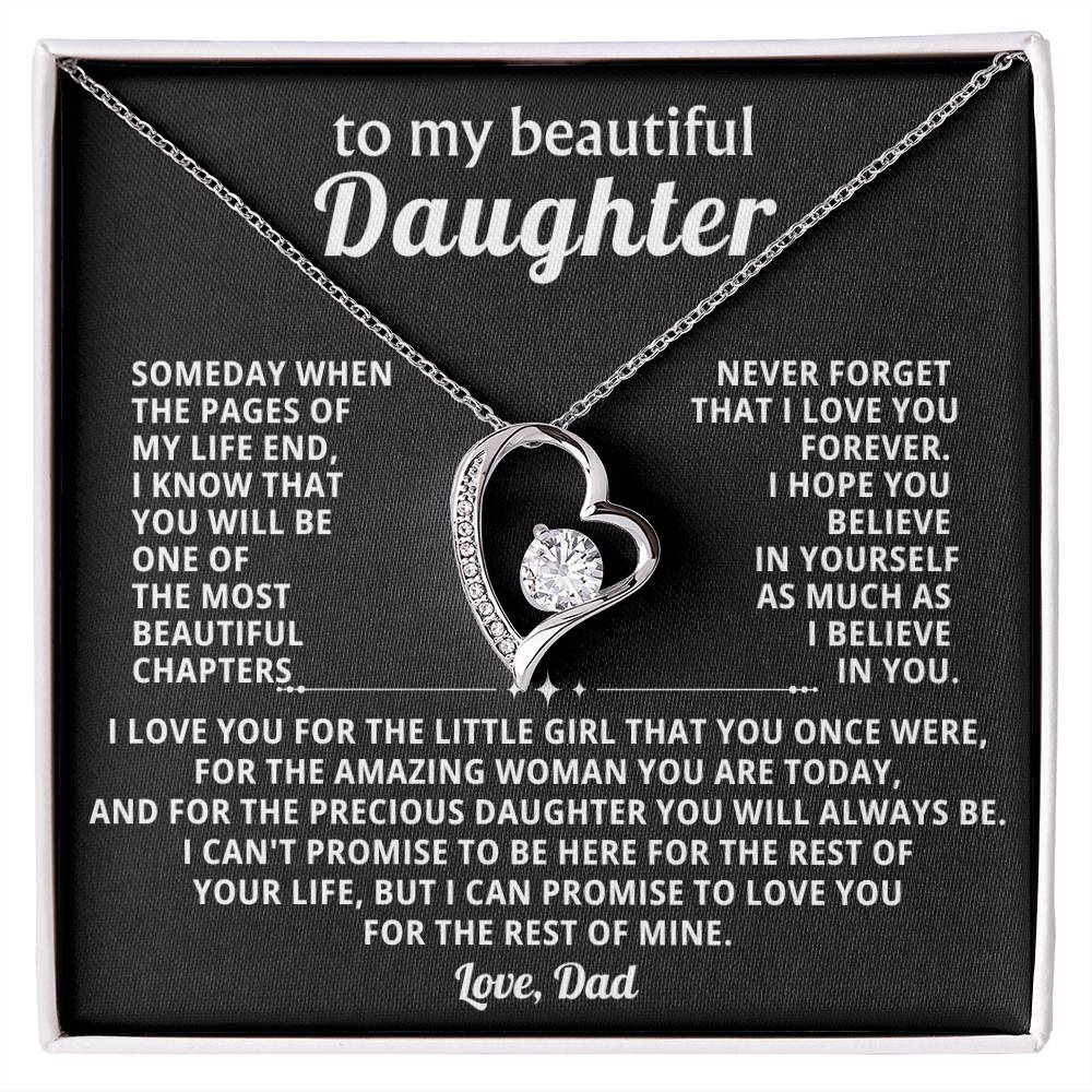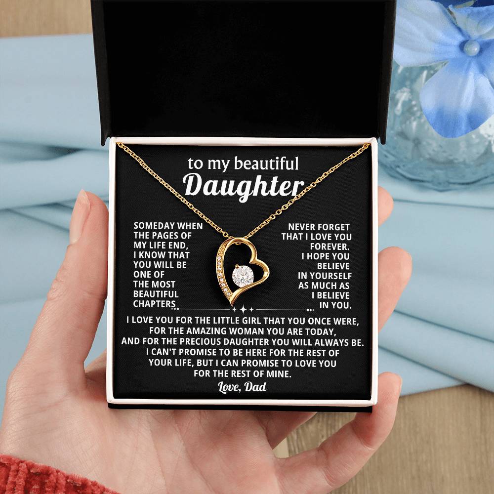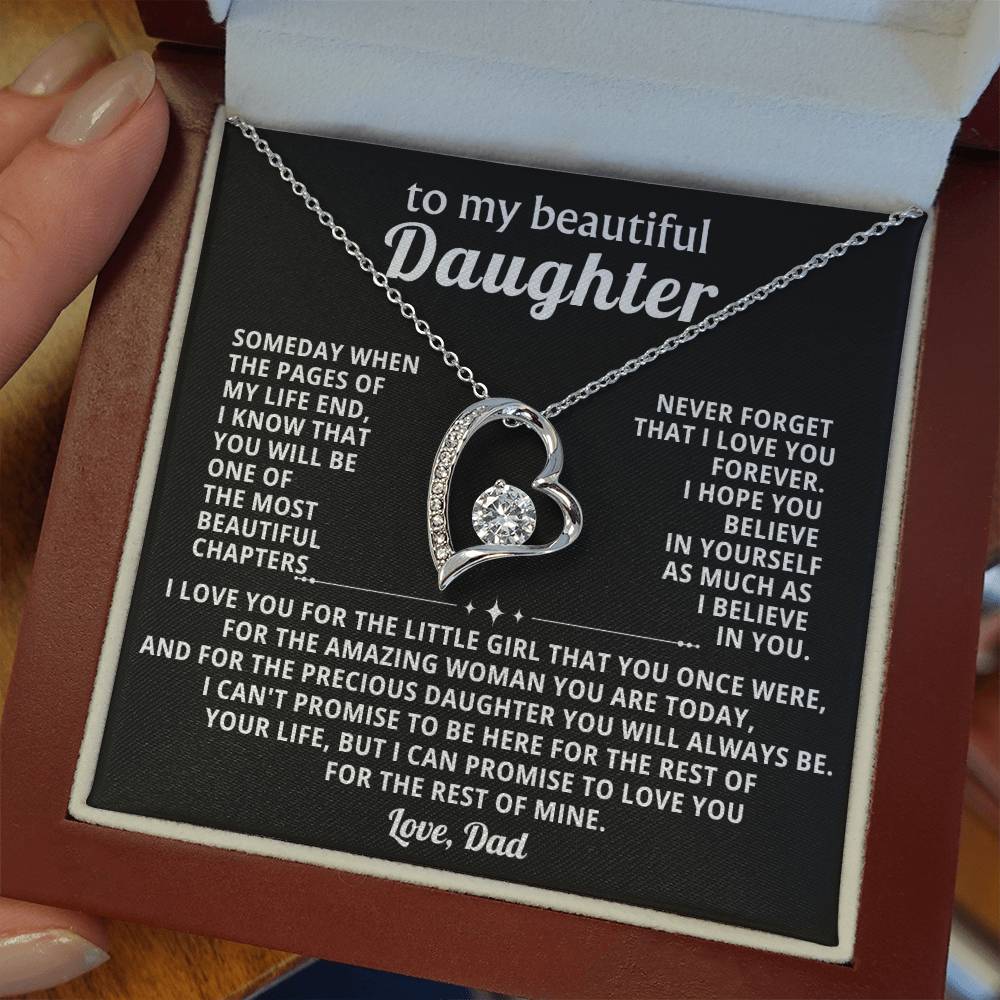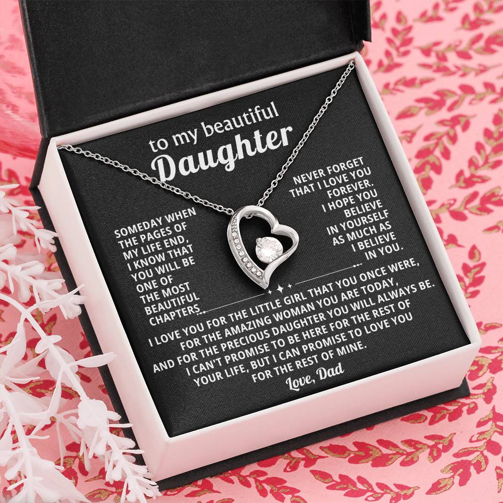 Quote On Card: TO MY BEAUTIFUL DAUGHTER, SOMEDAY WHEN THE PAGES OF MY LIFE END, I KNOW THAT YOU WILL BE ONE OF THE MOST BEAUTIFUL CHAPTERS. NEVER FORGET THAT I LOVE YOU FOREVER. I HOPE YOU BELIEVE IN YOURSELF AS MUCH AS I BELIEVE IN YOU. I LOVE YOU FOR THE LITTLE GIRL THAT YOU ONCE WERE, FOR THE AMAZING WOMAN YOU ARE TODAY, AND FOR THE PRECIOUS DAUGHTER YOU WILL ALWAYS BE.I CAN'T PROMISE TO BE HERE FOR THE REST OF YOUR LIFE, BUT I CAN PROMISE TO LOVE YOU FOR THE REST OF MINE.LOVE, DAD