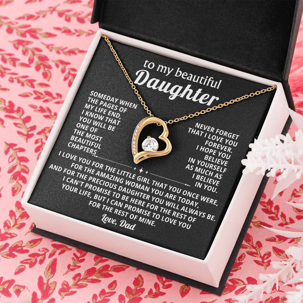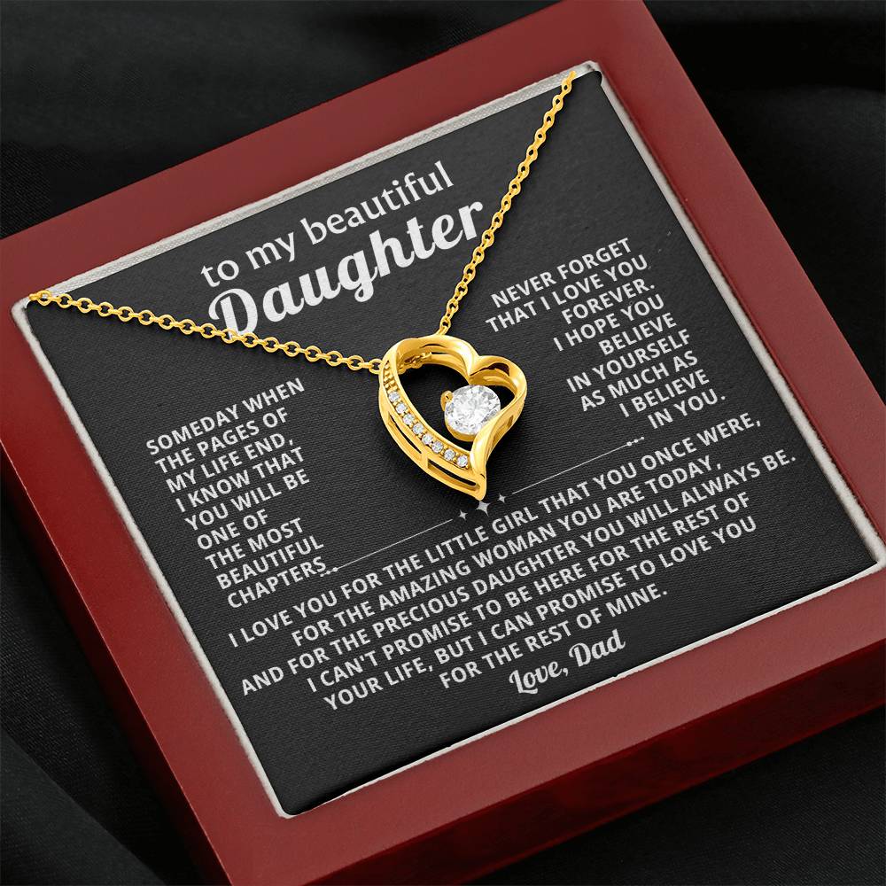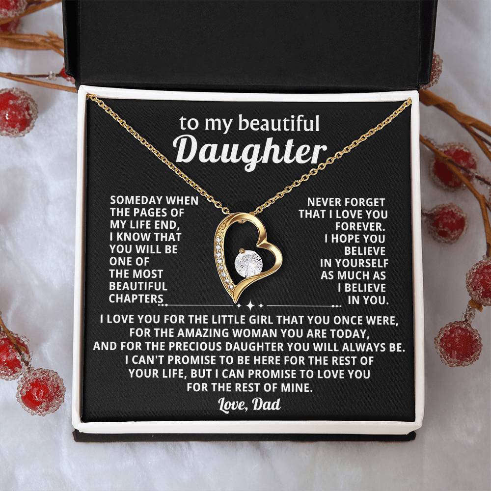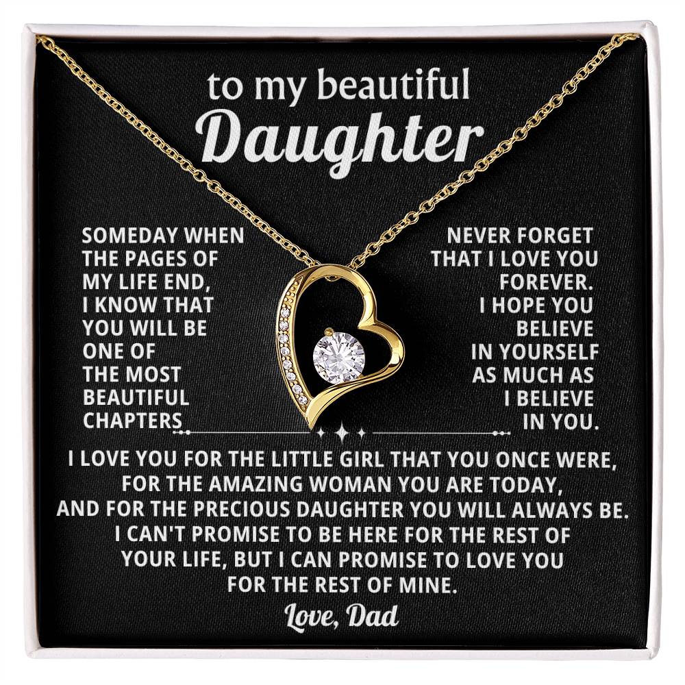 Quote On Card: TO MY BEAUTIFUL DAUGHTER, SOMEDAY WHEN THE PAGES OF MY LIFE END, I KNOW THAT YOU WILL BE ONE OF THE MOST BEAUTIFUL CHAPTERS. NEVER FORGET THAT I LOVE YOU FOREVER. I HOPE YOU BELIEVE IN YOURSELF AS MUCH AS I BELIEVE IN YOU. I LOVE YOU FOR THE LITTLE GIRL THAT YOU ONCE WERE, FOR THE AMAZING WOMAN YOU ARE TODAY, AND FOR THE PRECIOUS DAUGHTER YOU WILL ALWAYS BE.I CAN'T PROMISE TO BE HERE FOR THE REST OF YOUR LIFE, BUT I CAN PROMISE TO LOVE YOU FOR THE REST OF MINE.LOVE, DAD