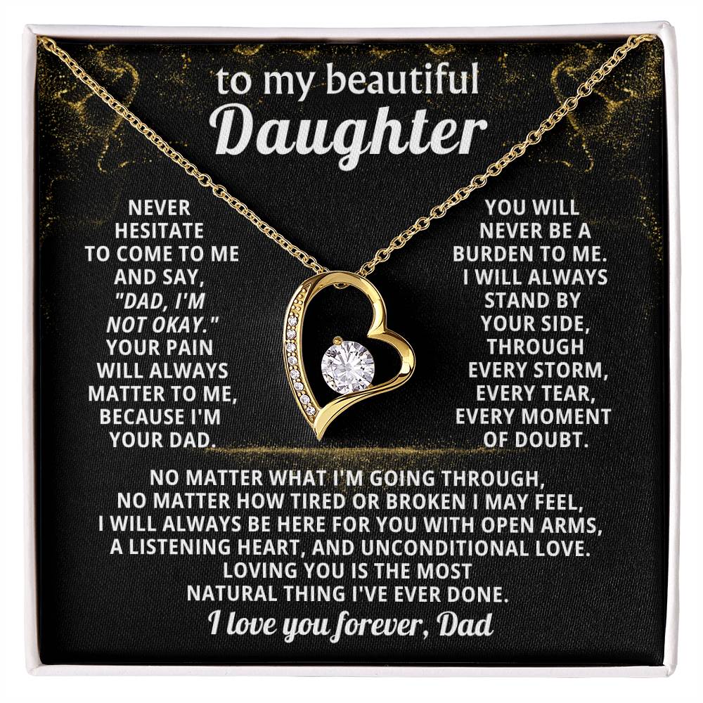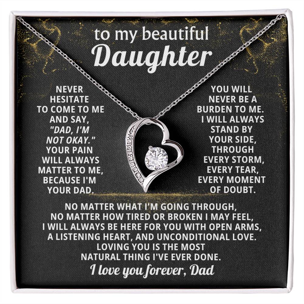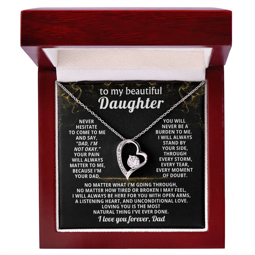 Quote On Card: TO MY BEAUTIFUL DAUGHTER, Never hesitate to come to me and say, "DAD, I'm not okay."Your pain will always matter to me, because I'm your DAD. You will never be a burden to me. I will always stand by your side, through every storm, every tear,every moment of doubt. No matter what I'm going through, no matter how tired or broken I may feel, I will always be here for you with open arms, a listening heart, and unconditional love. loving you is the most natural thing I've ever done.I love you forever, Dad