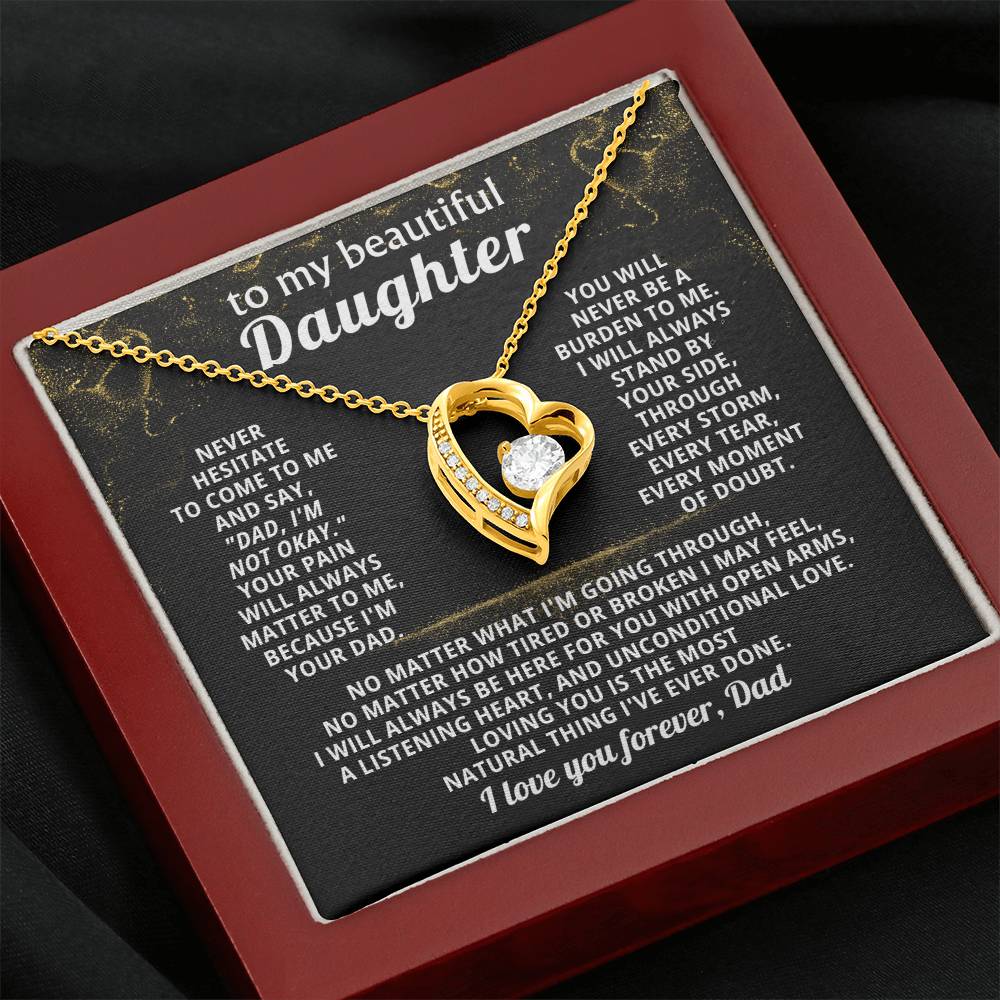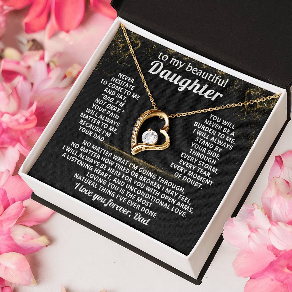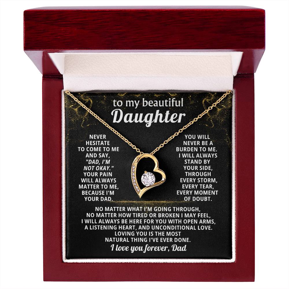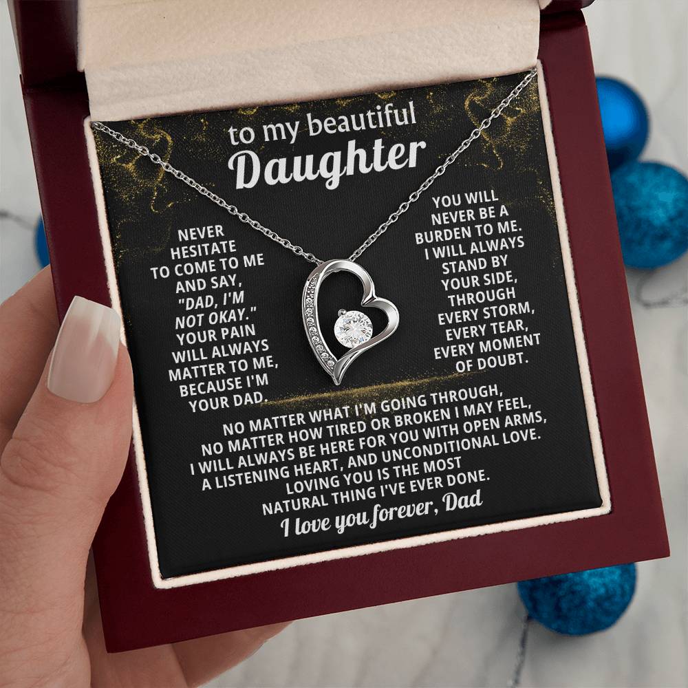 Quote On Card: TO MY BEAUTIFUL DAUGHTER, Never hesitate to come to me and say, "DAD, I'm not okay."Your pain will always matter to me, because I'm your DAD. You will never be a burden to me. I will always stand by your side, through every storm, every tear,every moment of doubt. No matter what I'm going through, no matter how tired or broken I may feel, I will always be here for you with open arms, a listening heart, and unconditional love. loving you is the most natural thing I've ever done.I love you forever, Dad