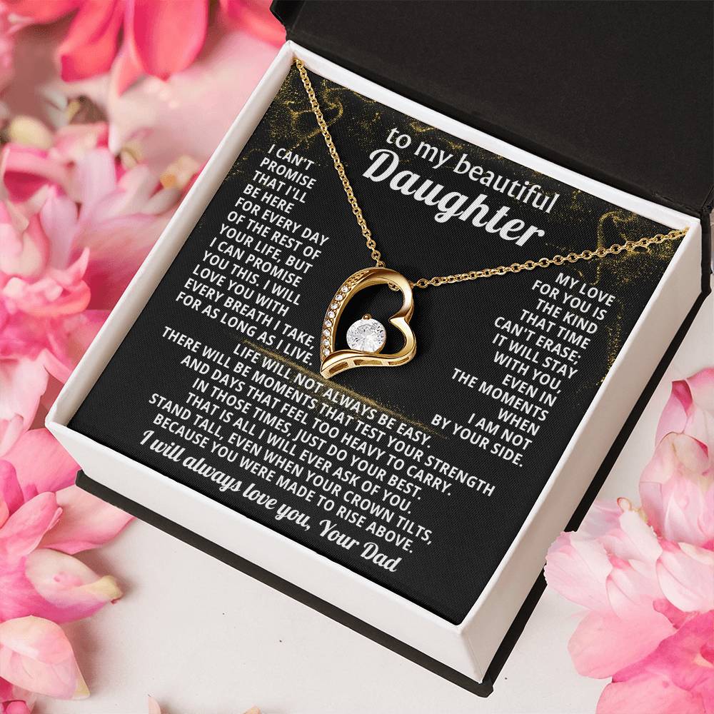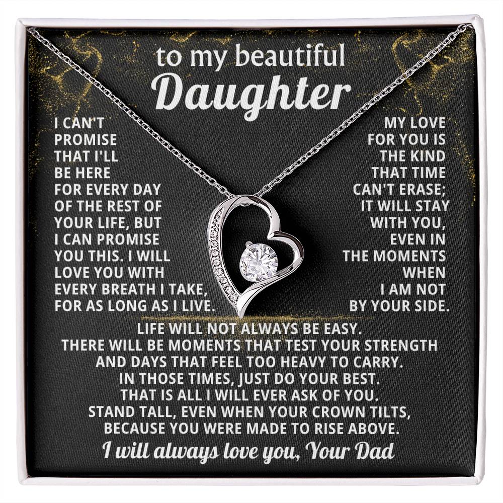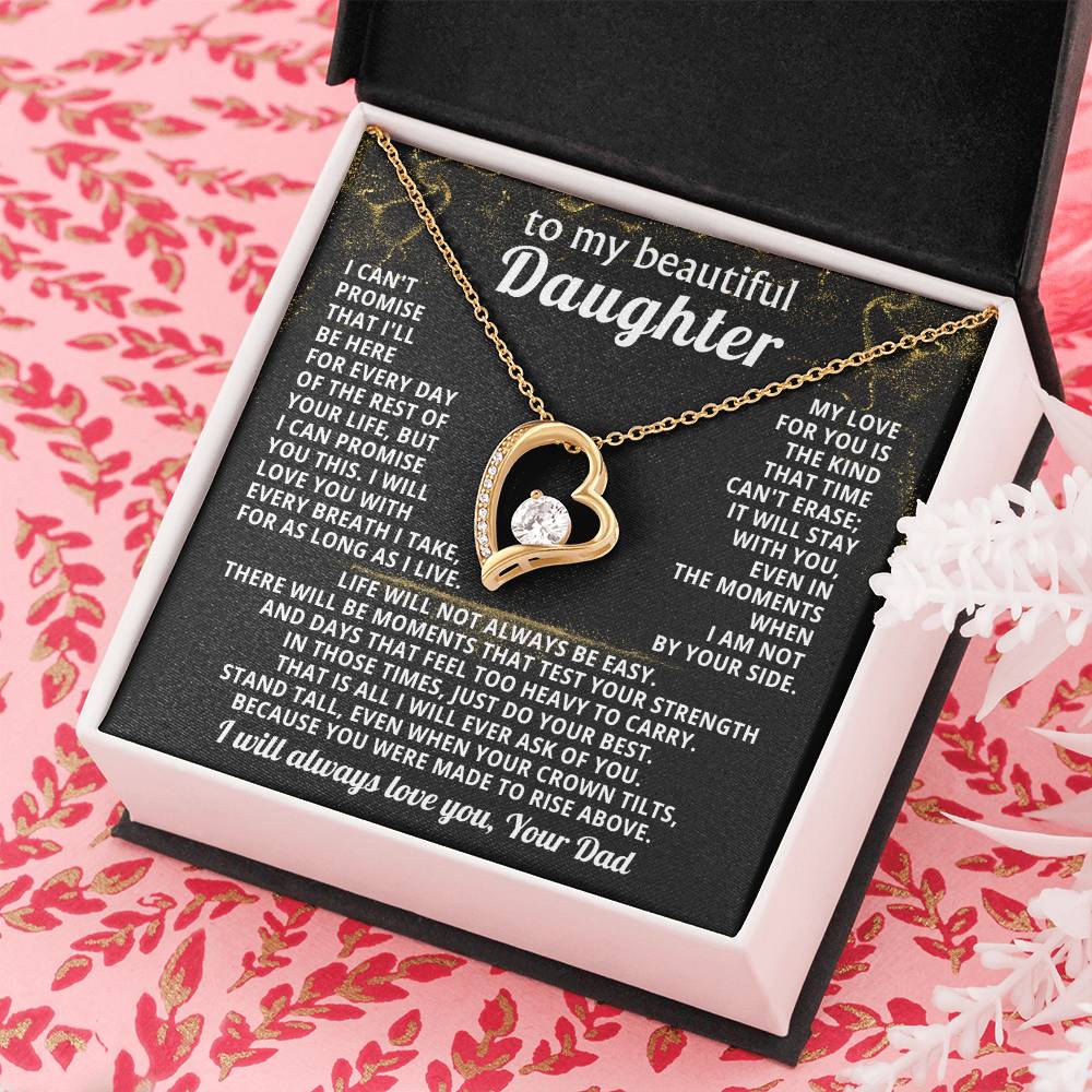Quote On Card: TO MY BEAUTIFUL DAUGHTER, I can't promise that I'll be here for every day of the rest of your life, but I can promiseyou this. I will love you with every breath I take, for as long as I live. My love for you isthe kind that time can't erase; it will stay with you, even in the moments when I am not by your side.Life will not always be easy. There will be moments that test your strength and days that feel too heavy to carry. In those times, just do your best. That is all I will ever ask of you. Stand tall, even when your crown tilts, because you were made to rise above. I will always love you, Your Dad