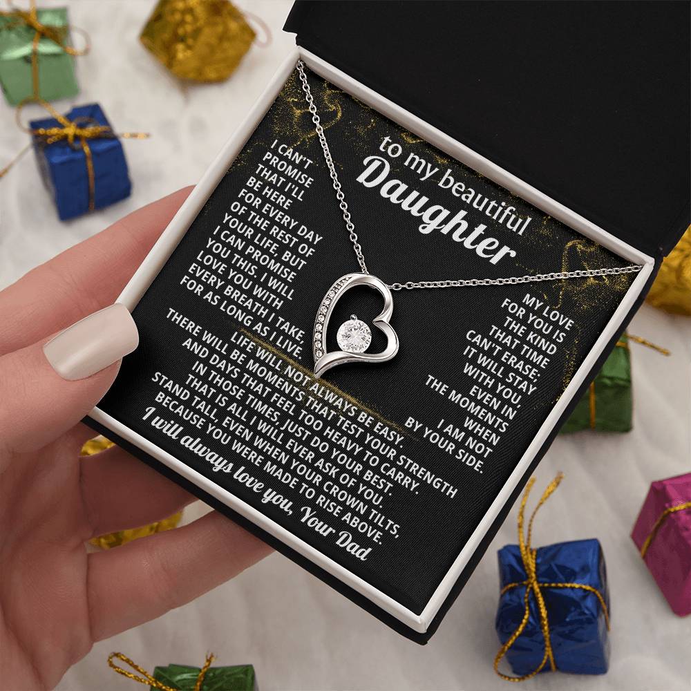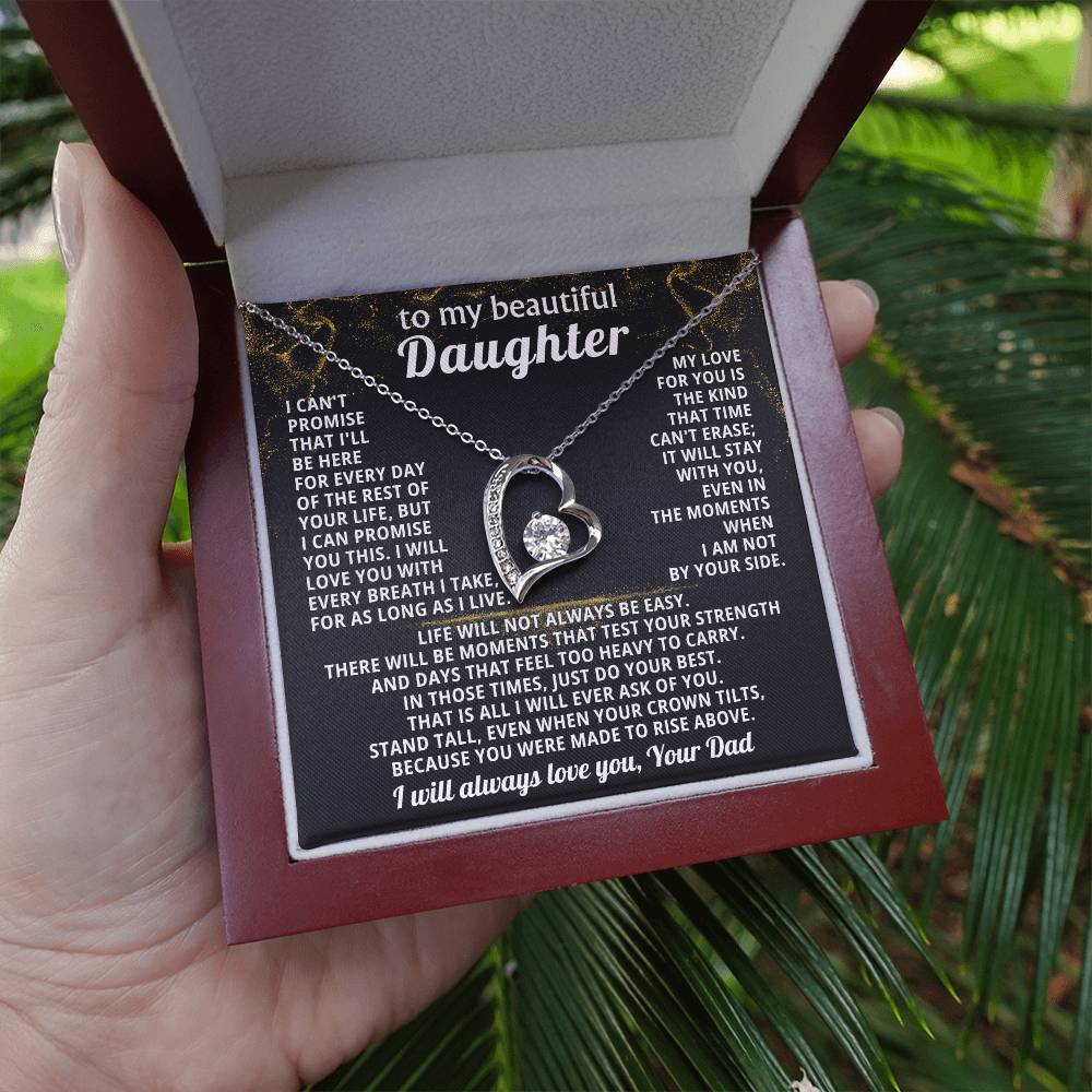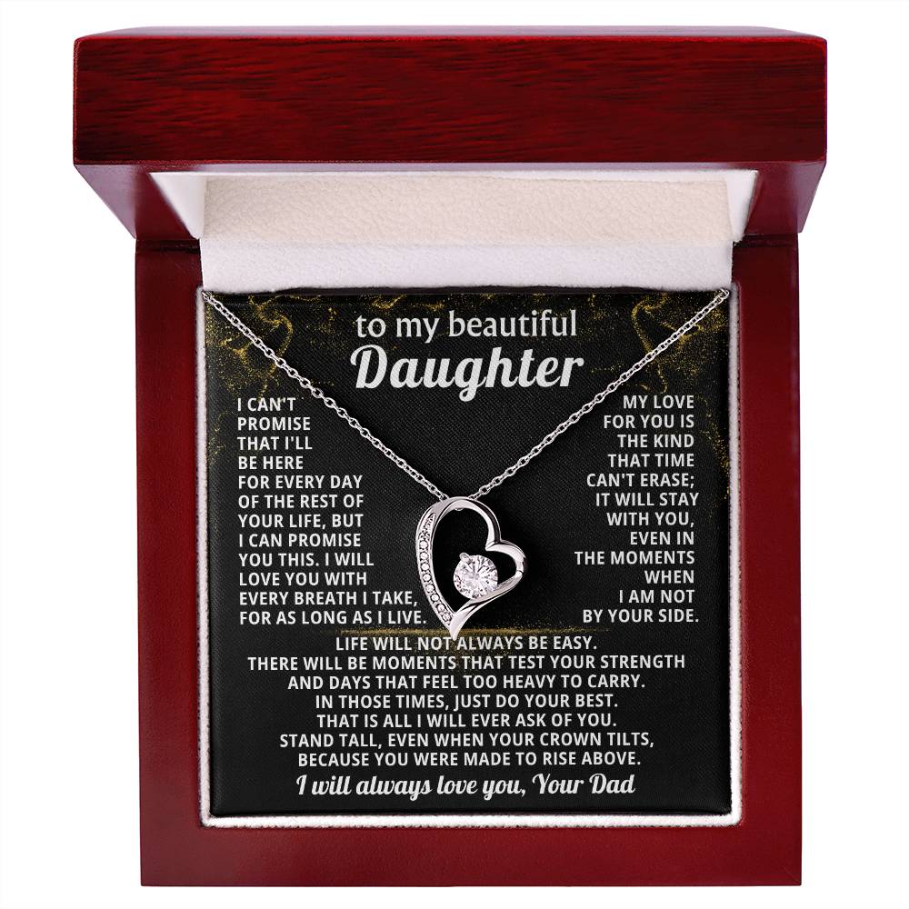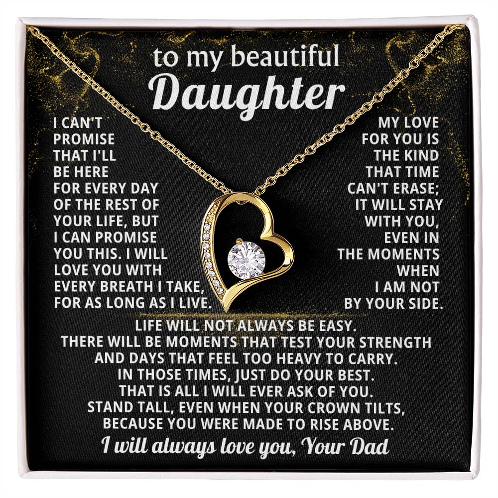 Quote On Card: TO MY BEAUTIFUL DAUGHTER, I can't promise that I'll be here for every day of the rest of your life, but I can promiseyou this. I will love you with every breath I take, for as long as I live. My love for you isthe kind that time can't erase; it will stay with you, even in the moments when I am not by your side.Life will not always be easy. There will be moments that test your strength and days that feel too heavy to carry. In those times, just do your best. That is all I will ever ask of you. Stand tall, even when your crown tilts, because you were made to rise above. I will always love you, Your Dad
