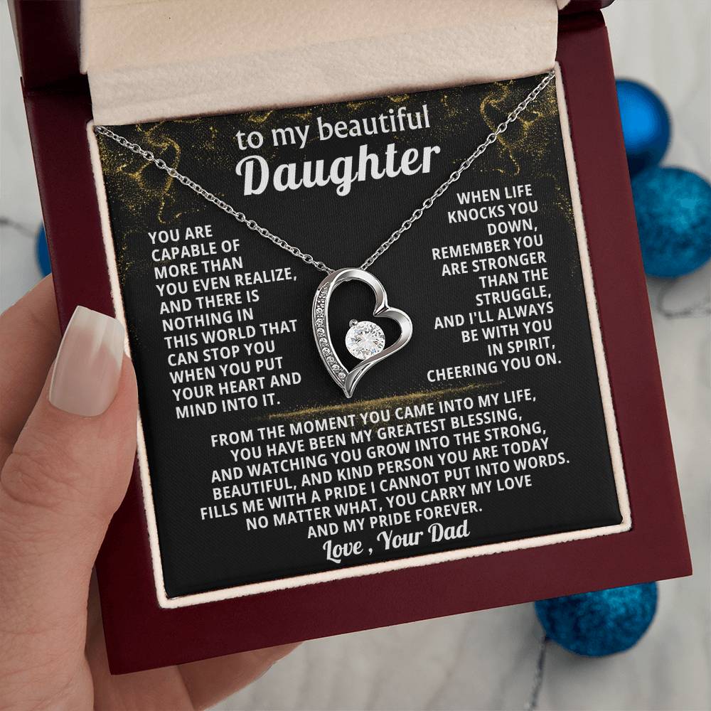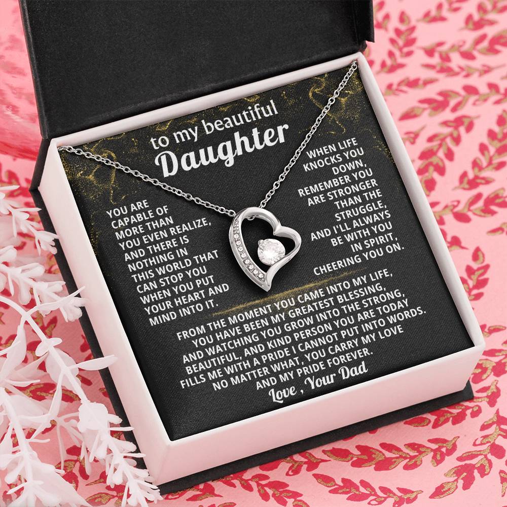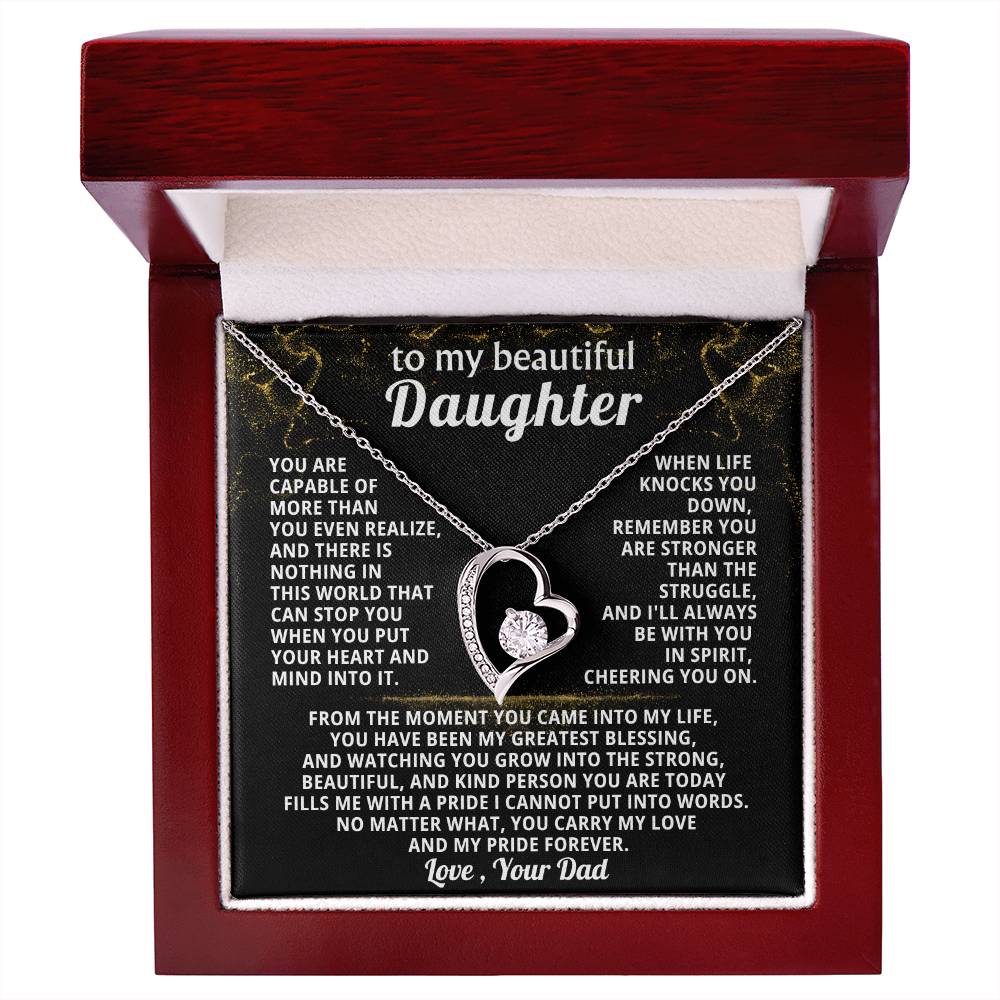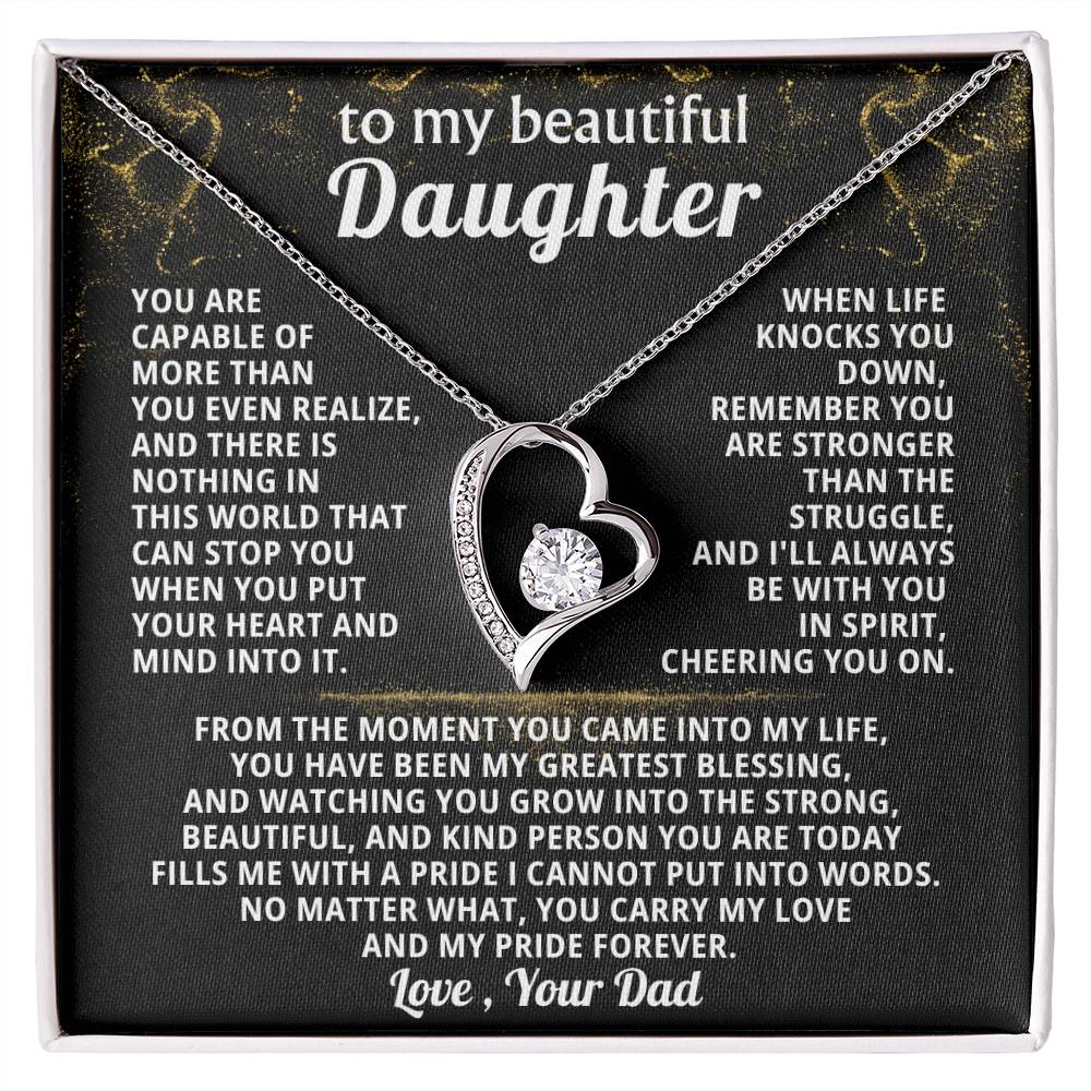 Quote On Card: TO MY BEAUTIFUL DAUGHTER, You are capable of more than you even realize, there is nothing in this world that can stop you when you put your heart and mind into it. When life knocks you down, remember you are stronger than the struggle,and I'll always be with you in spirit, cheering you on. From the moment you came into my life, you have been my greatest blessing, and watching you grow into the strong, beautiful, and kind person you are today fills me with a pride I cannot put into words.No matter what, you carry my love and my pride forever. Love , Your Dad