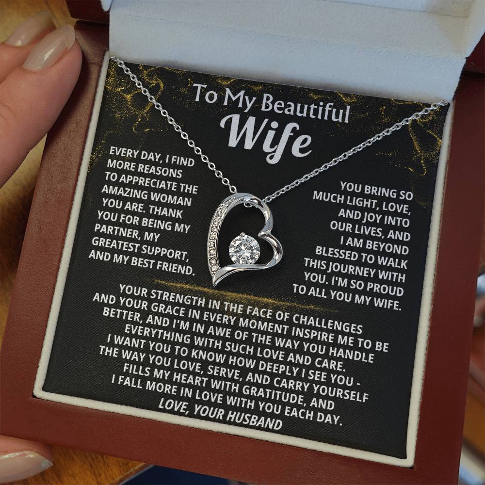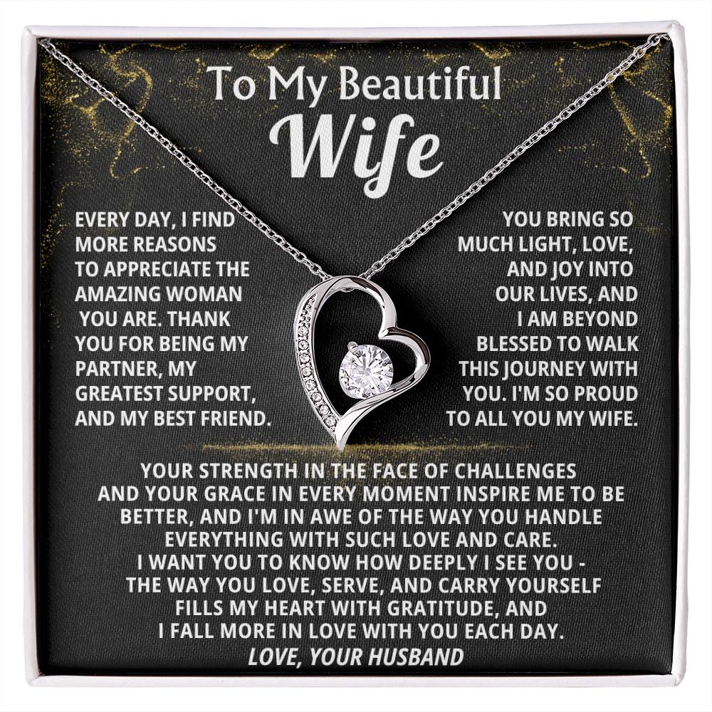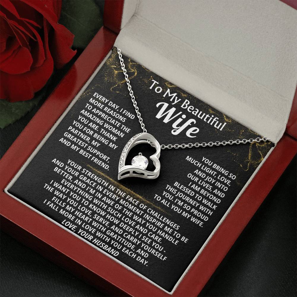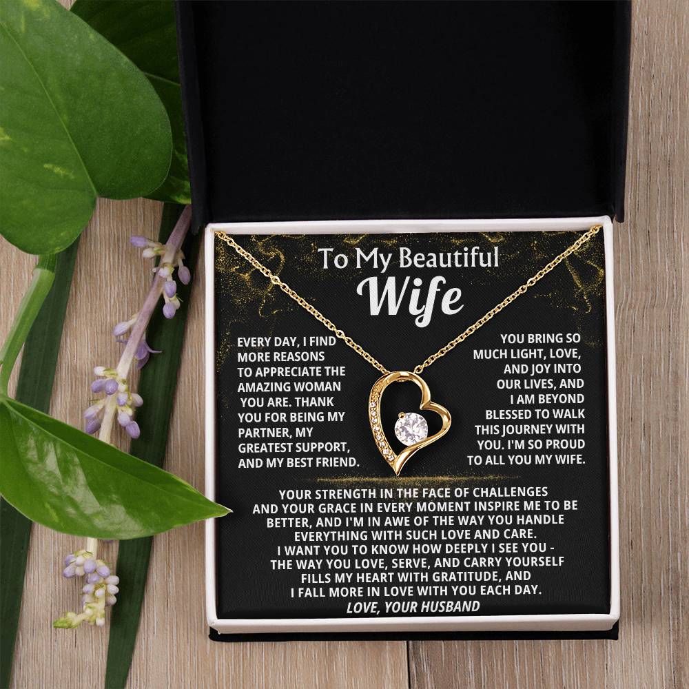 Quote On Card: To My Beautiful Wife, Every day, I find more reasons to appreciate the amazing woman you are. Thank you for being my partner, my greatest support, and my best friend, You bring so much light, love, and joy into our lives, and I am beyond blessed to walk this journey with you. I'm so proud to all you my wife.Your strength in the face of challenges and your grace in every moment inspire me to be better, and I'm in awe of the way you handle everything with such love and care. I want you to know how deeply I see you - The way you love, serve, and carry yourself fills my heart with gratitude, and I fall more in love with you each day.Love, Your Husband