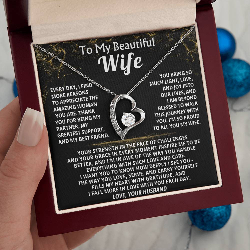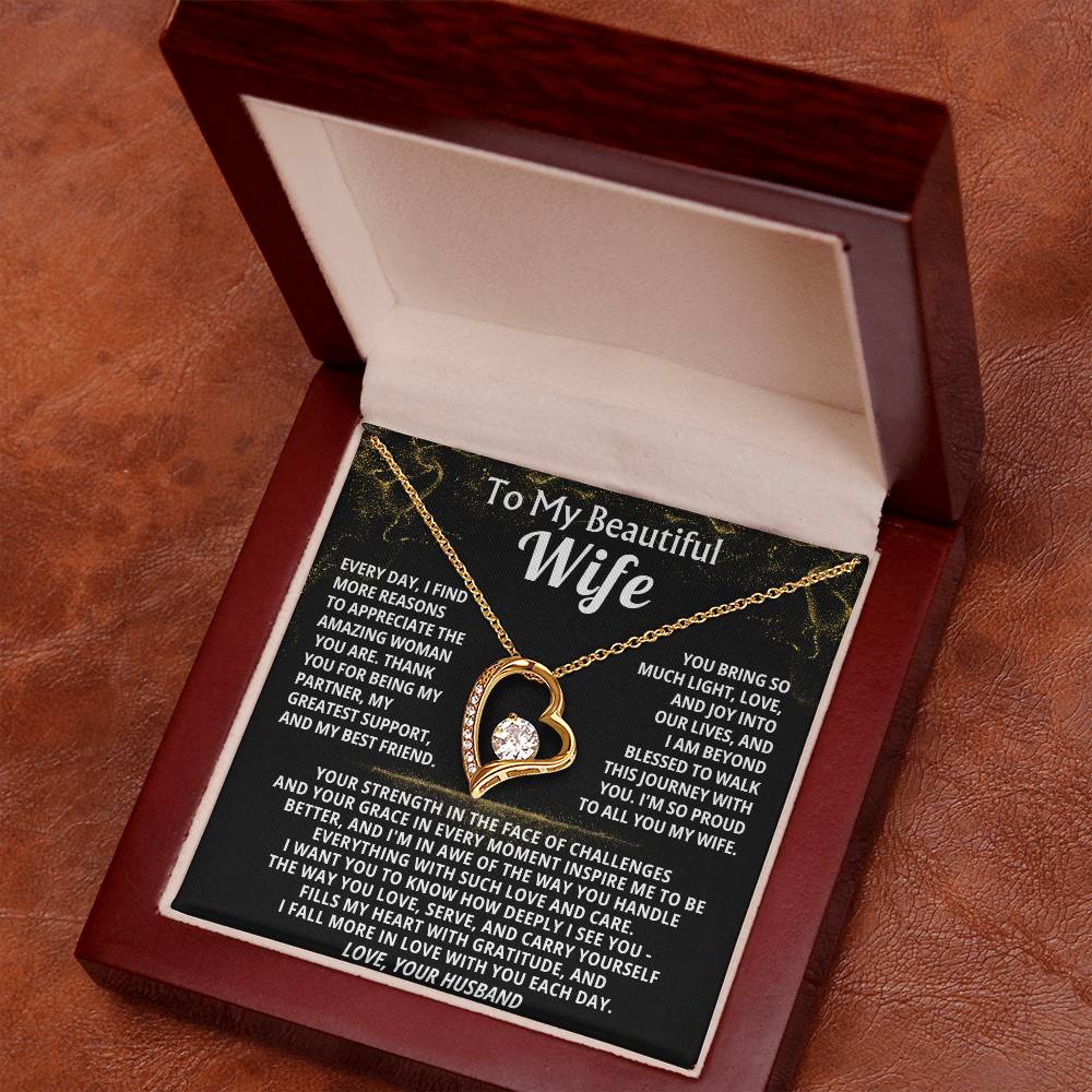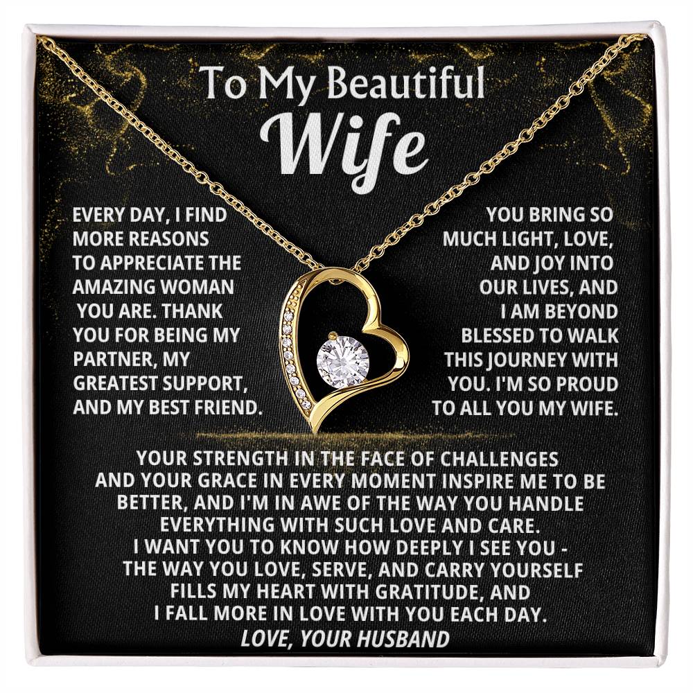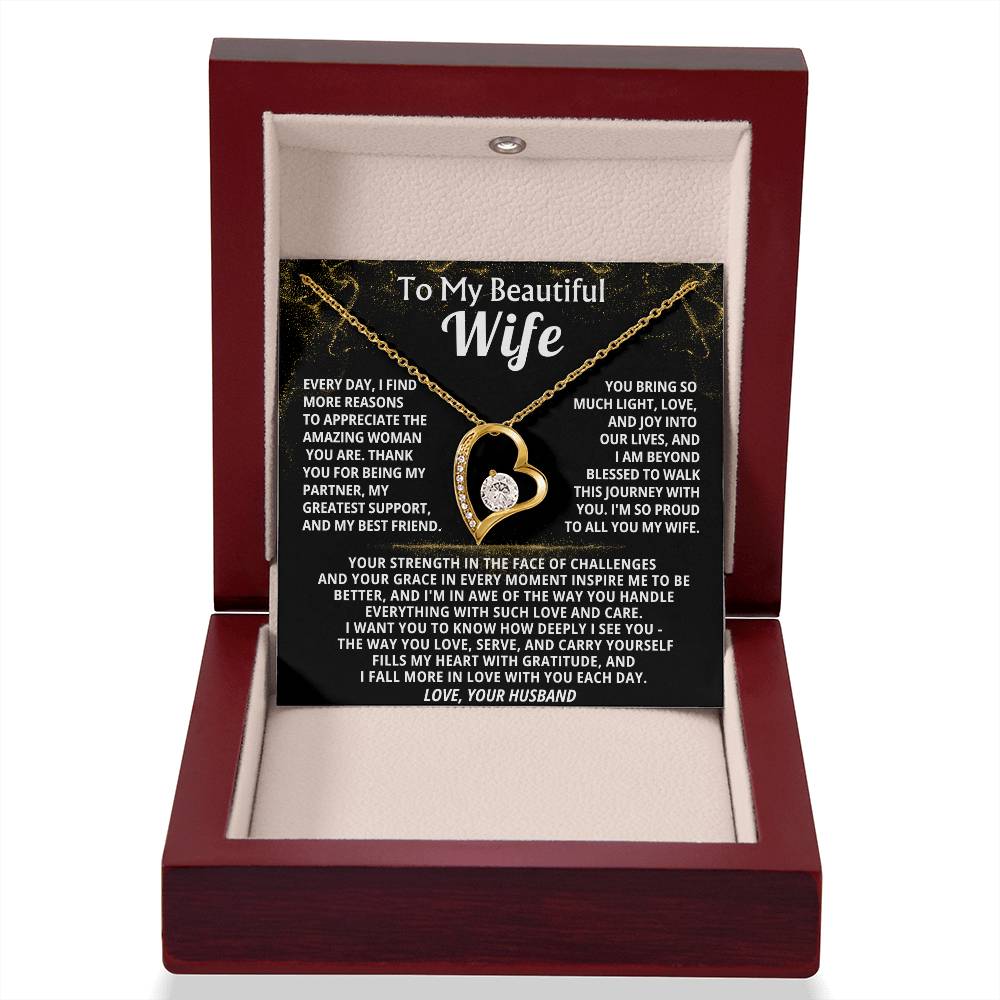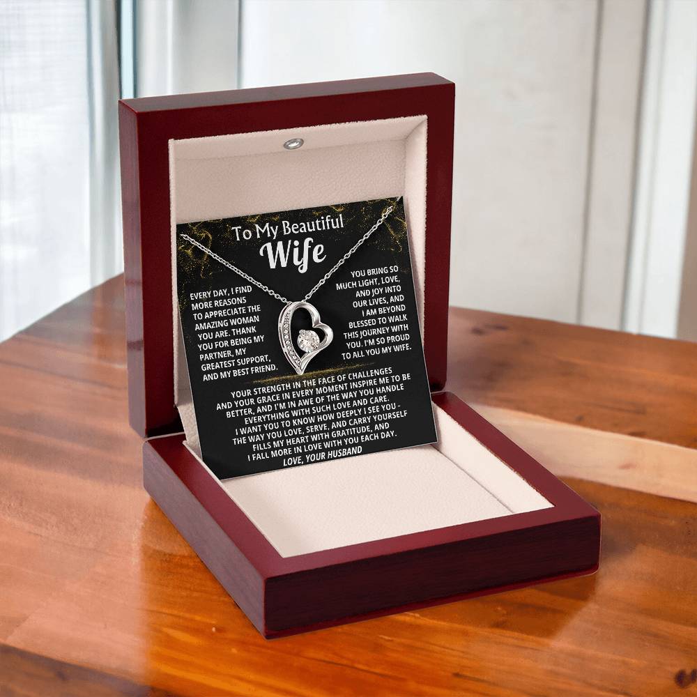 Quote On Card: To My Beautiful Wife, Every day, I find more reasons to appreciate the amazing woman you are. Thank you for being my partner, my greatest support, and my best friend, You bring so much light, love, and joy into our lives, and I am beyond blessed to walk this journey with you. I'm so proud to all you my wife.Your strength in the face of challenges and your grace in every moment inspire me to be better, and I'm in awe of the way you handle everything with such love and care. I want you to know how deeply I see you - The way you love, serve, and carry yourself fills my heart with gratitude, and I fall more in love with you each day.Love, Your Husband