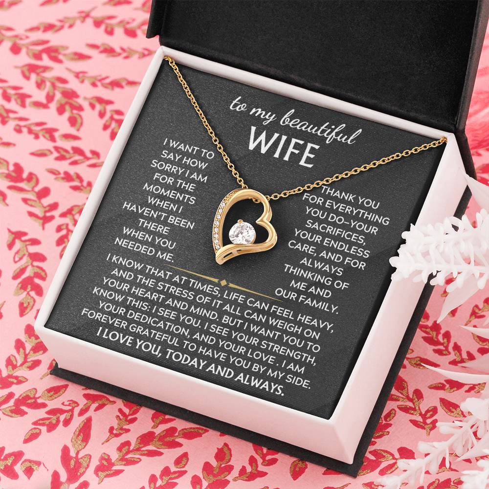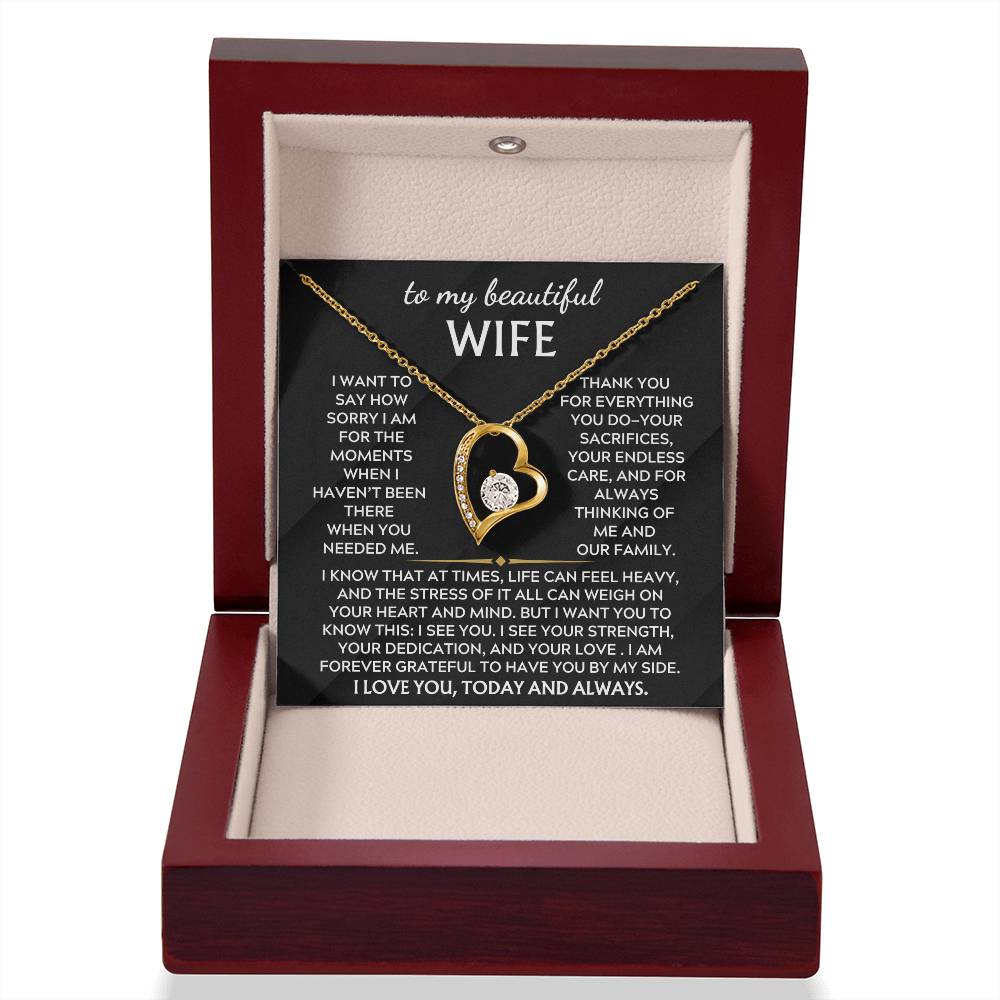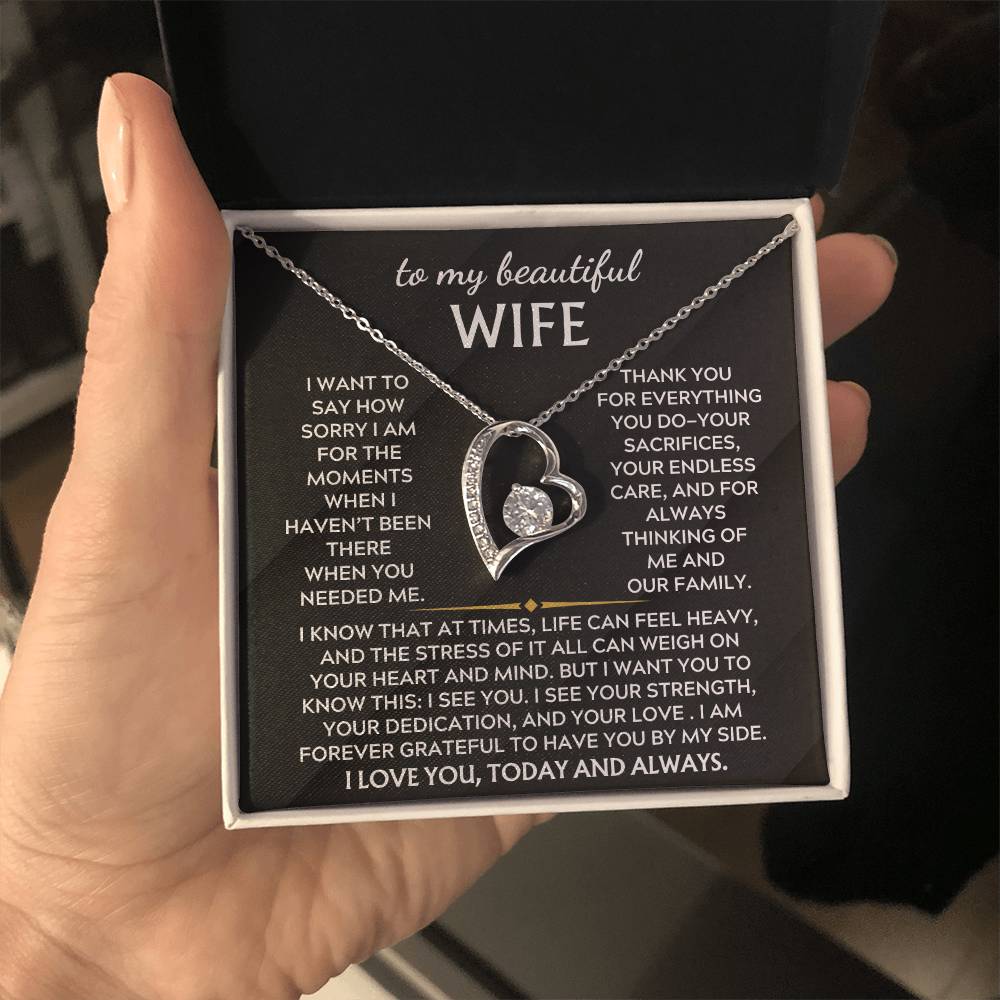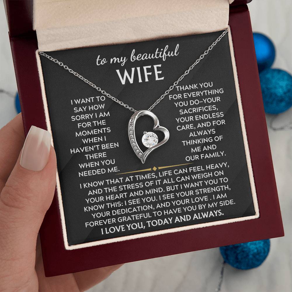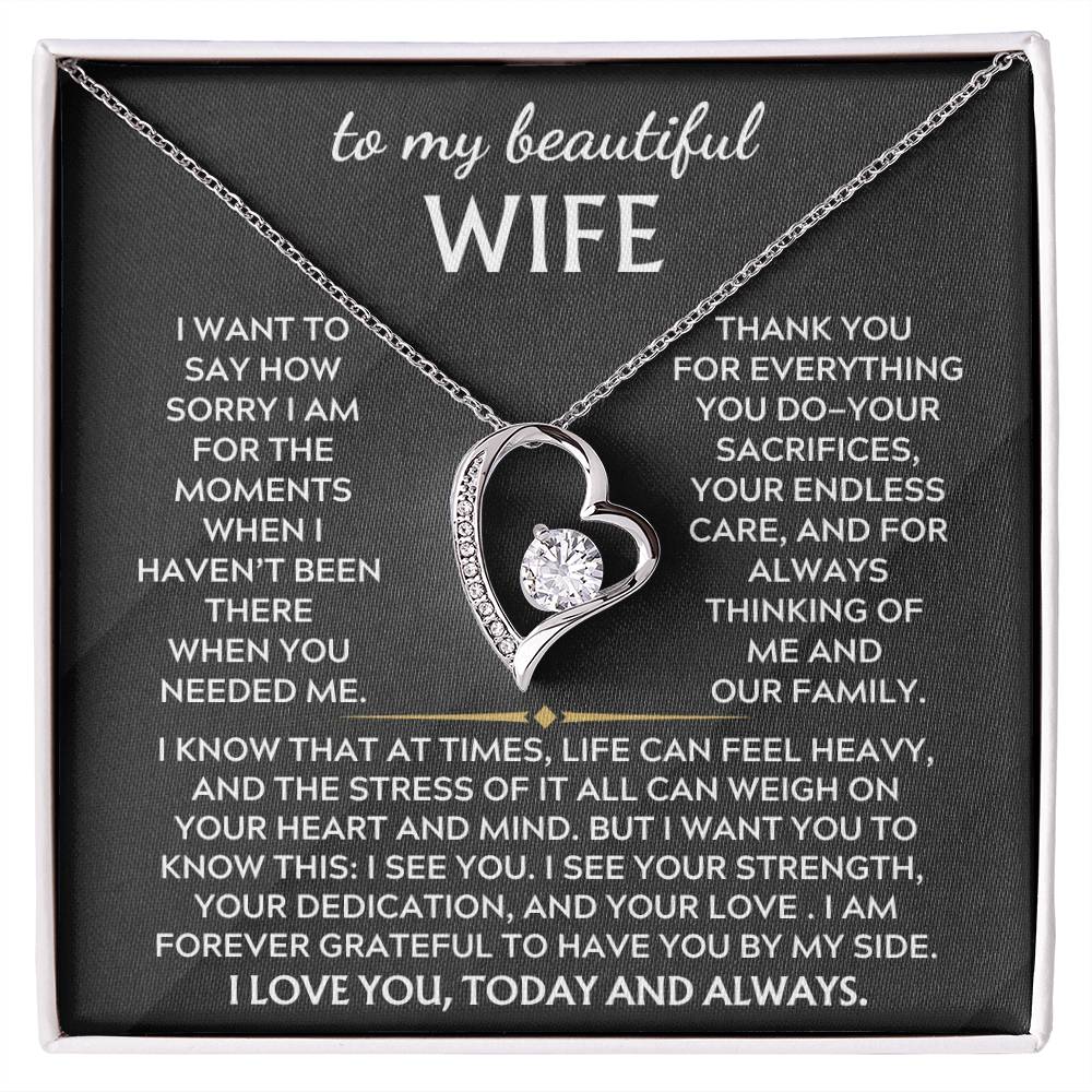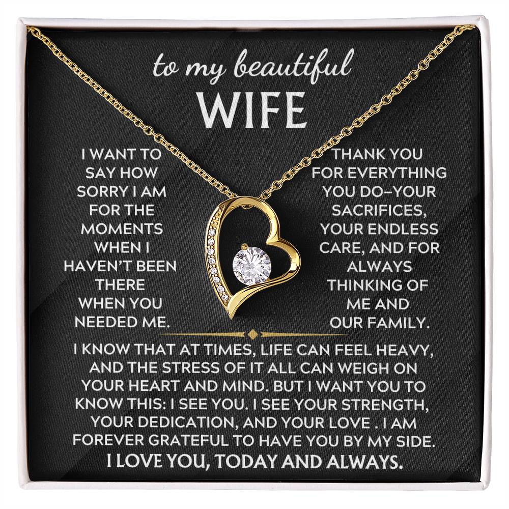 Quote On Card: To My Beautiful Wife, I want to say how sorry I am for the moments when haven’t been there in the way you needed. Thank you for everything you do—your sacrifices, your endless care, and for always thinking of me and our family. I know that at times, life can feel heavy, and the stress of it all can weigh on your heart and mind. But I want you to know this: I see you. I see your strength, your dedication, and your love . I am forever grateful to have you by my side. I love you, today and always.
