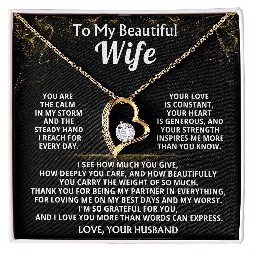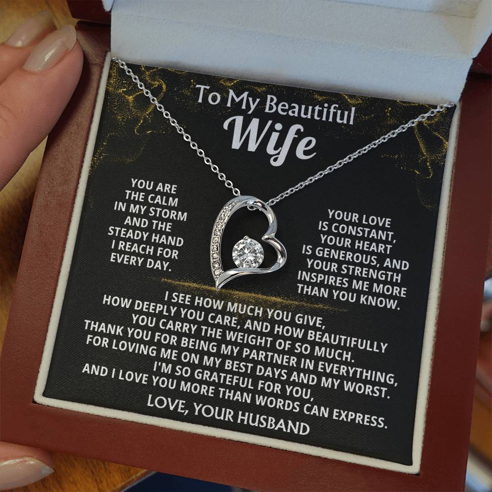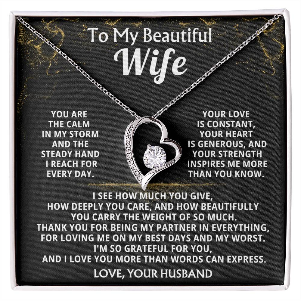 Quote On Card: To My Beautiful Wife,You are the calm in my storm and the steady hand I reach for every day. Your love is constant, your heart is generous, and your strength inspires me more than you know. I see how much you give, how deeply you care, and how beautifully you carry the weight of so much. Thank you for being my partner in everything, for loving me on my best days and my worst. I'm so grateful for you, and I love you more than words can express.