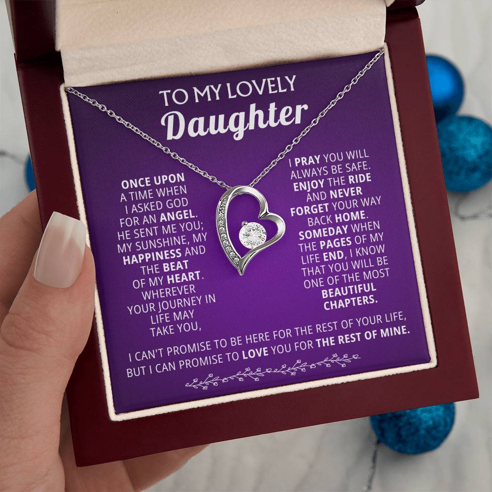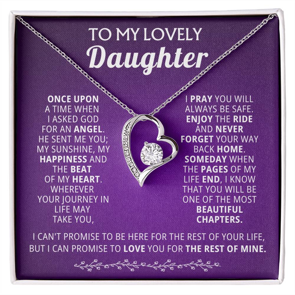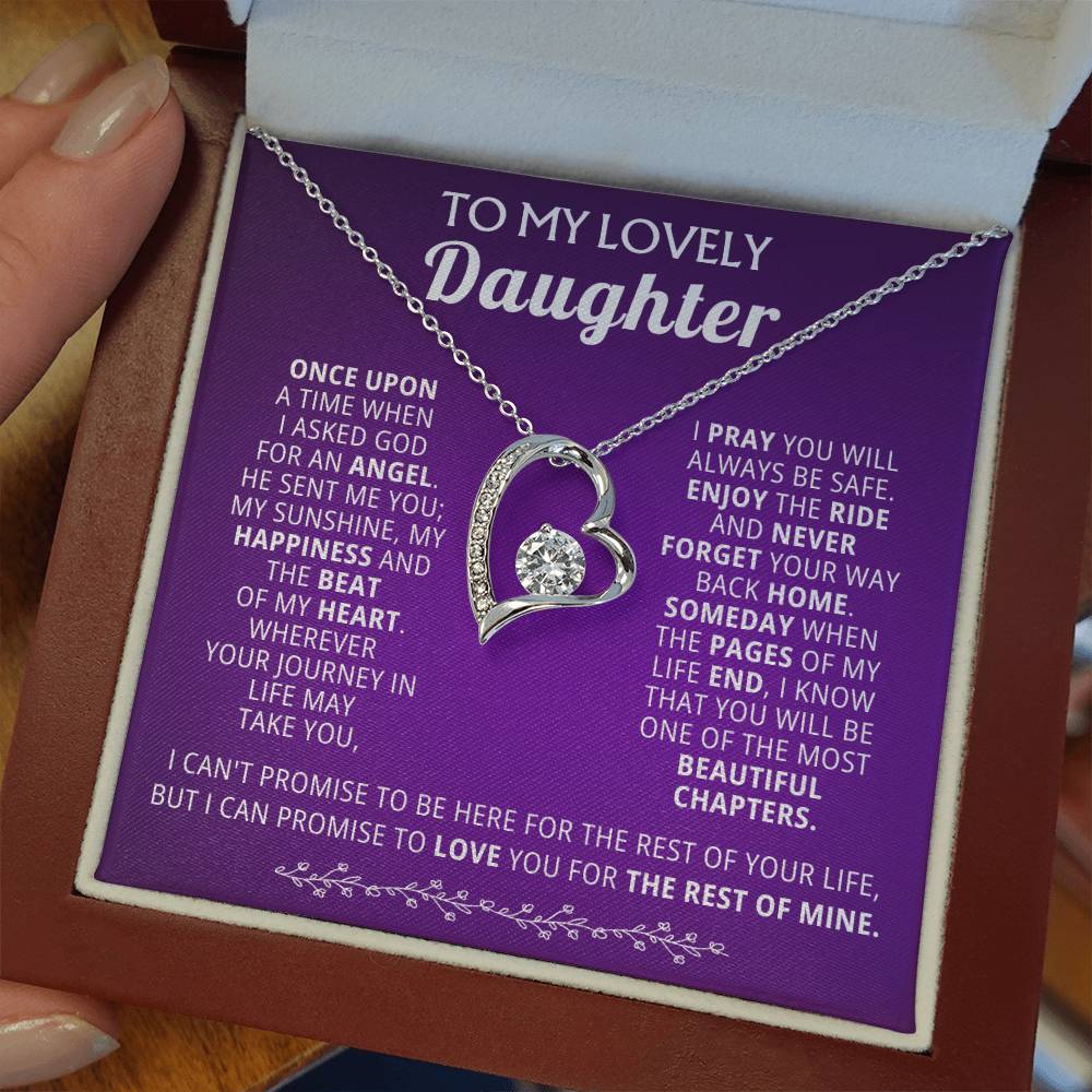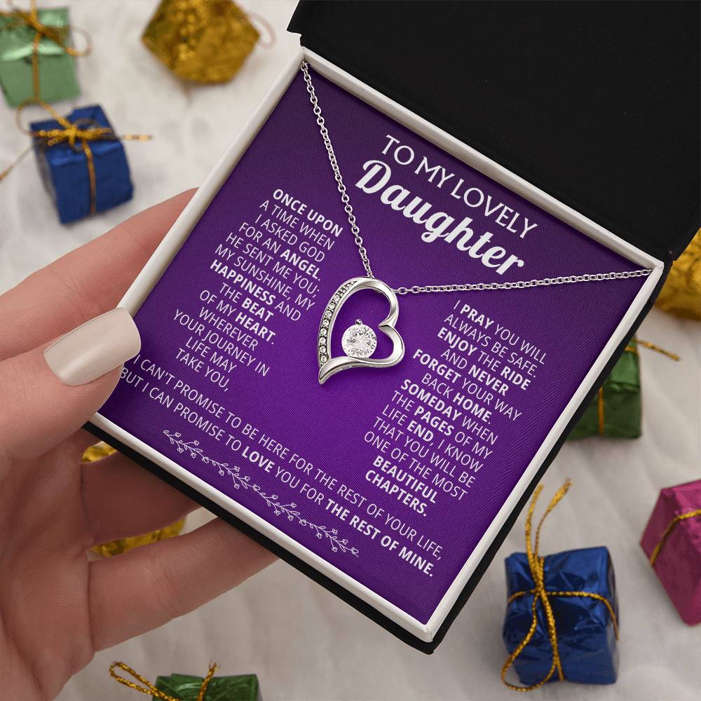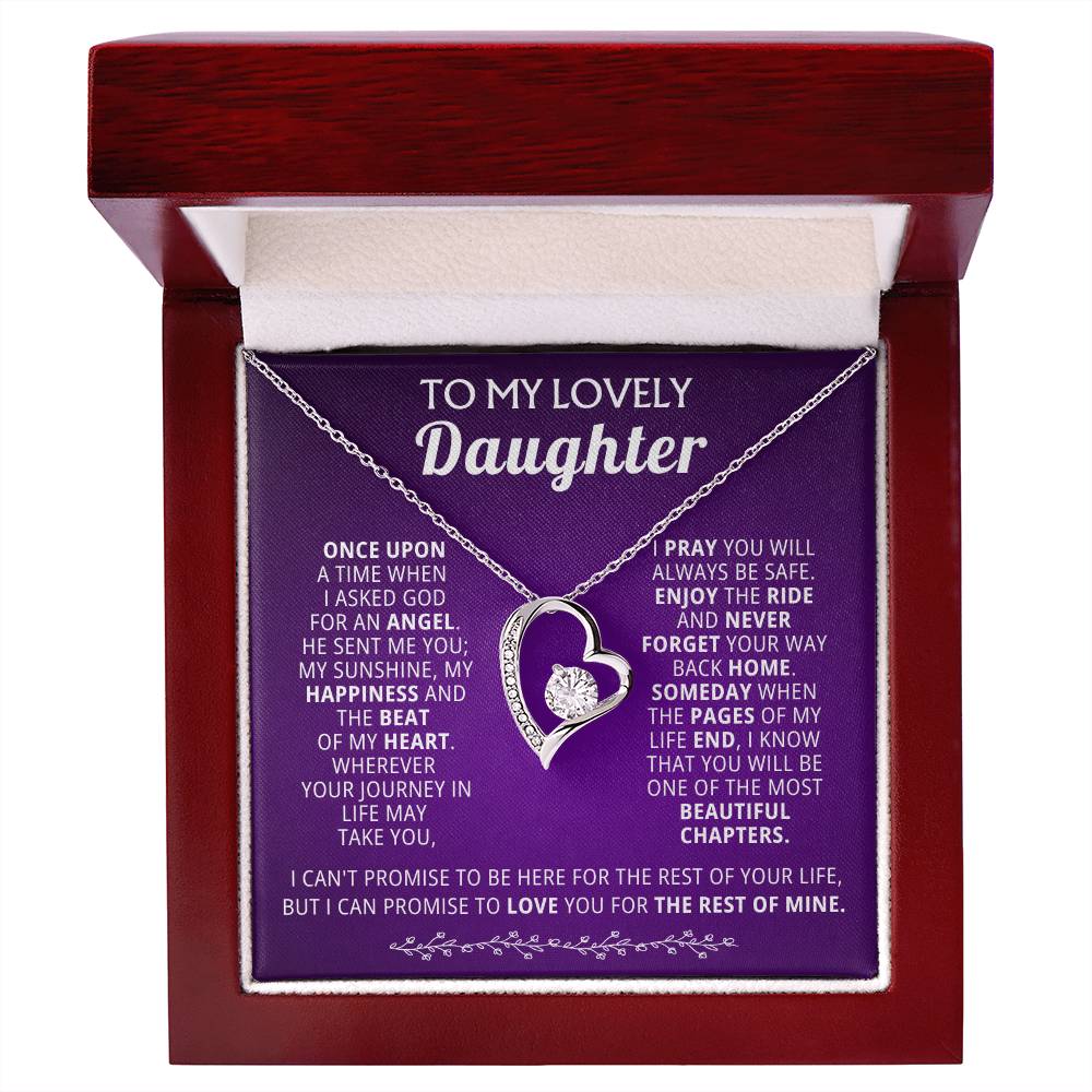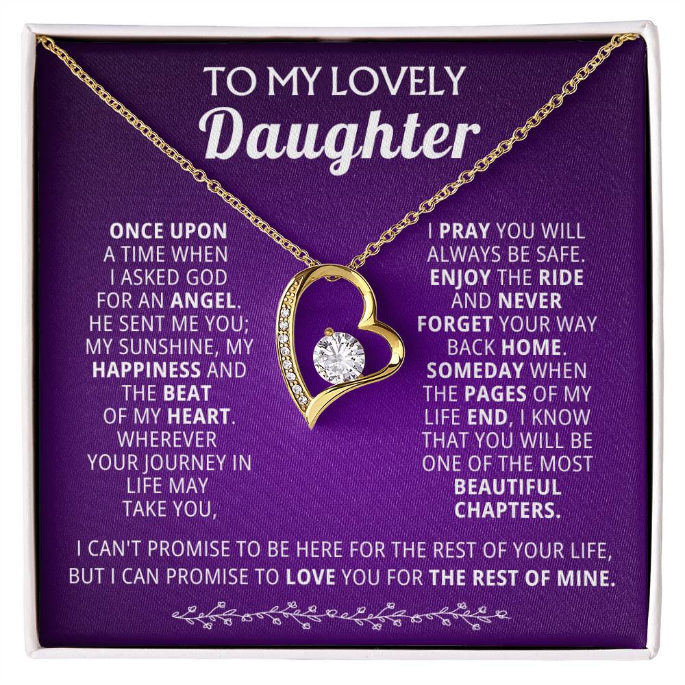 Quote On Card: TO MY LOVELY DAUGHTER, ONCE UPON A TIME WHEN I ASKED GOD FOR AN ANGEL. HE SENT ME YOU; MY SUNSHINE, MY HAPPINESS AND THE BEAT OF MY HEART. WHEREVER YOUR JOURNEY IN LIFE MAY TAKE YOU, I PRAY YOU WILL ALWAYS BE SAFE. ENJOY THE RIDE AND NEVER FORGET YOUR WAY BACK HOME. SOMEDAY WHEN THE PAGES OF MY LIFE END, I KNOW THAT YOU WILL BE ONE OF THE MOST BEAUTIFUL CHAPTERS. I CAN'T PROMISE TO BE HERE FOR THE REST OF YOUR LIFE, BUT I CAN PROMISE TO LOVE YOU FOR THE REST OF MINE.