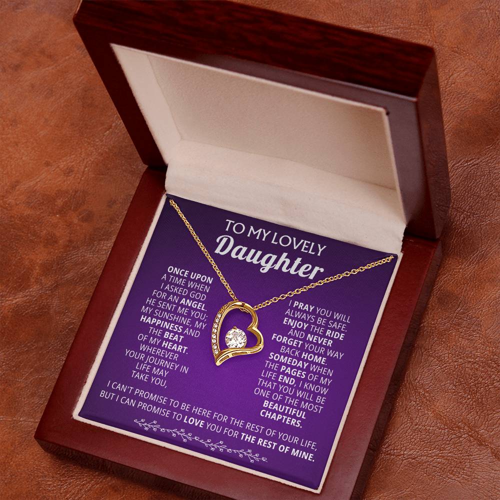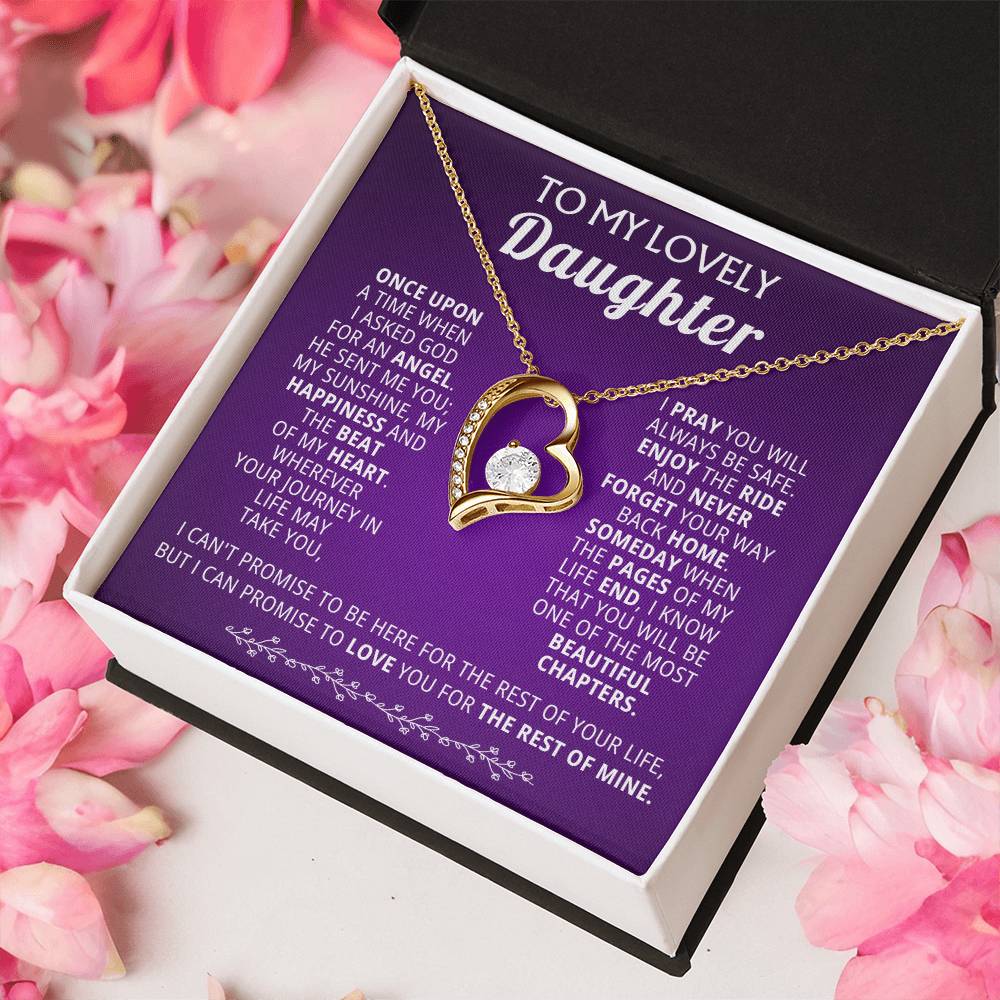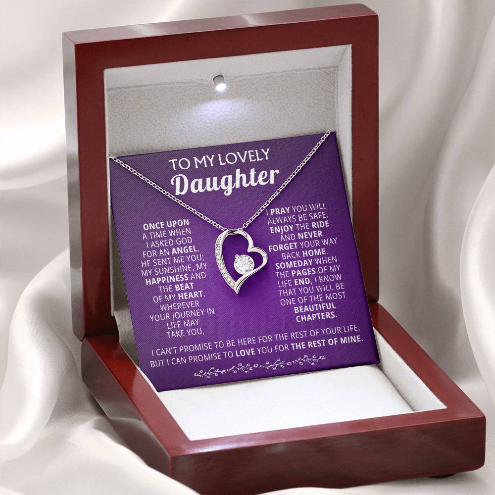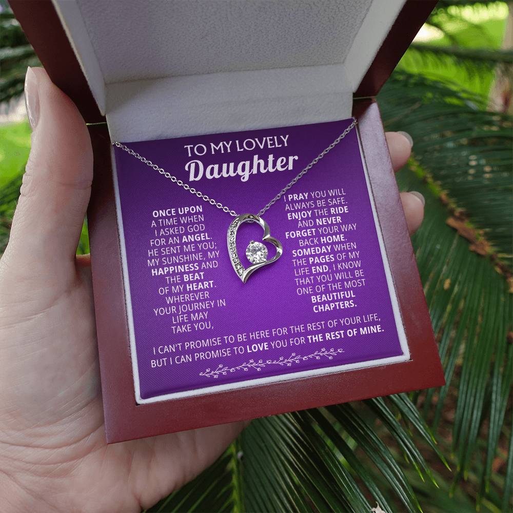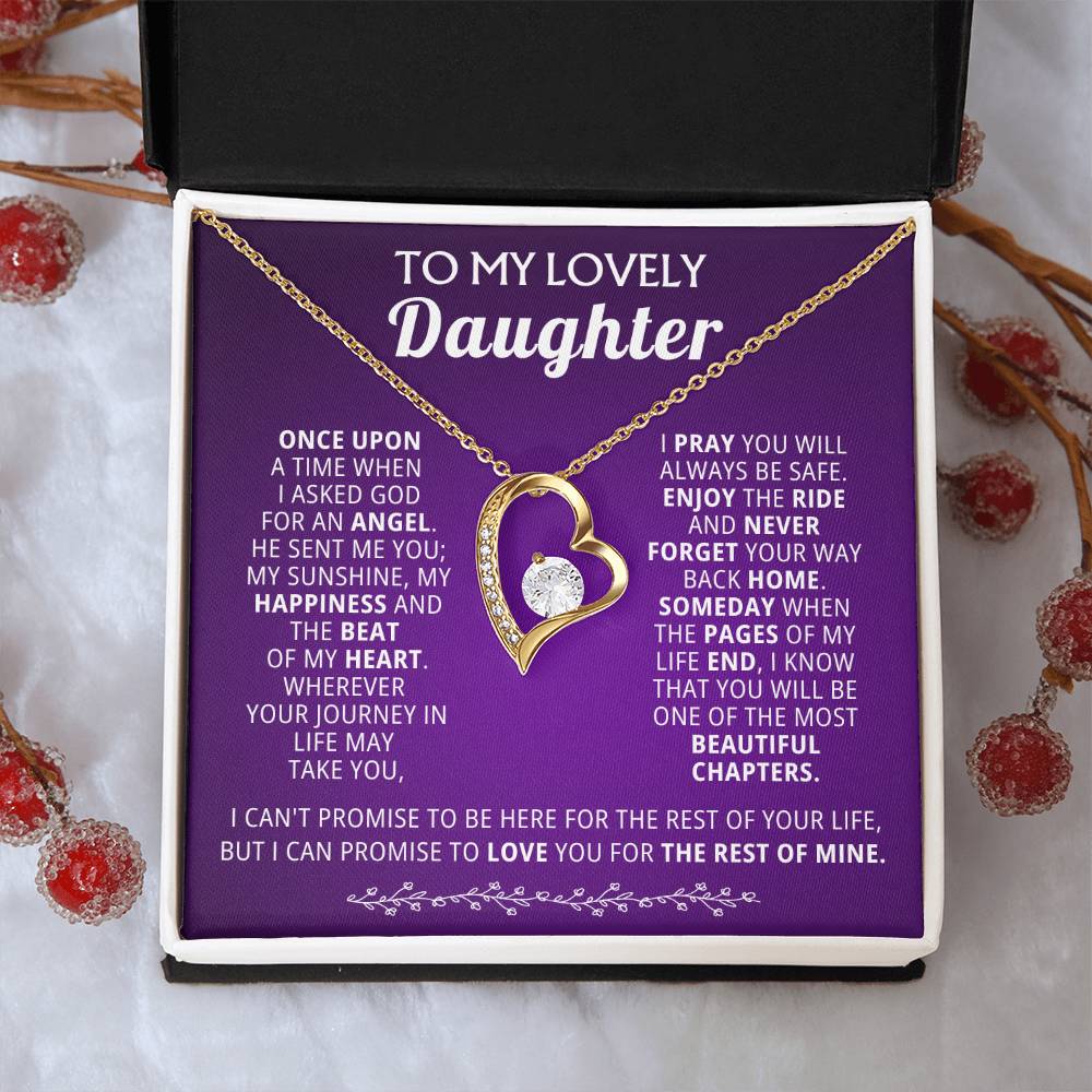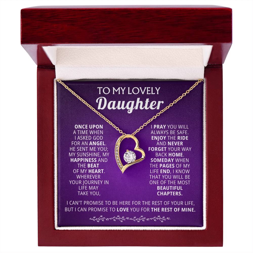 Quote On Card: TO MY LOVELY DAUGHTER, ONCE UPON A TIME WHEN I ASKED GOD FOR AN ANGEL. HE SENT ME YOU; MY SUNSHINE, MY HAPPINESS AND THE BEAT OF MY HEART. WHEREVER YOUR JOURNEY IN LIFE MAY TAKE YOU, I PRAY YOU WILL ALWAYS BE SAFE. ENJOY THE RIDE AND NEVER FORGET YOUR WAY BACK HOME. SOMEDAY WHEN THE PAGES OF MY LIFE END, I KNOW THAT YOU WILL BE ONE OF THE MOST BEAUTIFUL CHAPTERS. I CAN'T PROMISE TO BE HERE FOR THE REST OF YOUR LIFE, BUT I CAN PROMISE TO LOVE YOU FOR THE REST OF MINE.