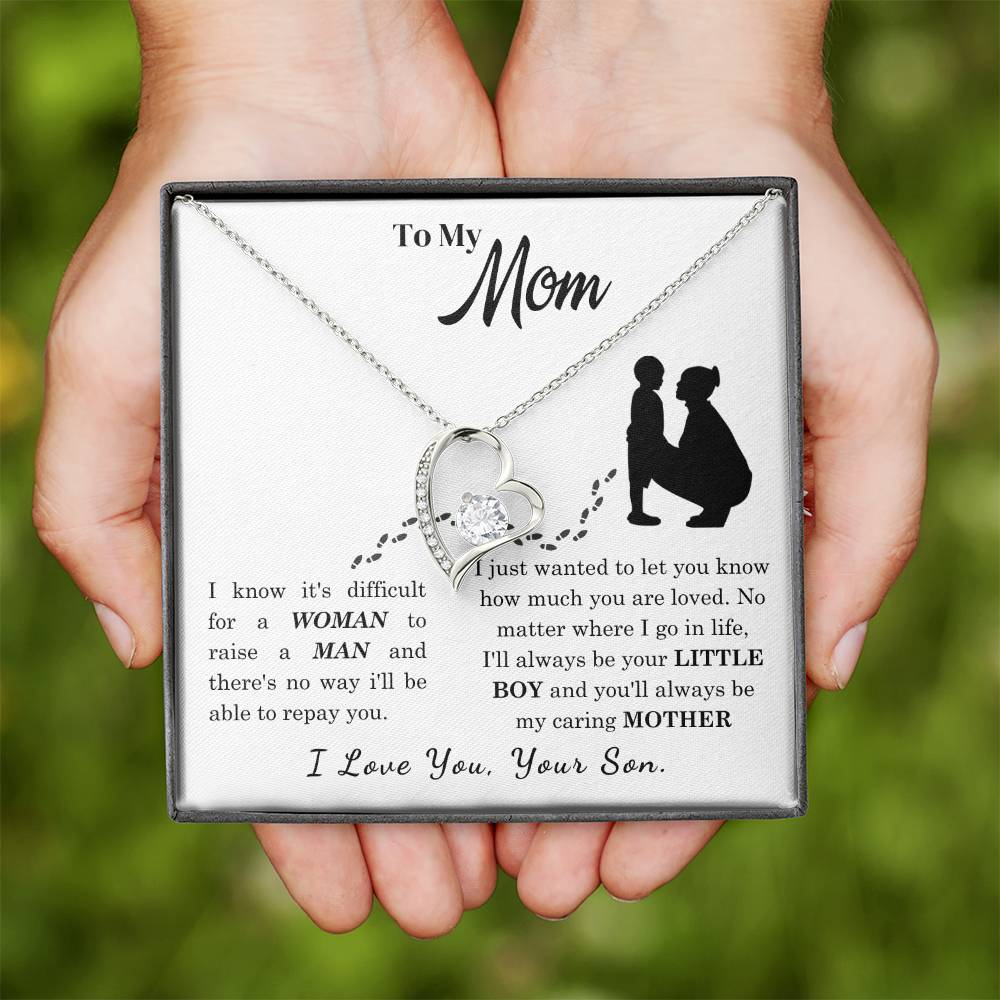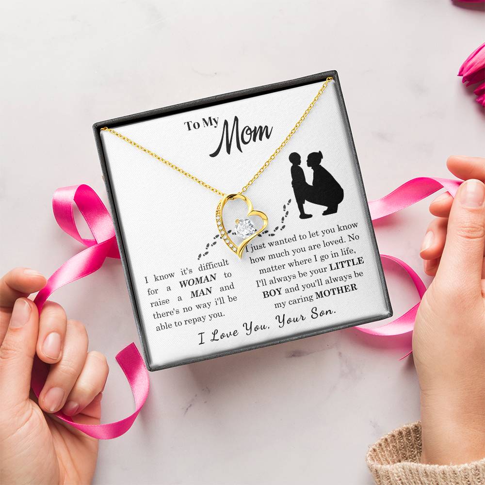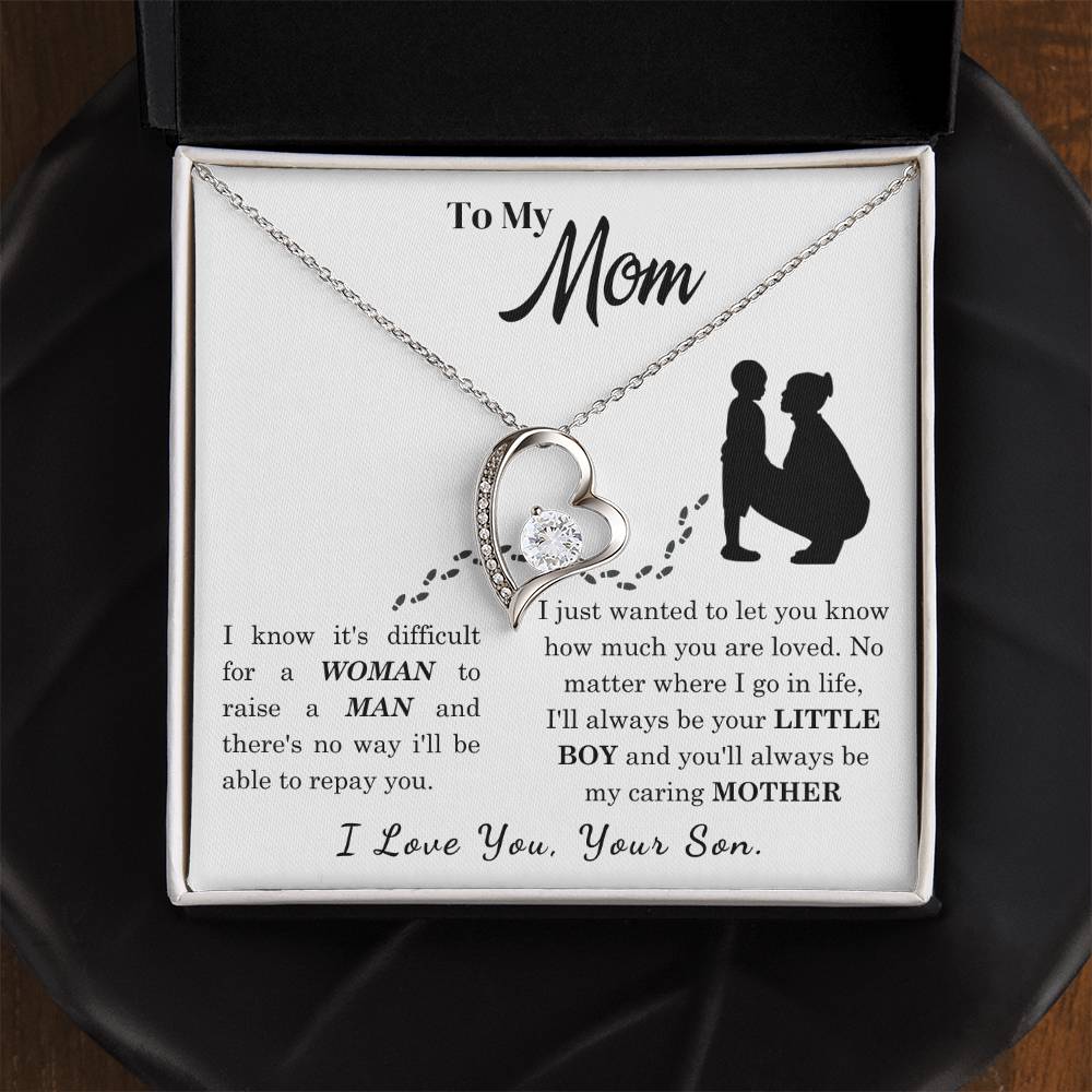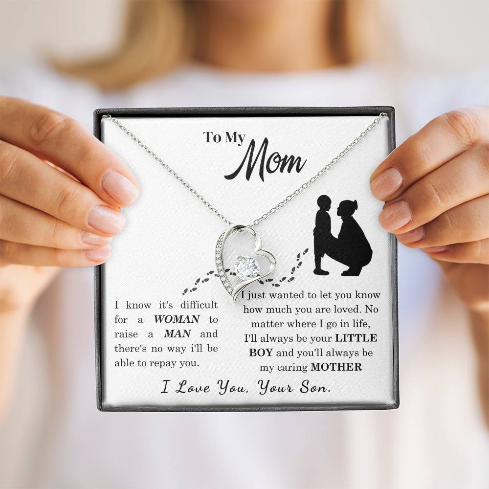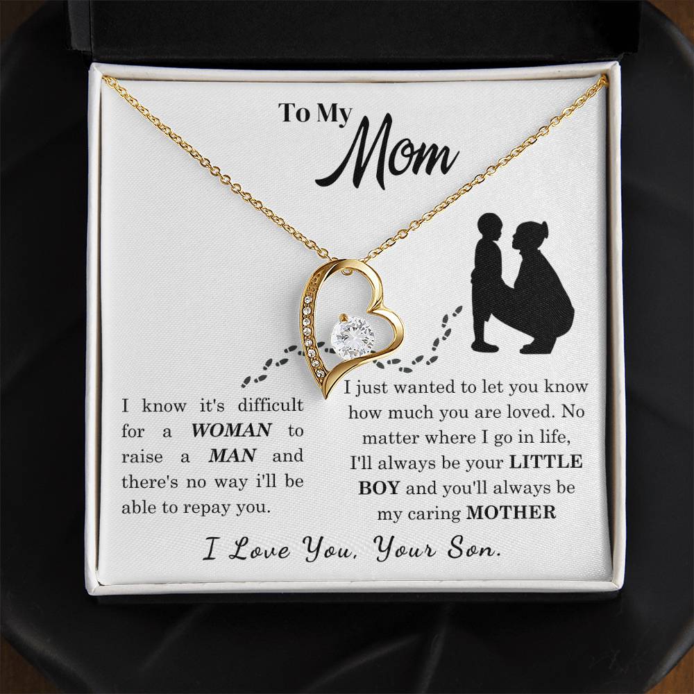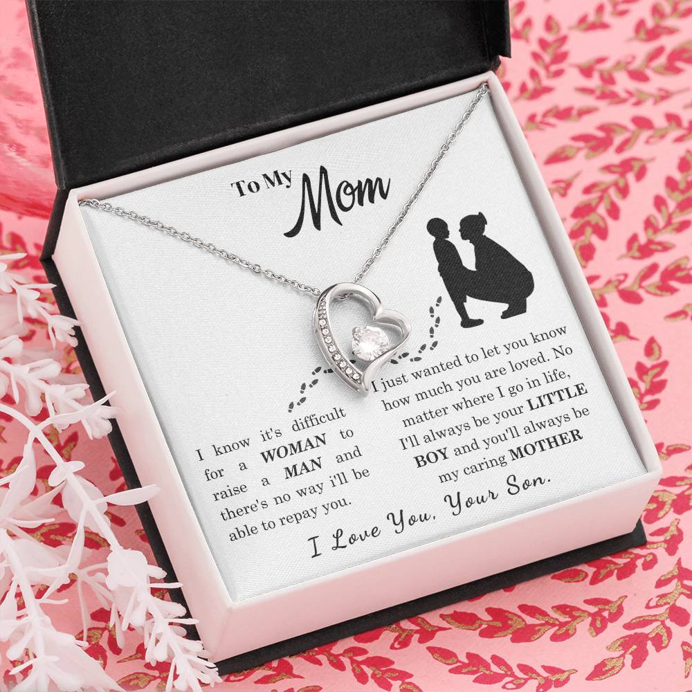 Quote On Card: “I know it's difficult for a WOMAN to raise a MAN and there's no way i'll be able to repay you. I just wanted to let you know how much you are loved. No matter where I go in life, I'll always be your LITTLE BOY and you'll always be my caring MOTHER . I Love You, Your Son.”