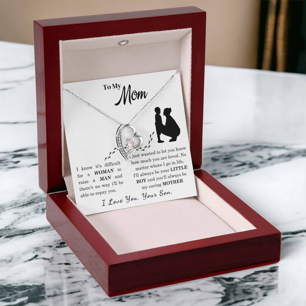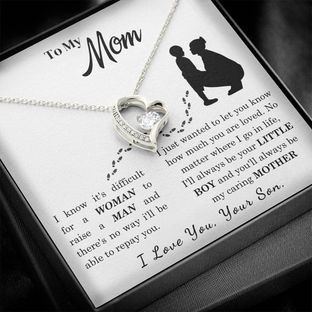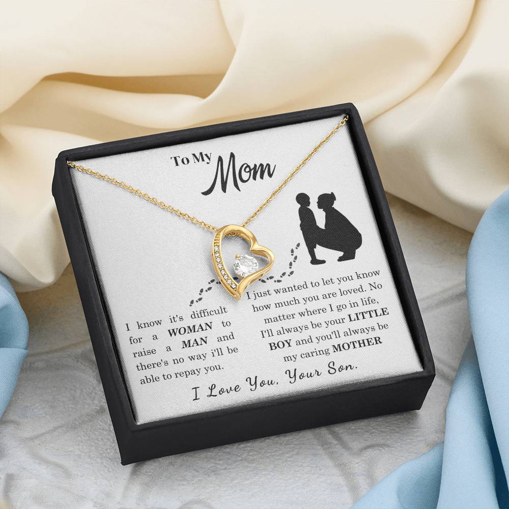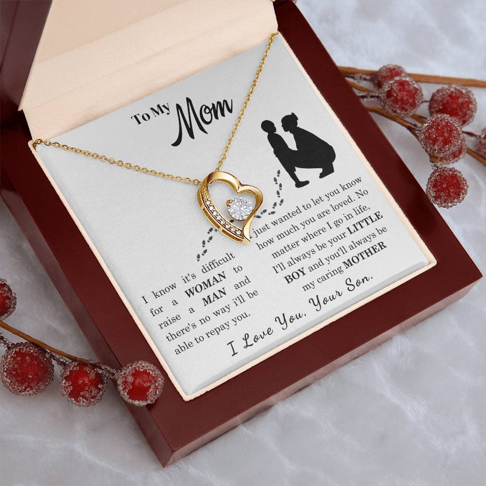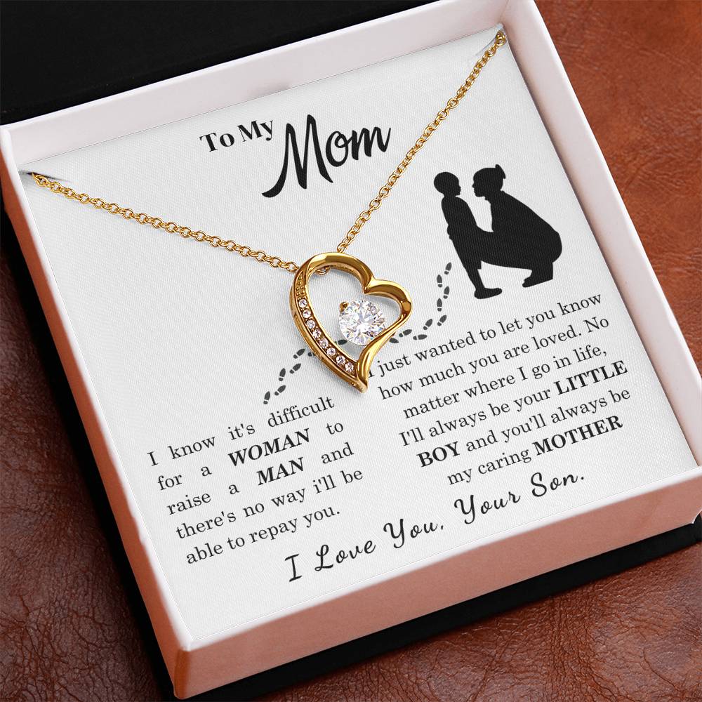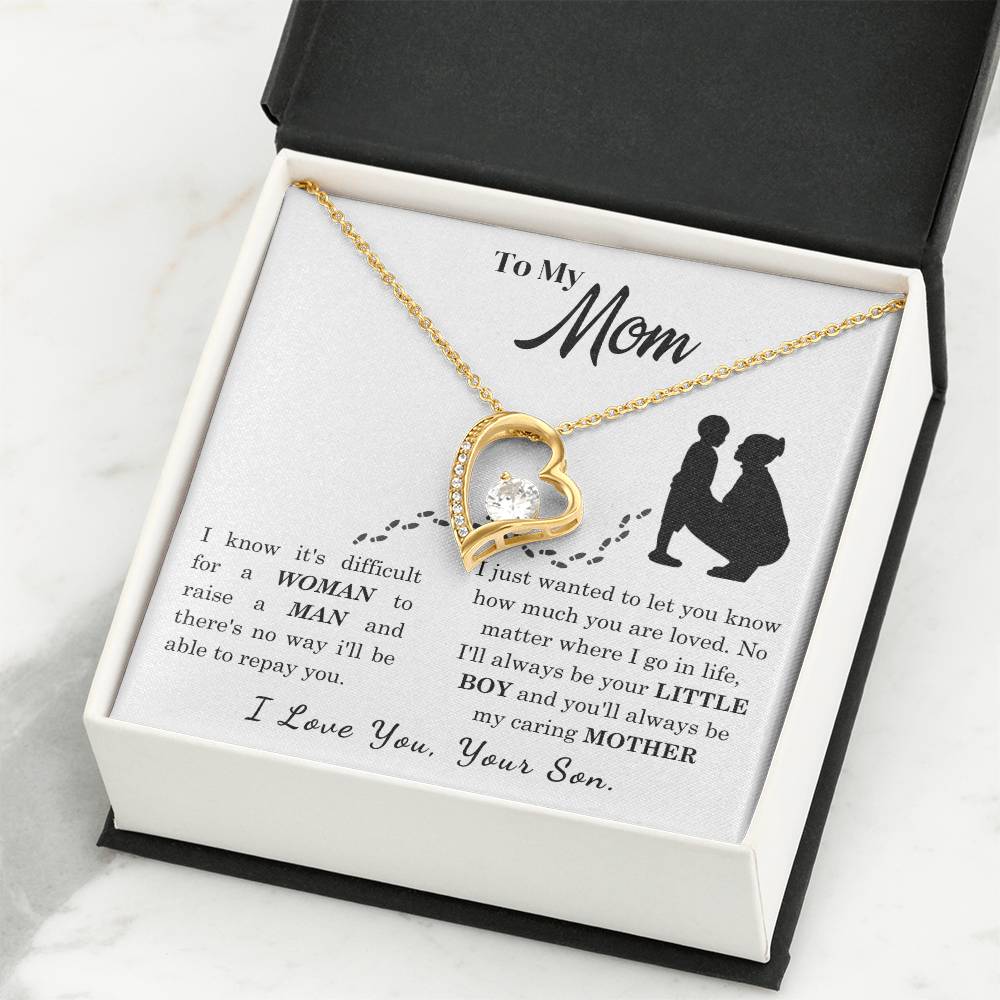 Quote On Card: “I know it's difficult for a WOMAN to raise a MAN and there's no way i'll be able to repay you. I just wanted to let you know how much you are loved. No matter where I go in life, I'll always be your LITTLE BOY and you'll always be my caring MOTHER . I Love You, Your Son.”