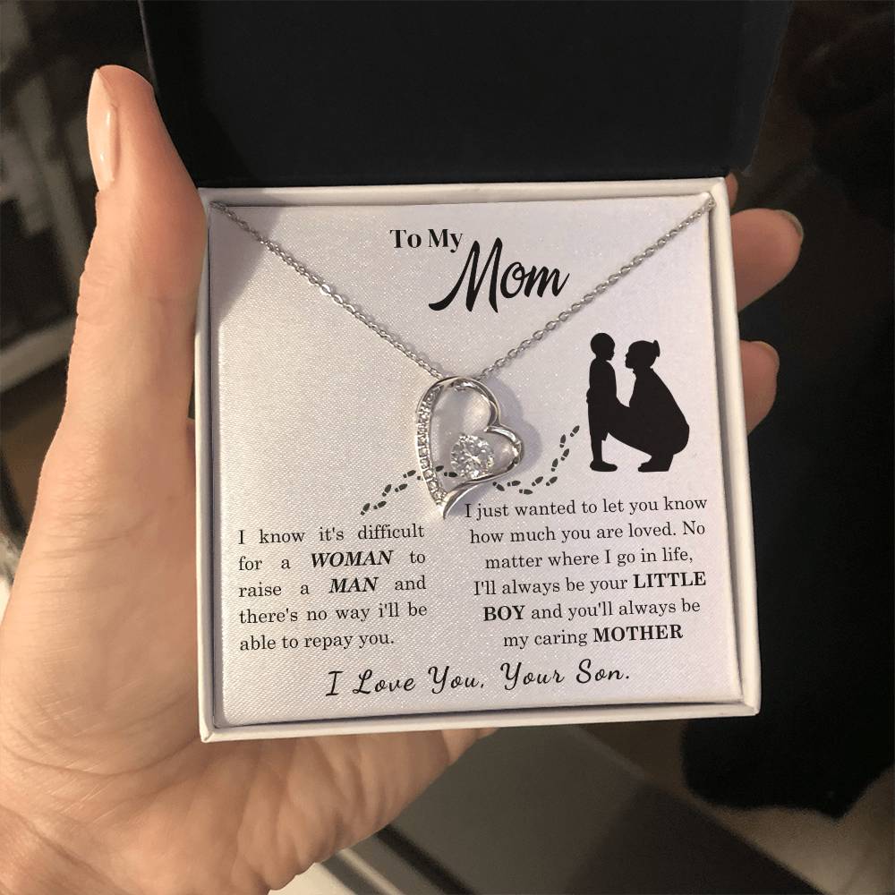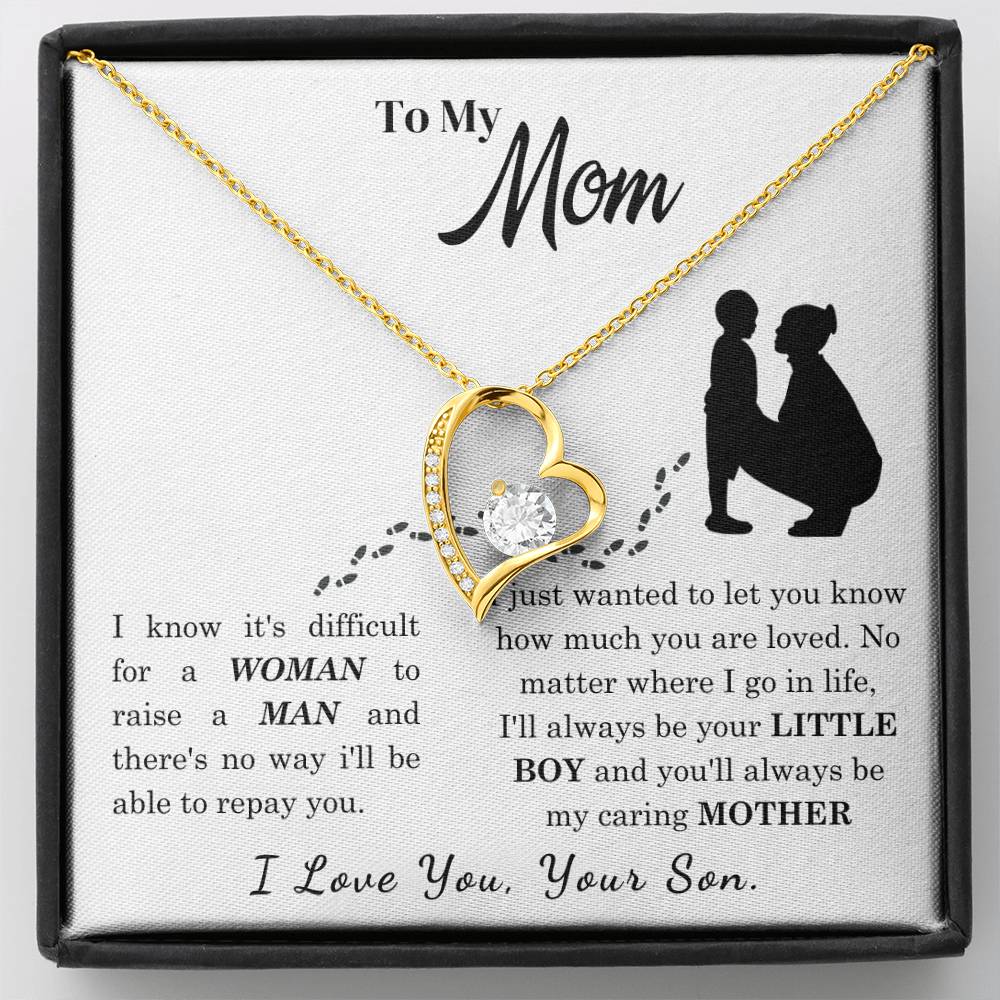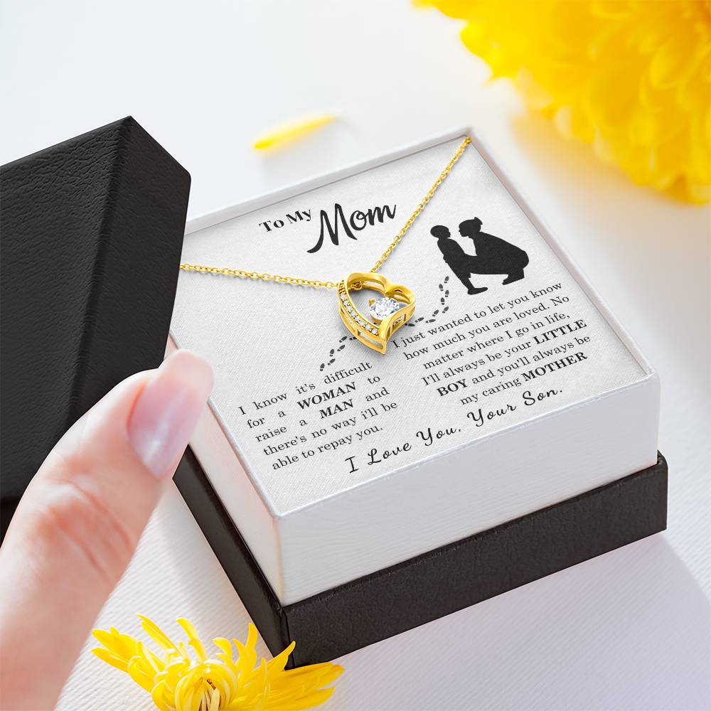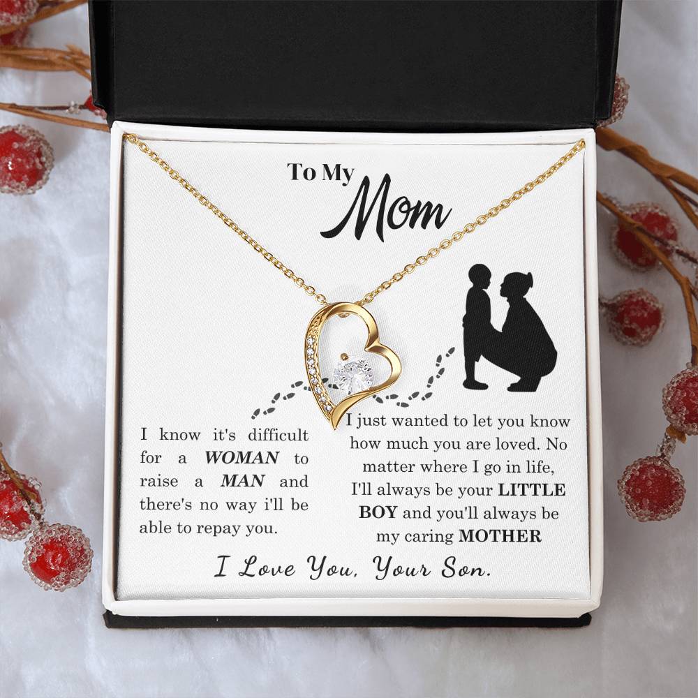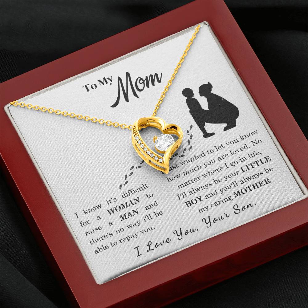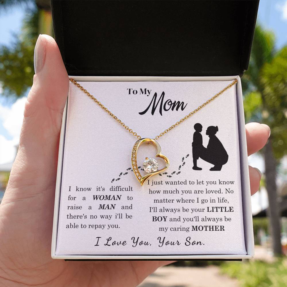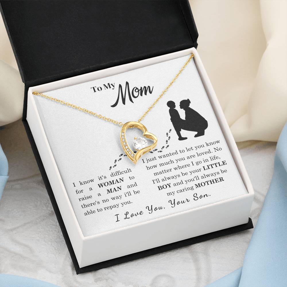 Quote On Card: “I know it's difficult for a WOMAN to raise a MAN and there's no way i'll be able to repay you. I just wanted to let you know how much you are loved. No matter where I go in life, I'll always be your LITTLE BOY and you'll always be my caring MOTHER . I Love You, Your Son.”