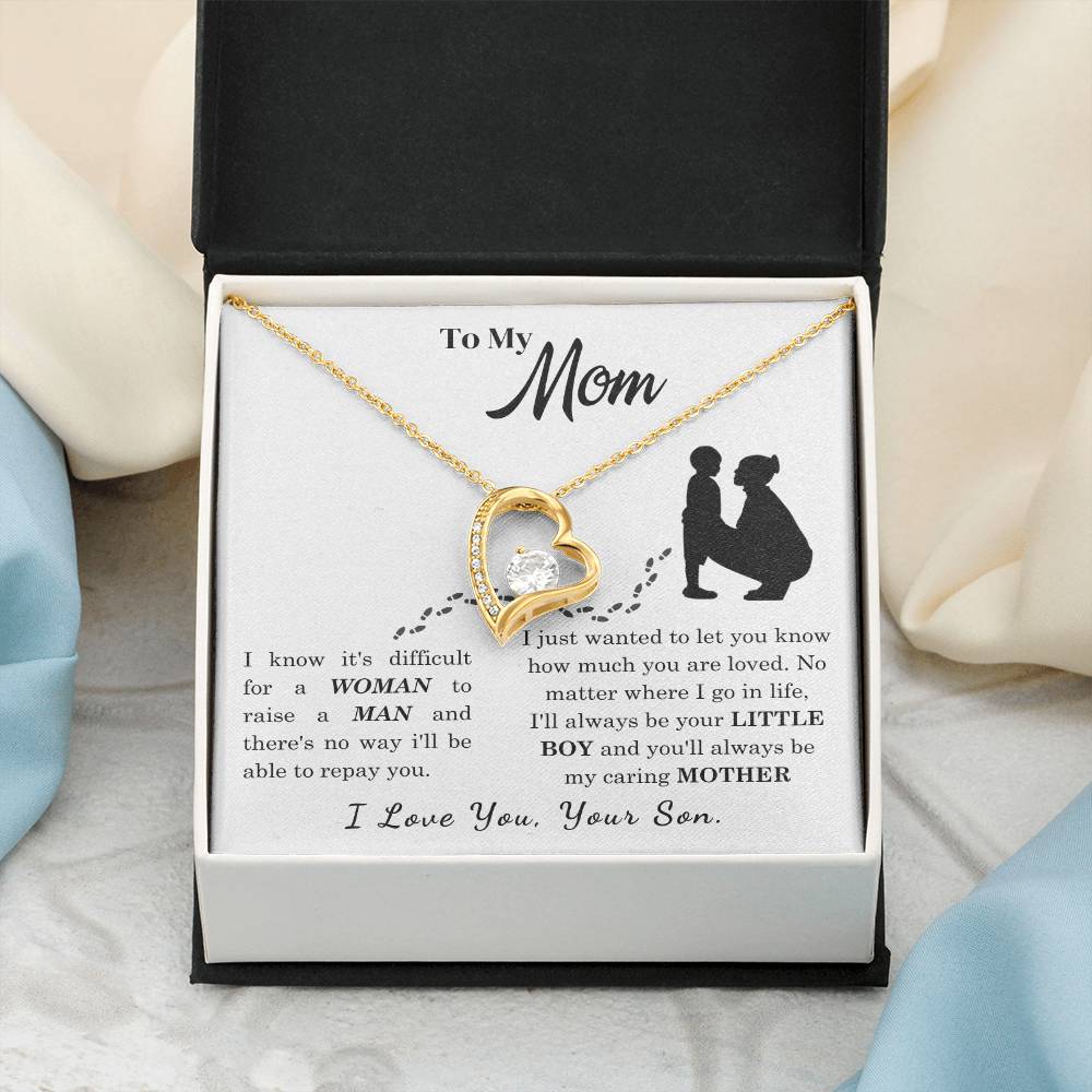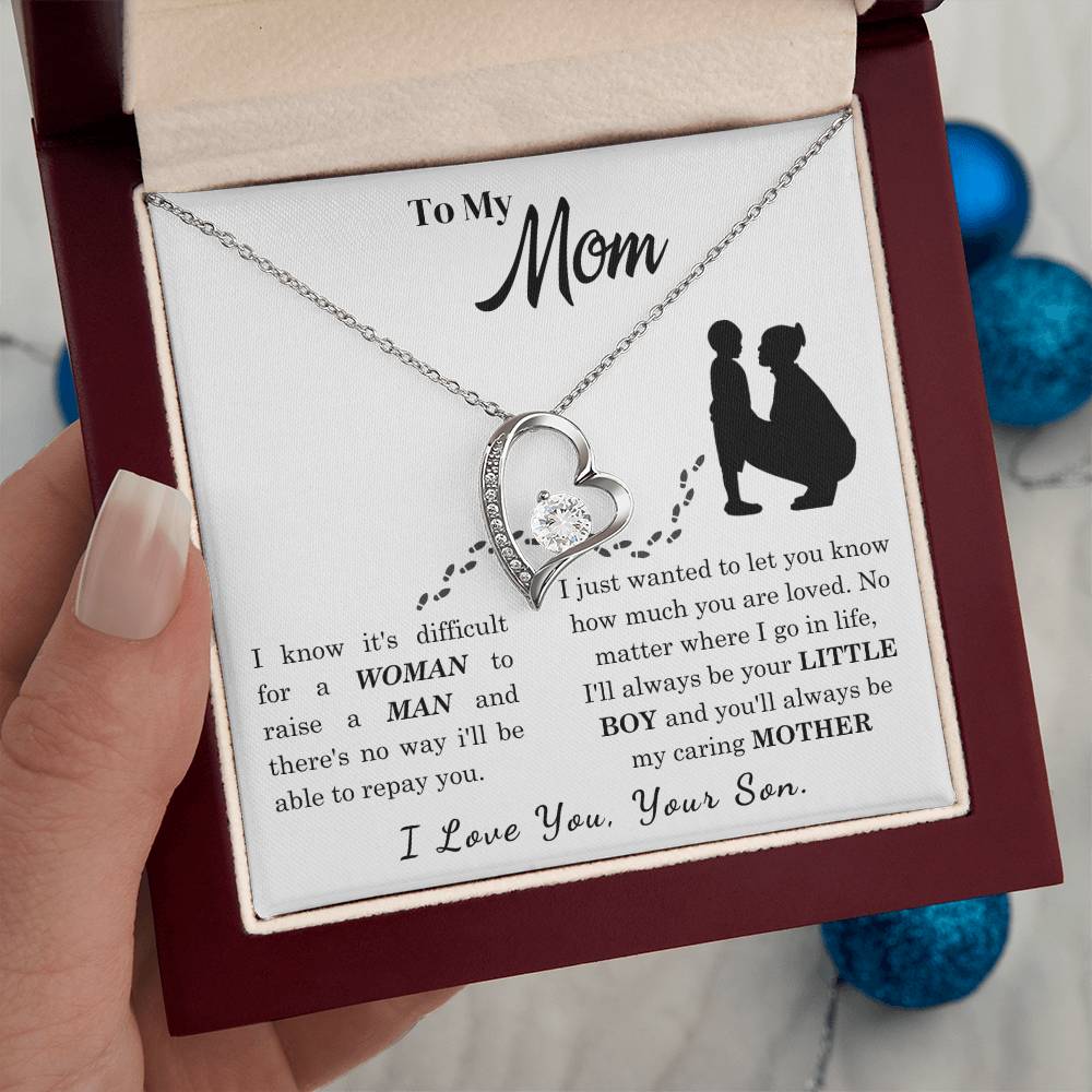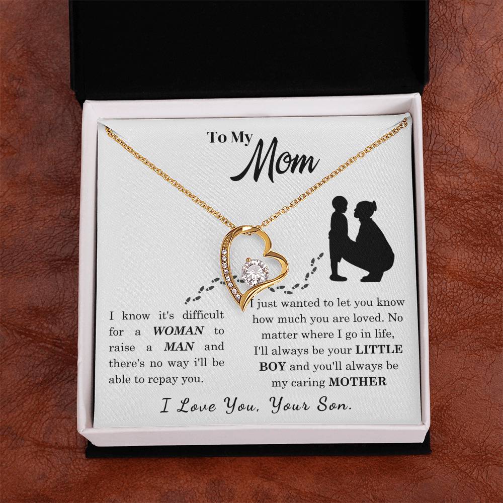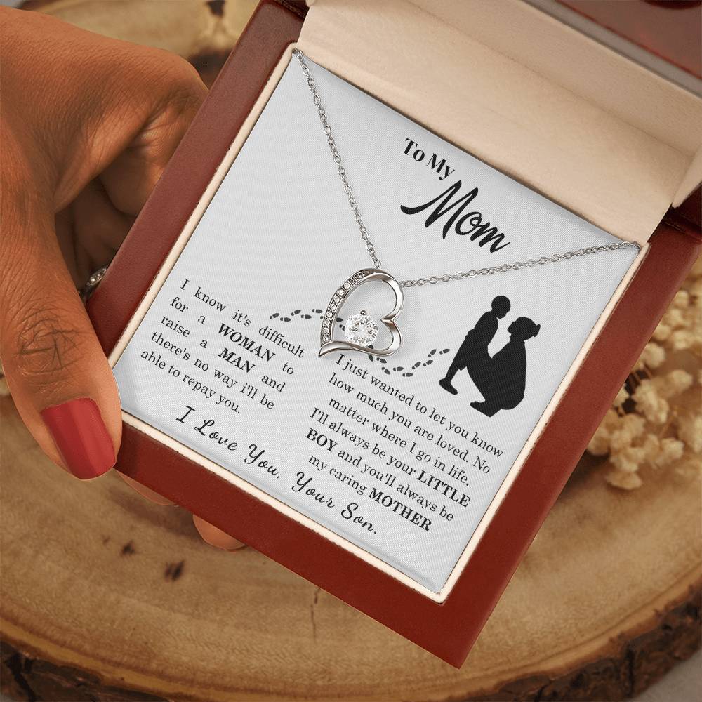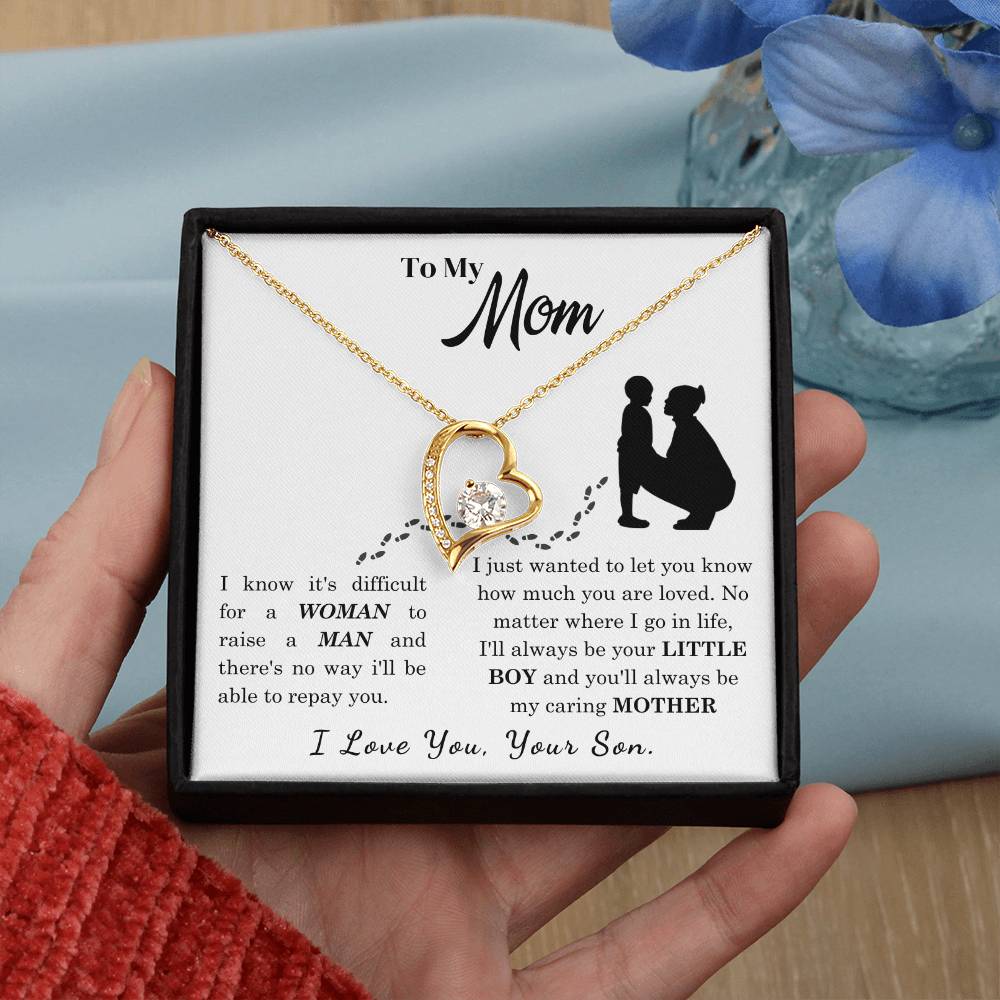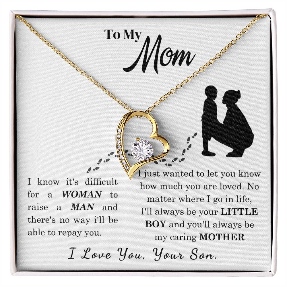 Quote On Card: “I know it's difficult for a WOMAN to raise a MAN and there's no way i'll be able to repay you. I just wanted to let you know how much you are loved. No matter where I go in life, I'll always be your LITTLE BOY and you'll always be my caring MOTHER . I Love You, Your Son.”