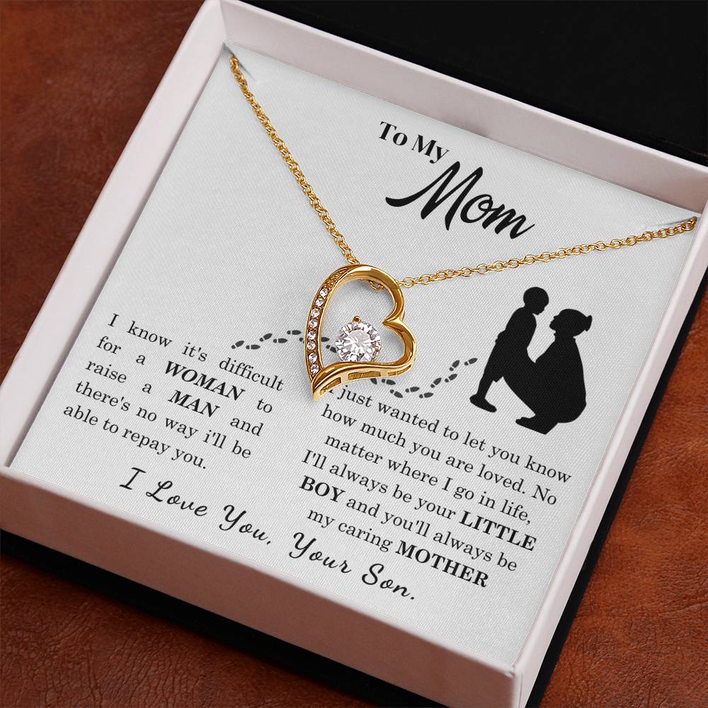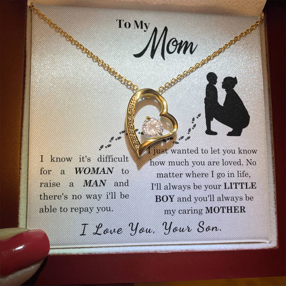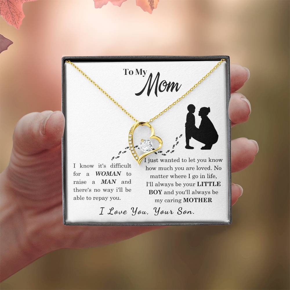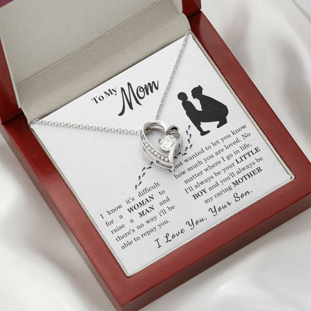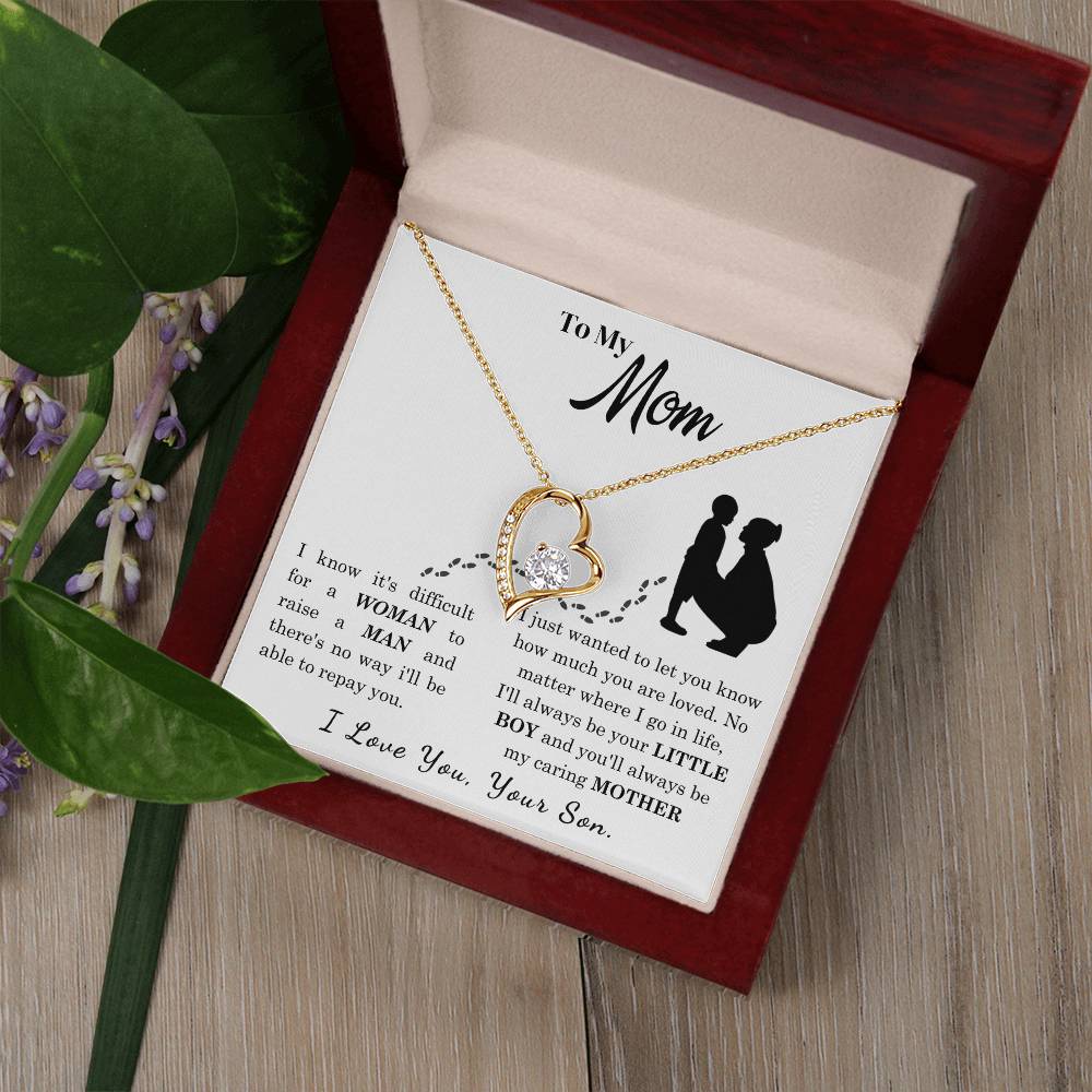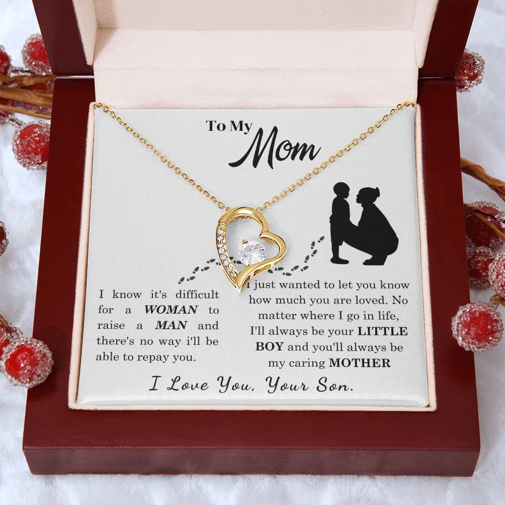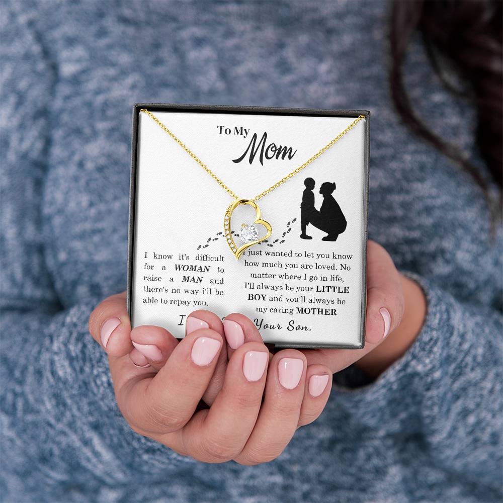 Quote On Card: “I know it's difficult for a WOMAN to raise a MAN and there's no way i'll be able to repay you. I just wanted to let you know how much you are loved. No matter where I go in life, I'll always be your LITTLE BOY and you'll always be my caring MOTHER . I Love You, Your Son.”