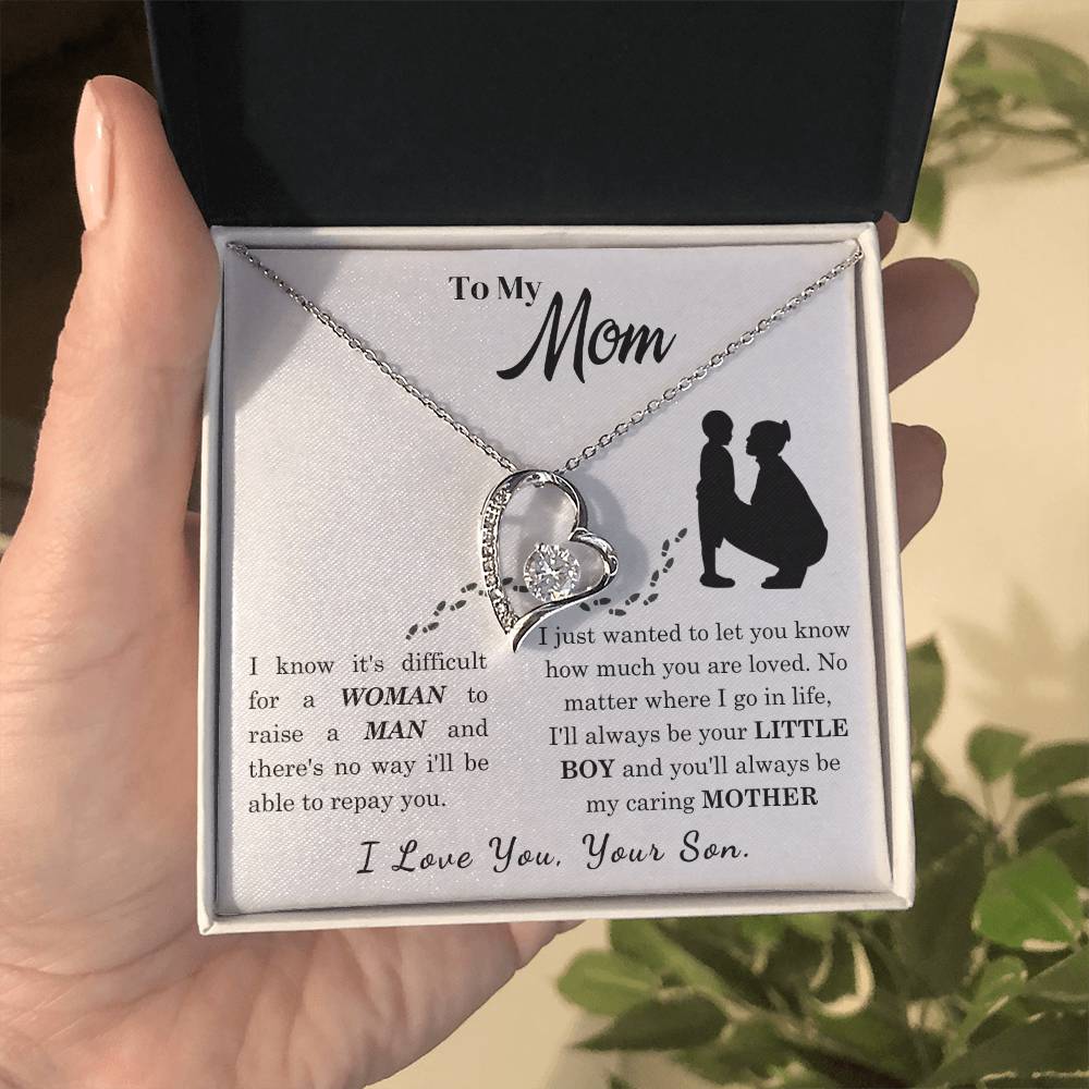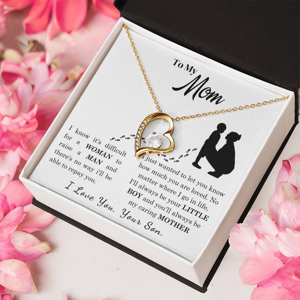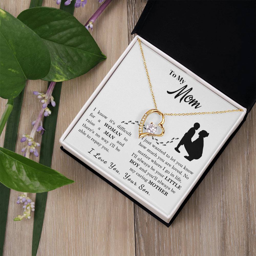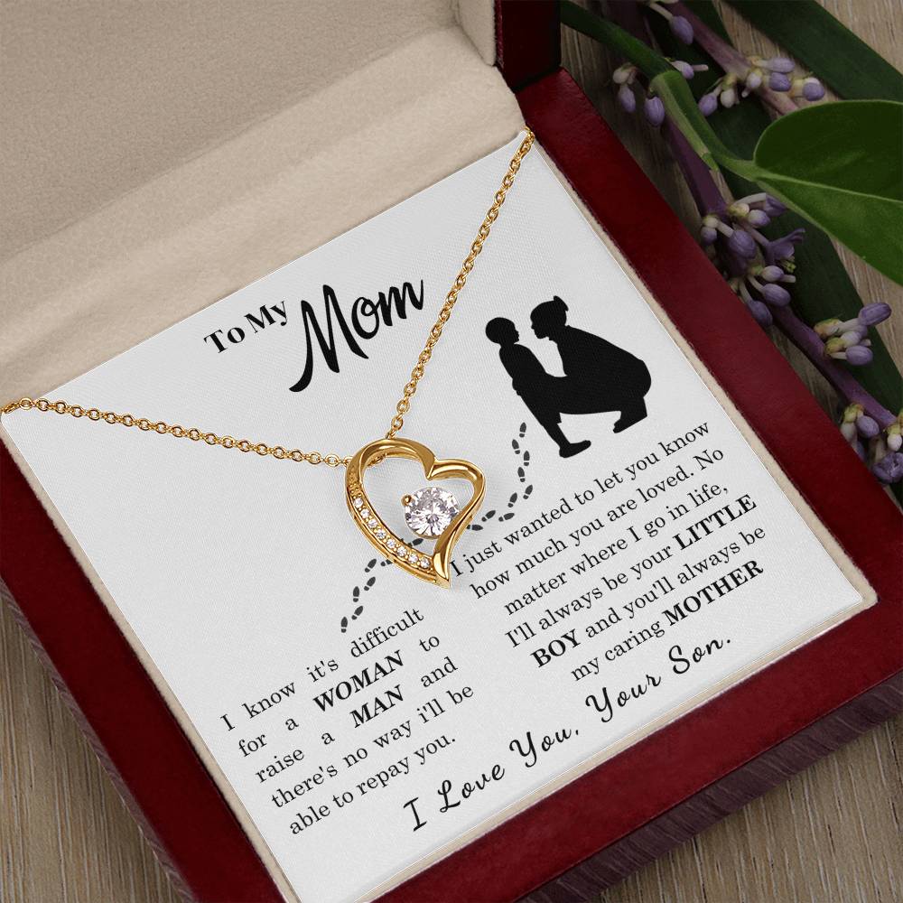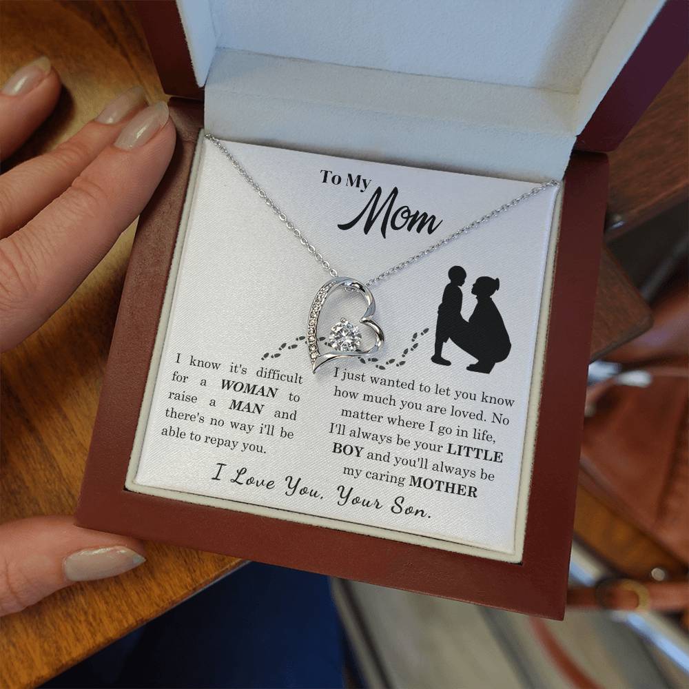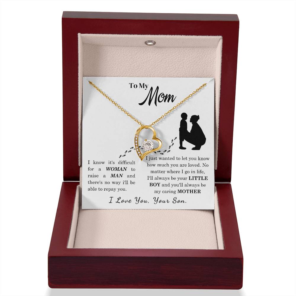 Quote On Card: “I know it's difficult for a WOMAN to raise a MAN and there's no way i'll be able to repay you. I just wanted to let you know how much you are loved. No matter where I go in life, I'll always be your LITTLE BOY and you'll always be my caring MOTHER . I Love You, Your Son.”