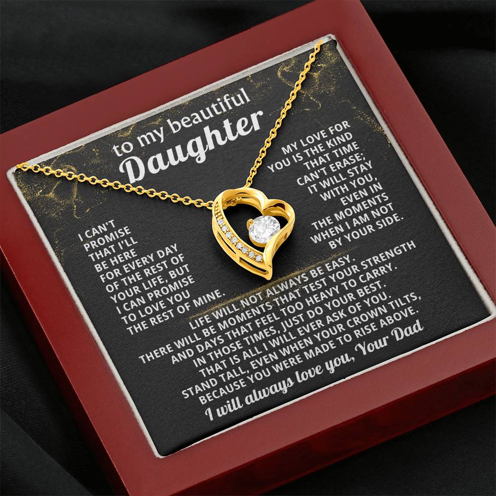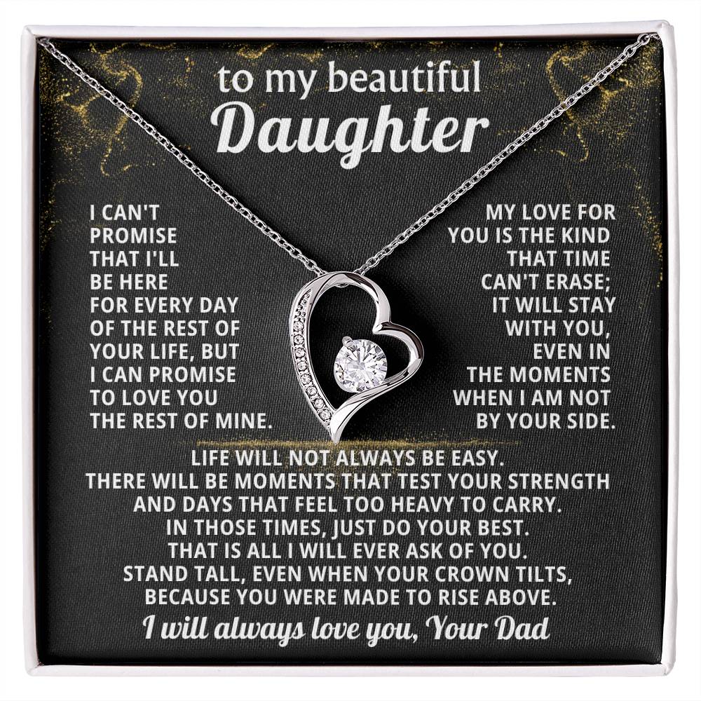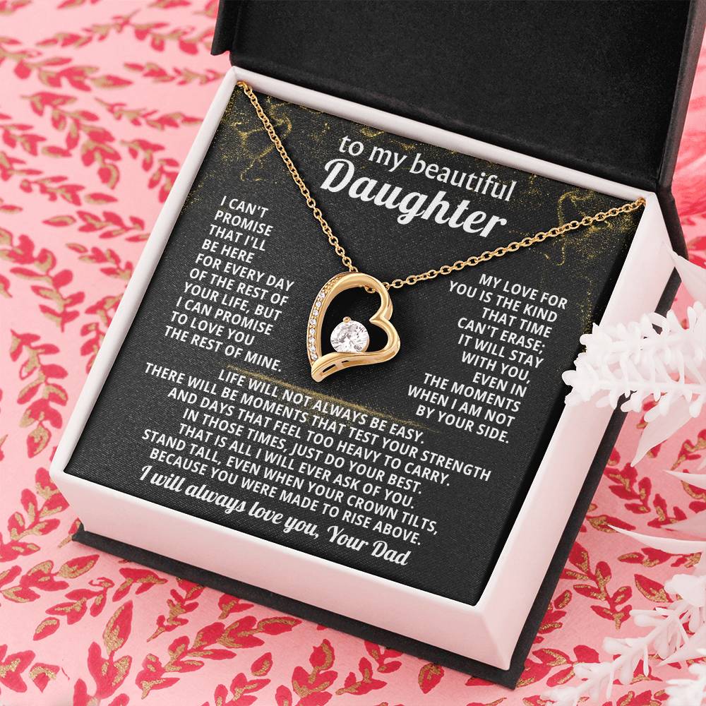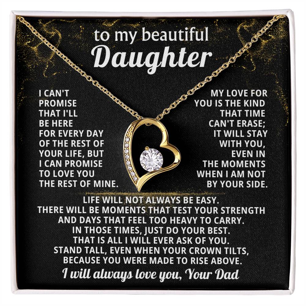 Quote On Card: TO MY BEAUTIFUL DAUGHTER, I can't promise that I'll be here for every day of the rest of your life, but I can promiseyou this. I will love you withevery breath I take, for as long as I live. My love for you is the kind that time can't erase; it will stay with you, even in the moments when I am not by your side.Life will not always be easy. when the road ahead feels uncertain or too overwhelming, I want you to remember this : you are never alone. Look beside you, and you will find me in your heart, in your prayers, and in the love that will never leave you. I will always love you, Your Dad