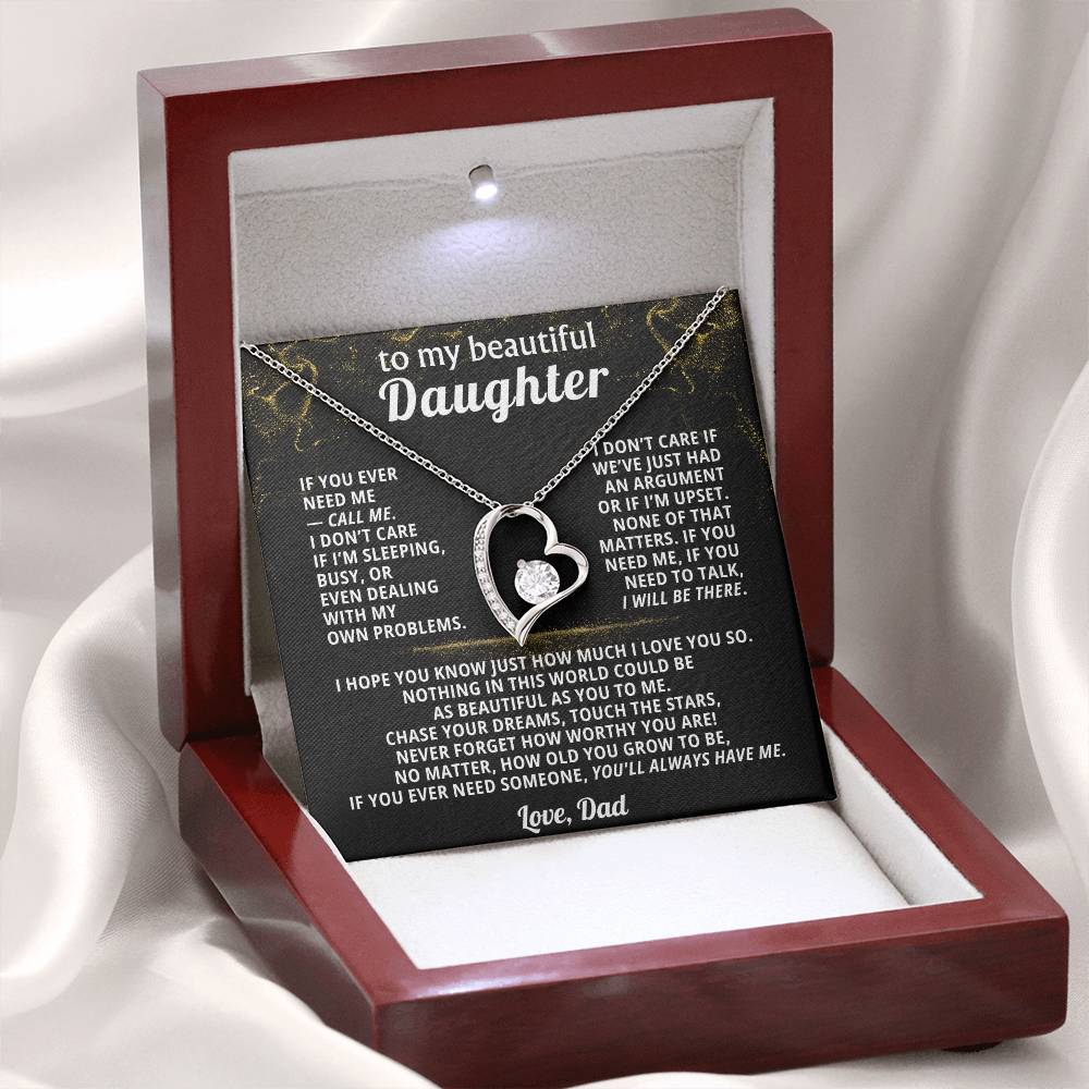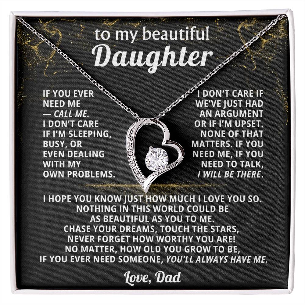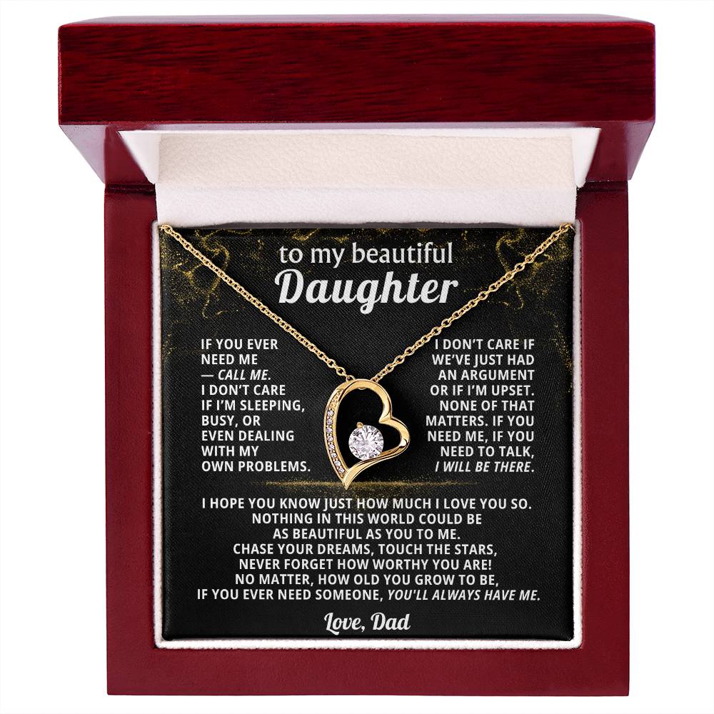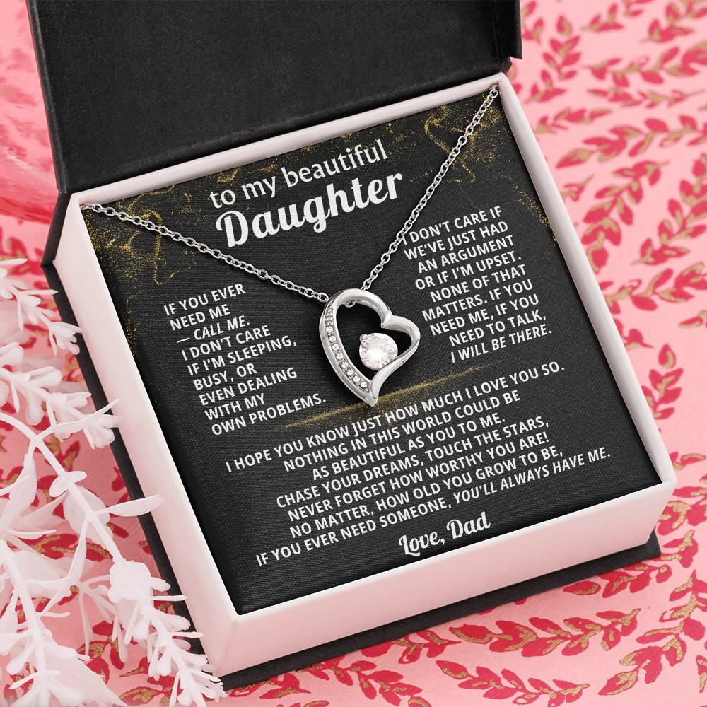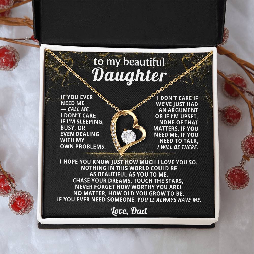 Quote On Card: TO MY BEAUTIFUL DAUGHTER, If you ever need me — call me. I don’t care if I’m sleeping, busy, or even dealing with my own problems. I don’t care if we’ve just had an argument or if I’m upset. None of that matters. If you need me, if you need to talk I will be there. I hope you know just how much I love you so. Nothing in this world could be as beautiful as you to me. Chase your dreams, touch the stars, Never forget how worthy you are! No matter, how old you grow to be, if you ever need someone, you'll always have me. Love, Dad