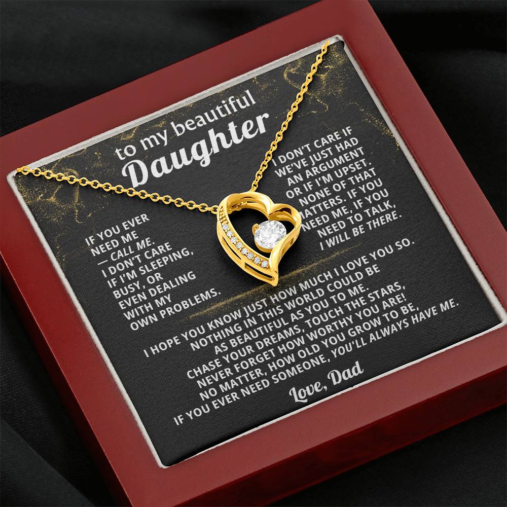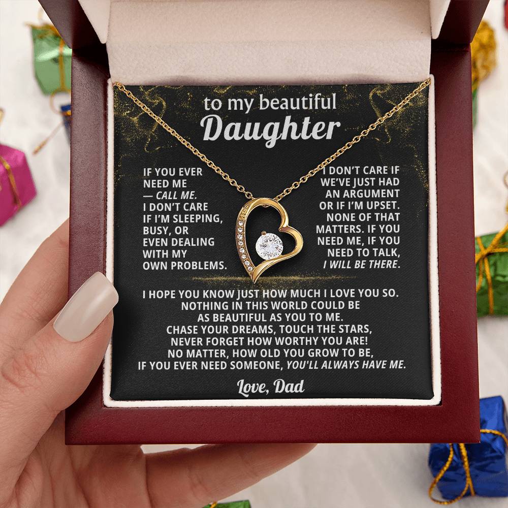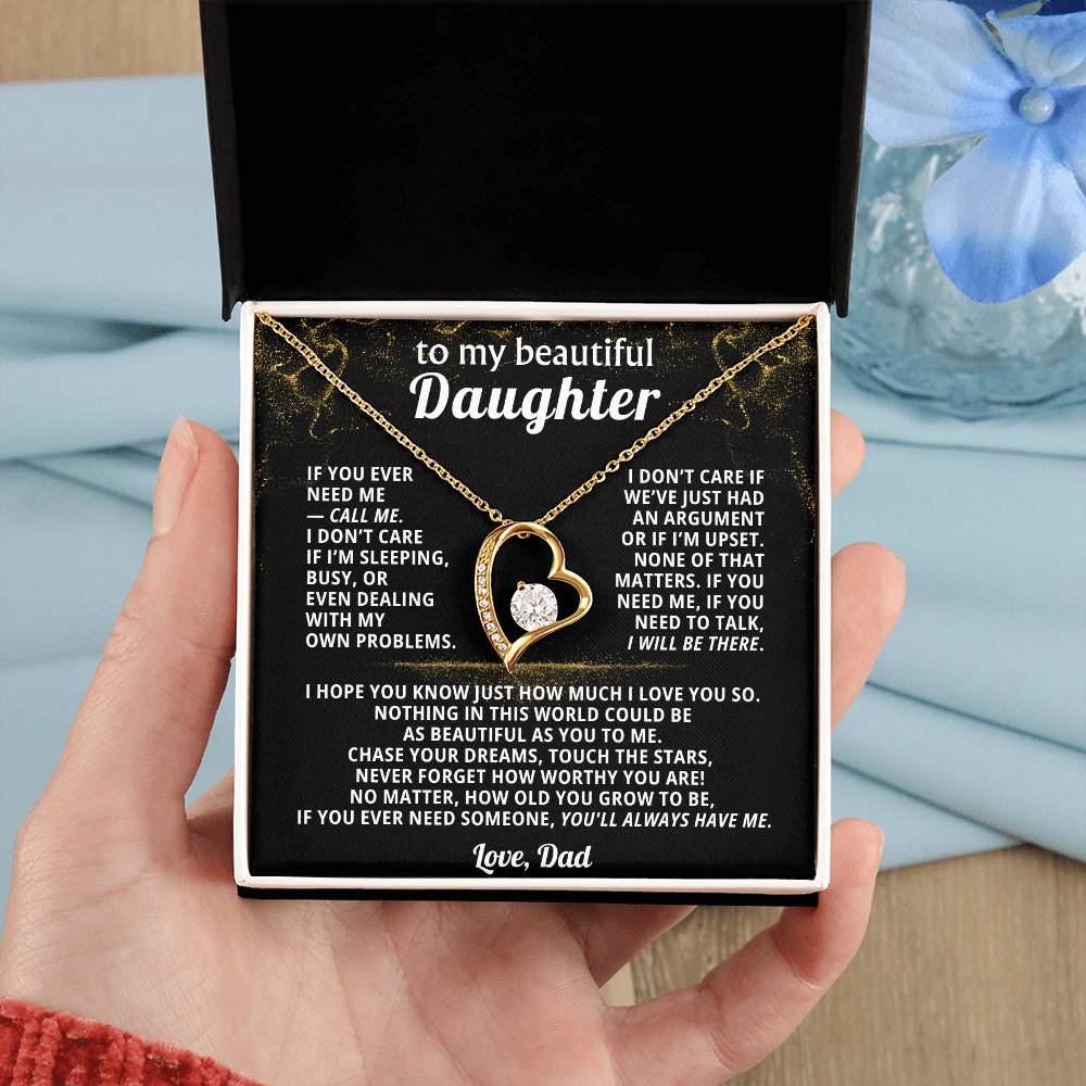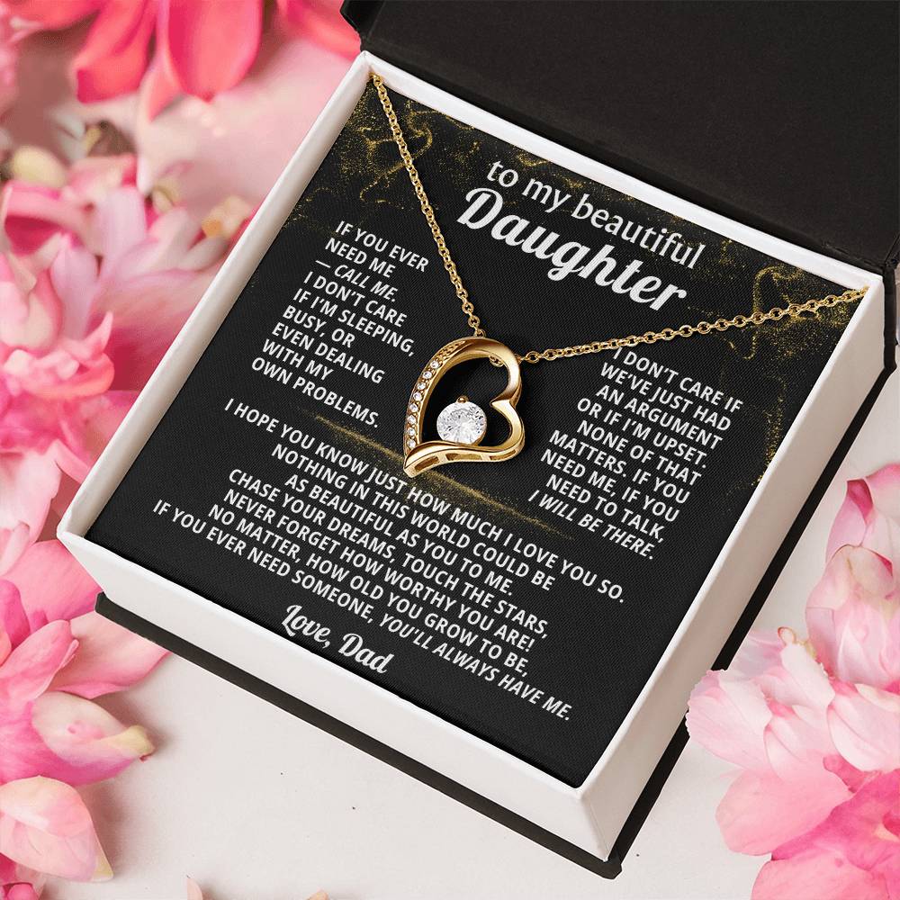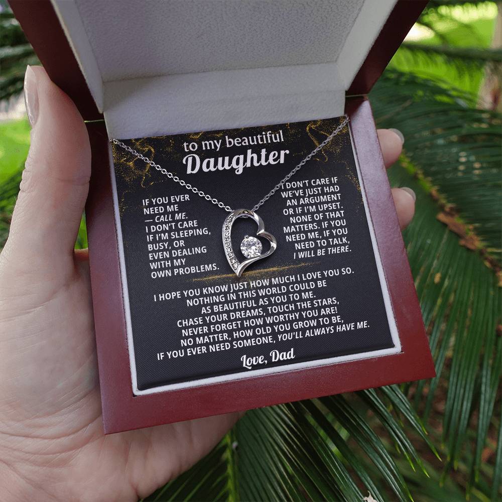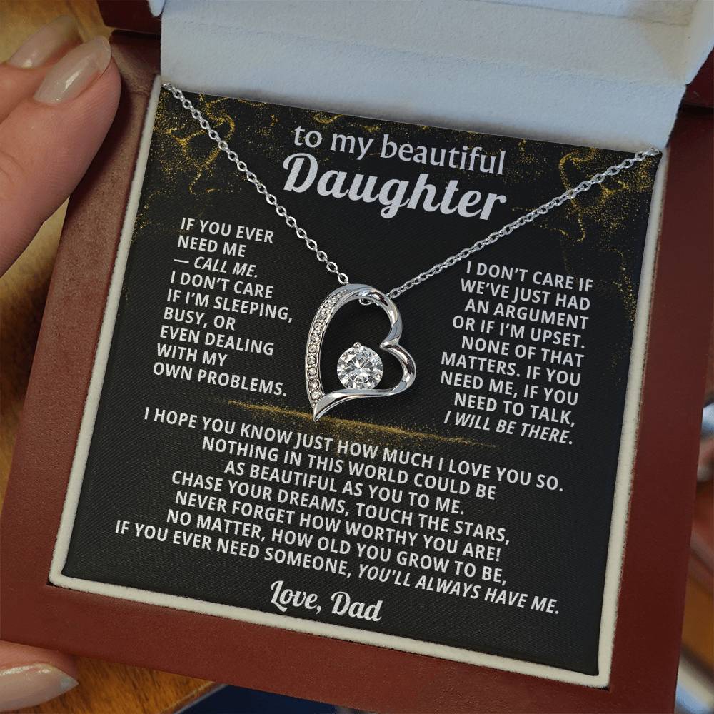 Quote On Card: TO MY BEAUTIFUL DAUGHTER, If you ever need me — call me. I don’t care if I’m sleeping, busy, or even dealing with my own problems. I don’t care if we’ve just had an argument or if I’m upset. None of that matters. If you need me, if you need to talk I will be there. I hope you know just how much I love you so. Nothing in this world could be as beautiful as you to me. Chase your dreams, touch the stars, Never forget how worthy you are! No matter, how old you grow to be, if you ever need someone, you'll always have me. Love, Dad