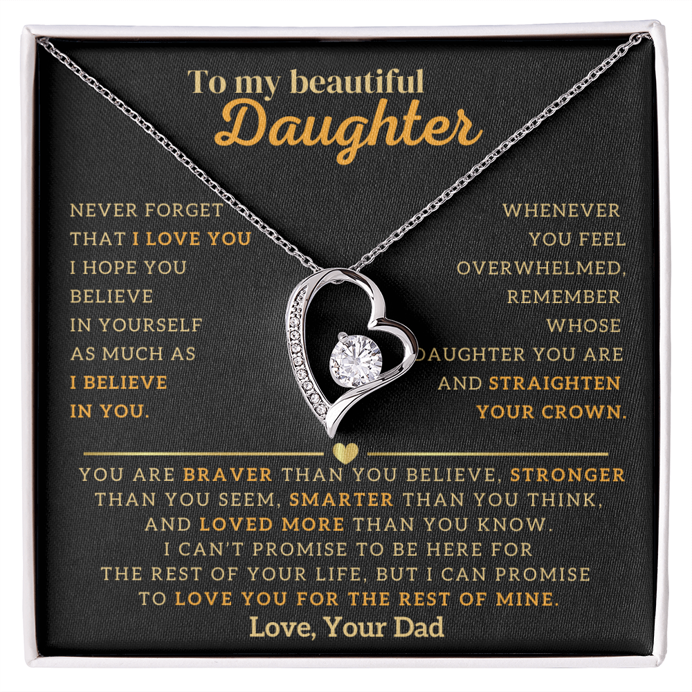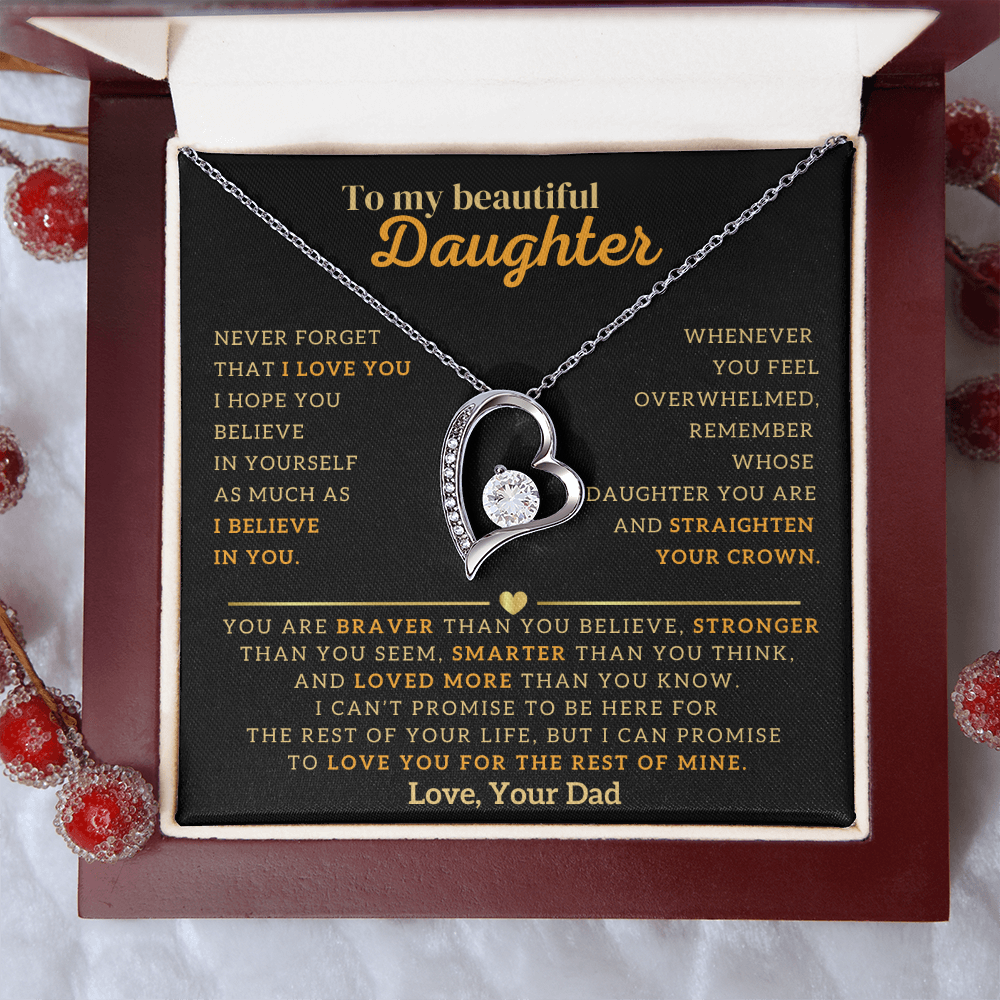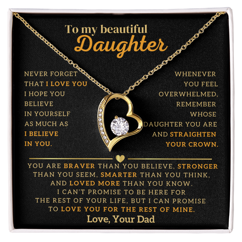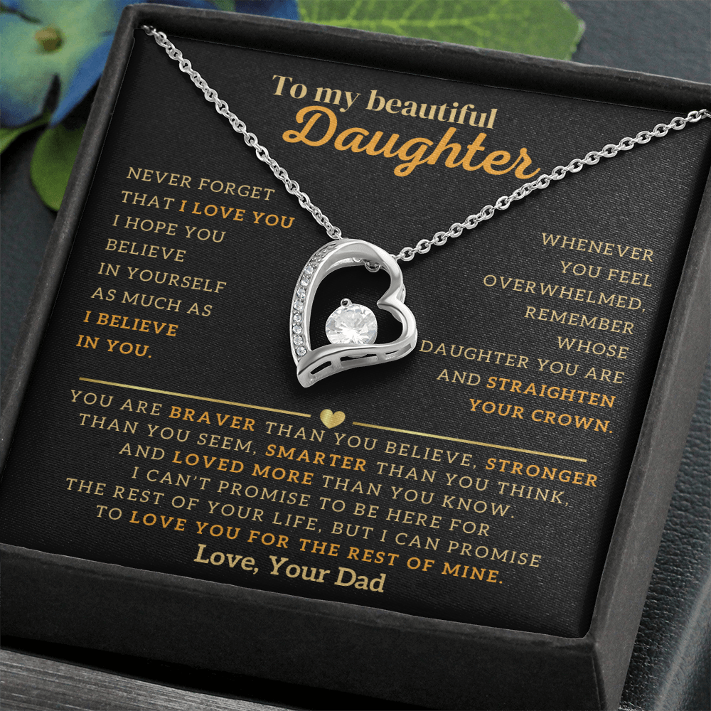 "To My Beautiful Daughter, Never Forget That I Love You. I Hope You Believe In Yourself As Much As I Believe In You. Whenever You Feel Overwhelmed, Remember Whose Daughter You Are and Straighten Your Crown. You Are Braver Than You Believe, Stronger Than You Seem, Smarter Than You Think, And Loved More Than You Know. I Can't Promise To Be Here For The Rest Of Your Life, But I Can Promise To Love You For The Rest Of Mine. Love, Your Dad"