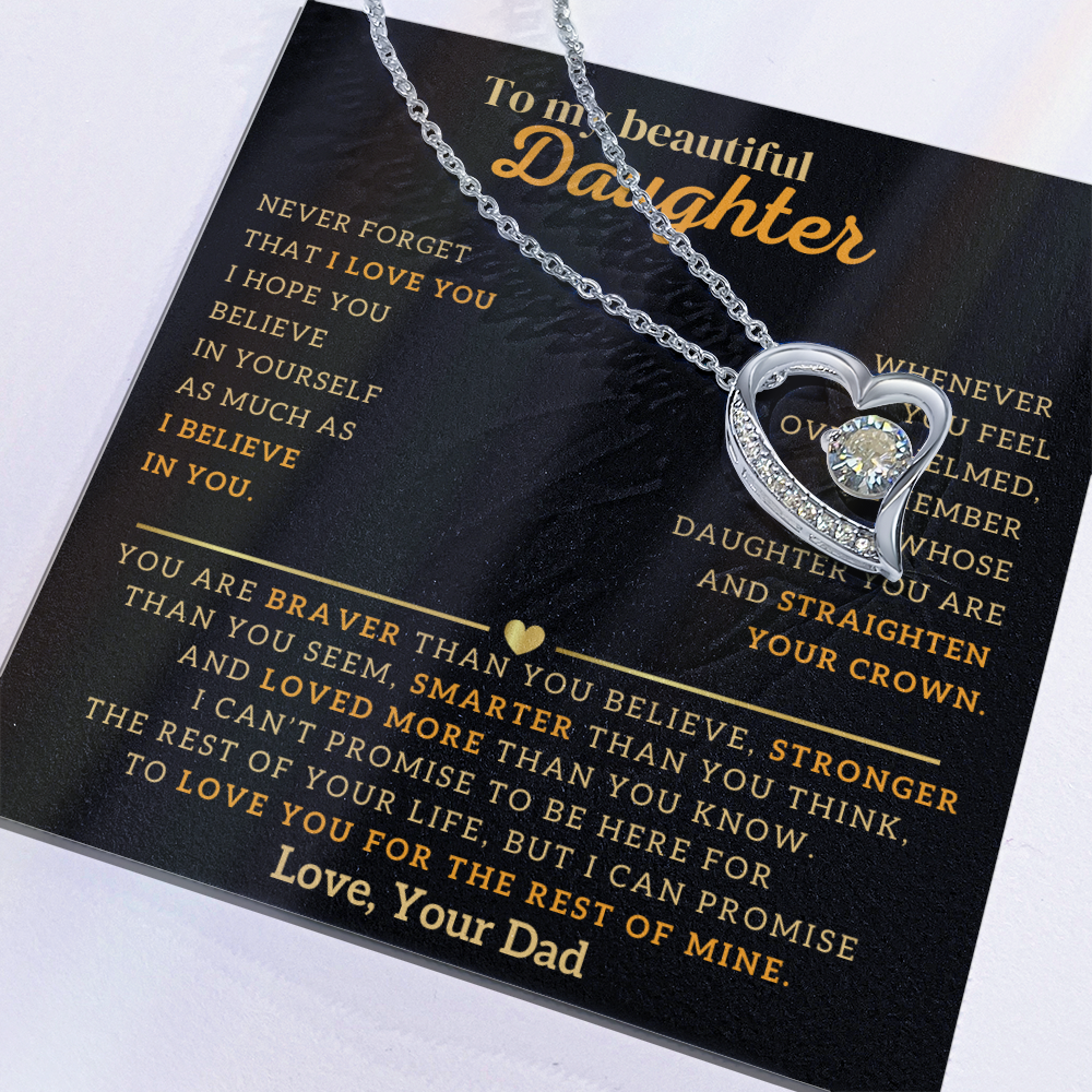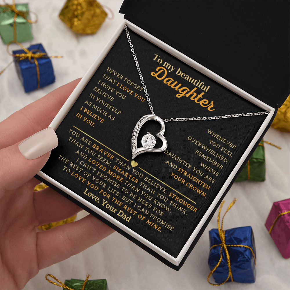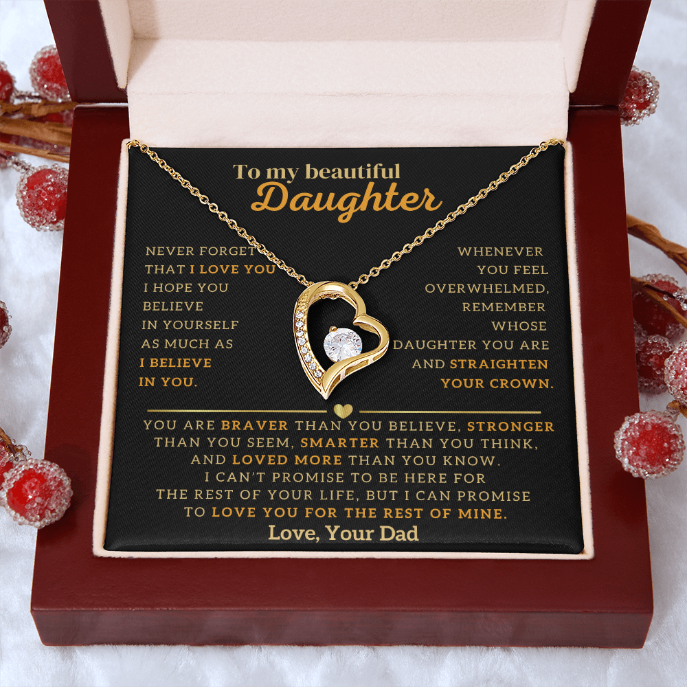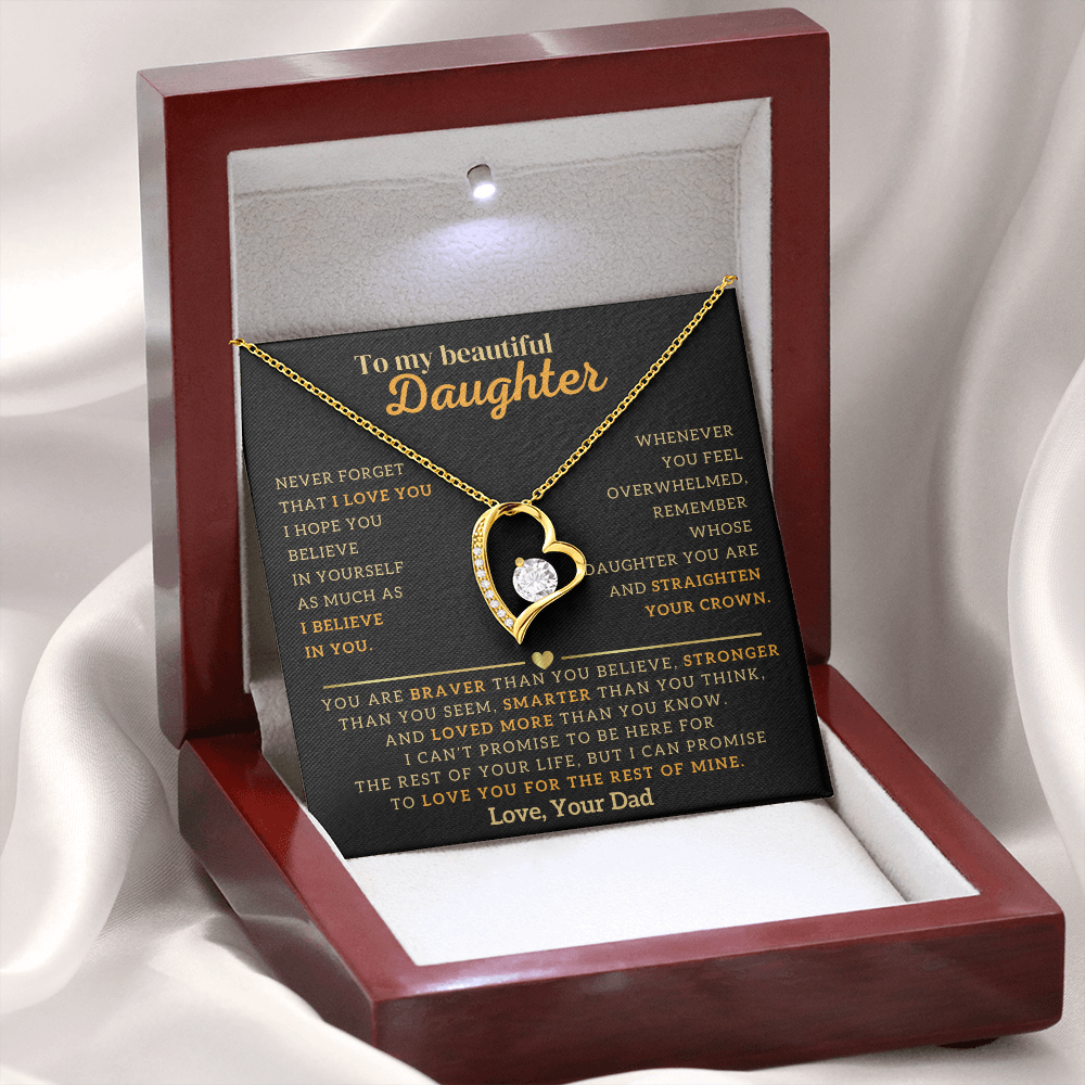 "To My Beautiful Daughter, Never Forget That I Love You. I Hope You Believe In Yourself As Much As I Believe In You. Whenever You Feel Overwhelmed, Remember Whose Daughter You Are and Straighten Your Crown. You Are Braver Than You Believe, Stronger Than You Seem, Smarter Than You Think, And Loved More Than You Know. I Can't Promise To Be Here For The Rest Of Your Life, But I Can Promise To Love You For The Rest Of Mine. Love, Your Dad"