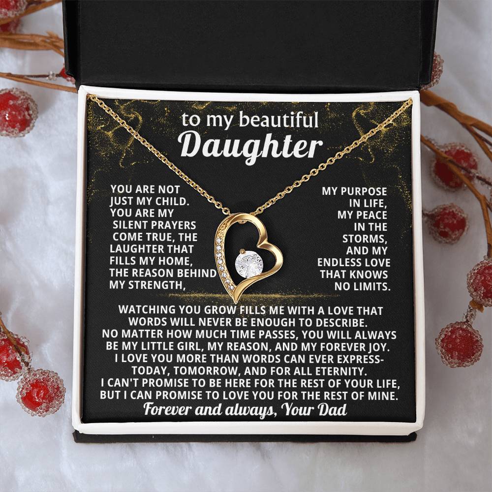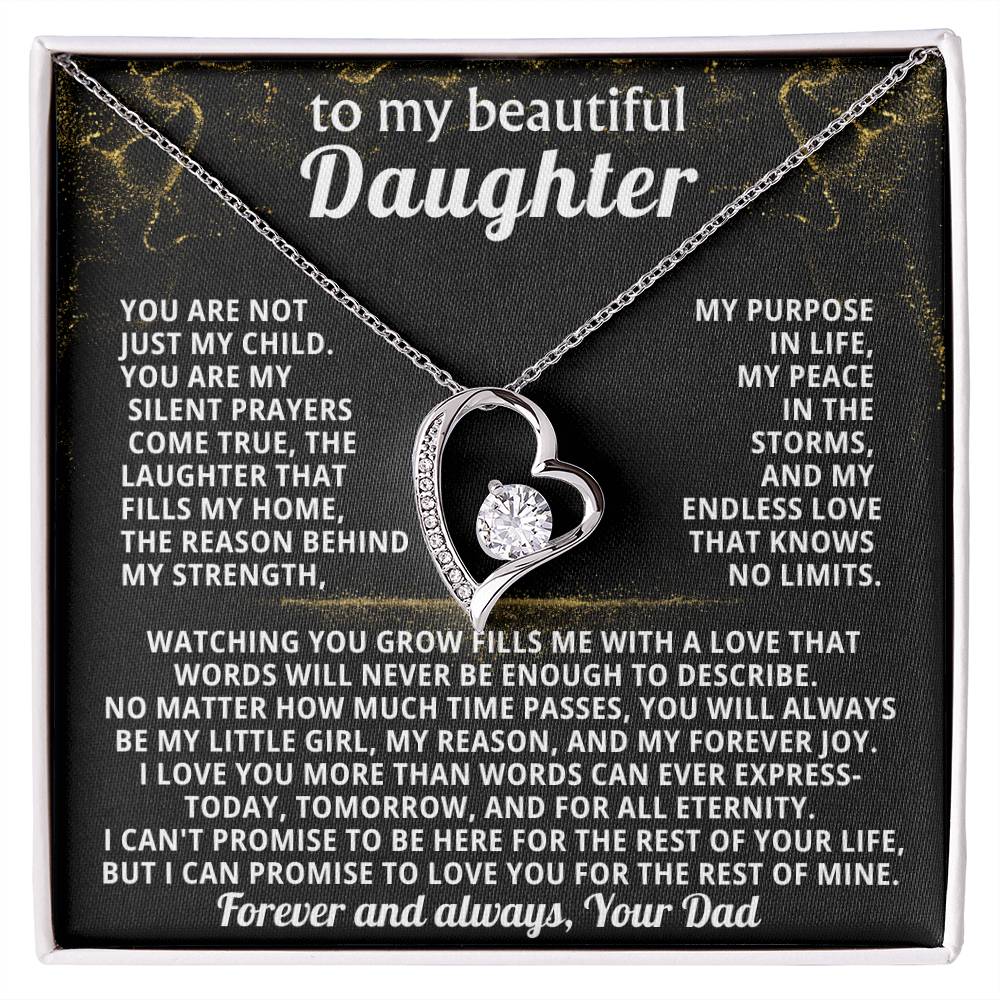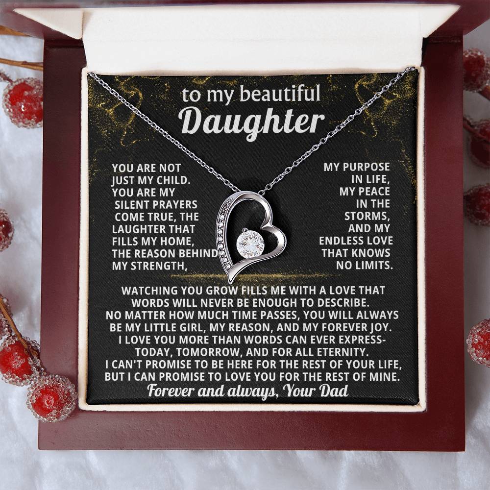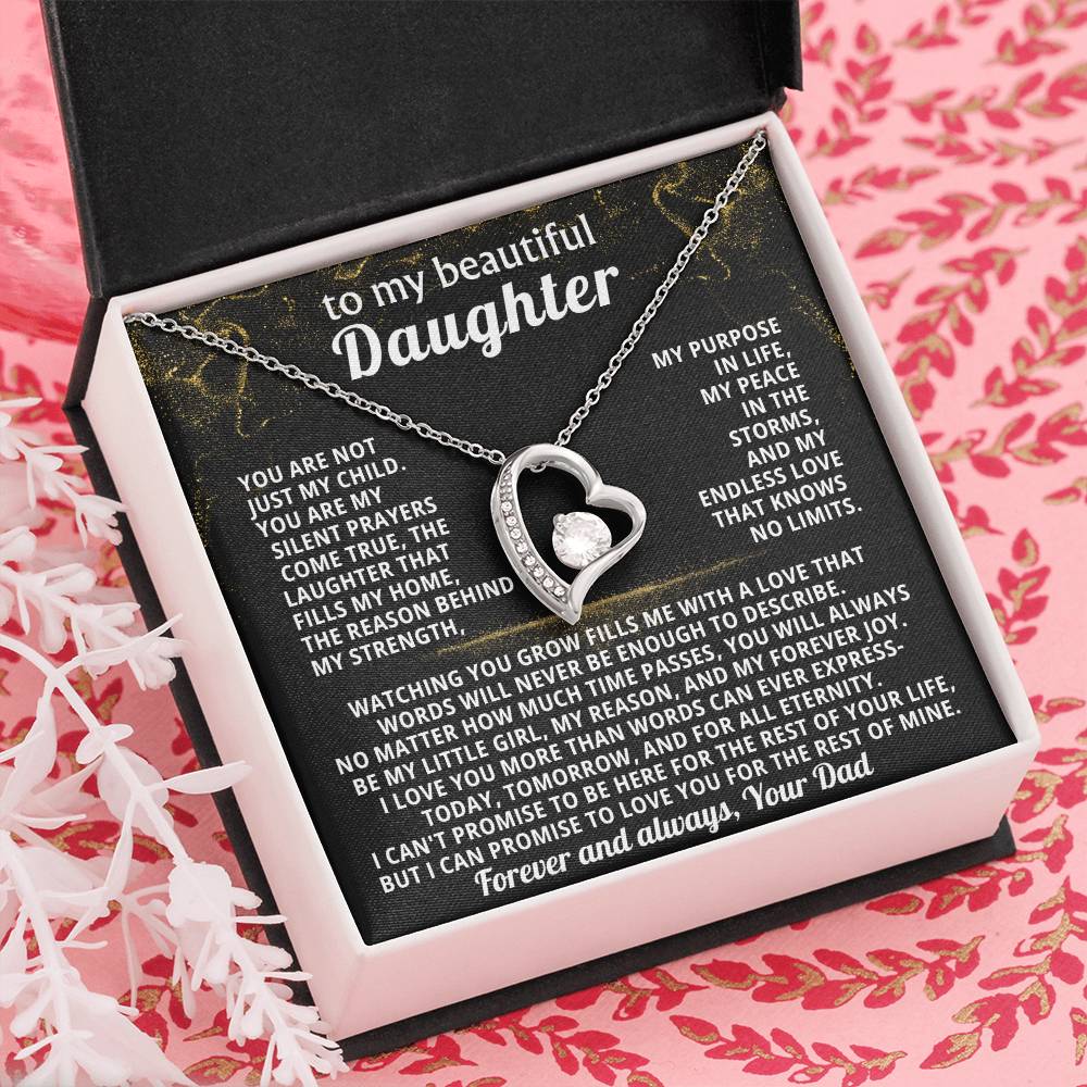Quote On Card: TO MY BEAUTIFUL DAUGHTER, You are not just my child.You are my silent prayers come true, the laughter that fills my home,the reason behind my strength, my purpose in life, my peace in the storms, and my endless love that knows no limits.Watching you grow fills me with a love that words will never be enough to describe. No matter how much time passes, you will always be my little girl, my reason, and my forever joy. I love you more than words can ever express-today, tomorrow, and for all eternity.I can't promise to be here for the rest of your life, but I can promise to LOVE YOU for the rest of mine. Love, Your Dad