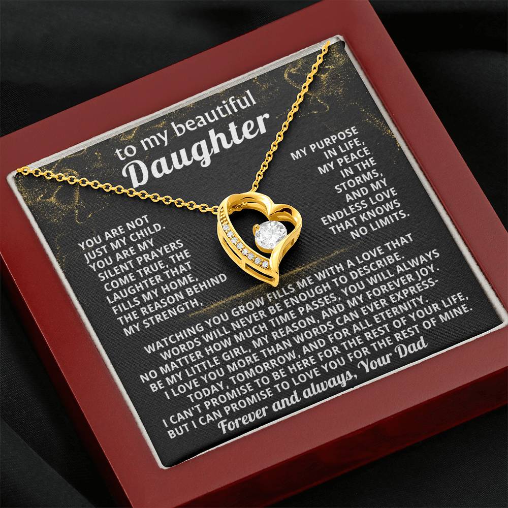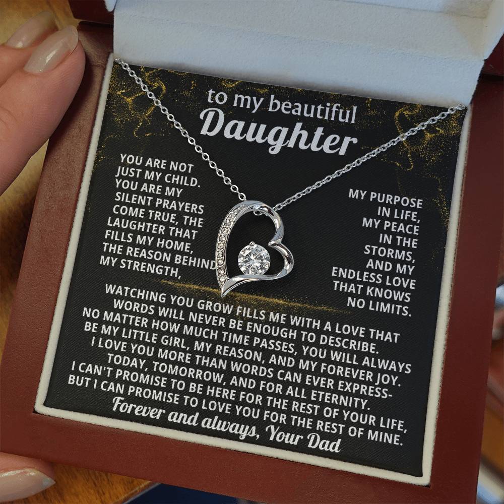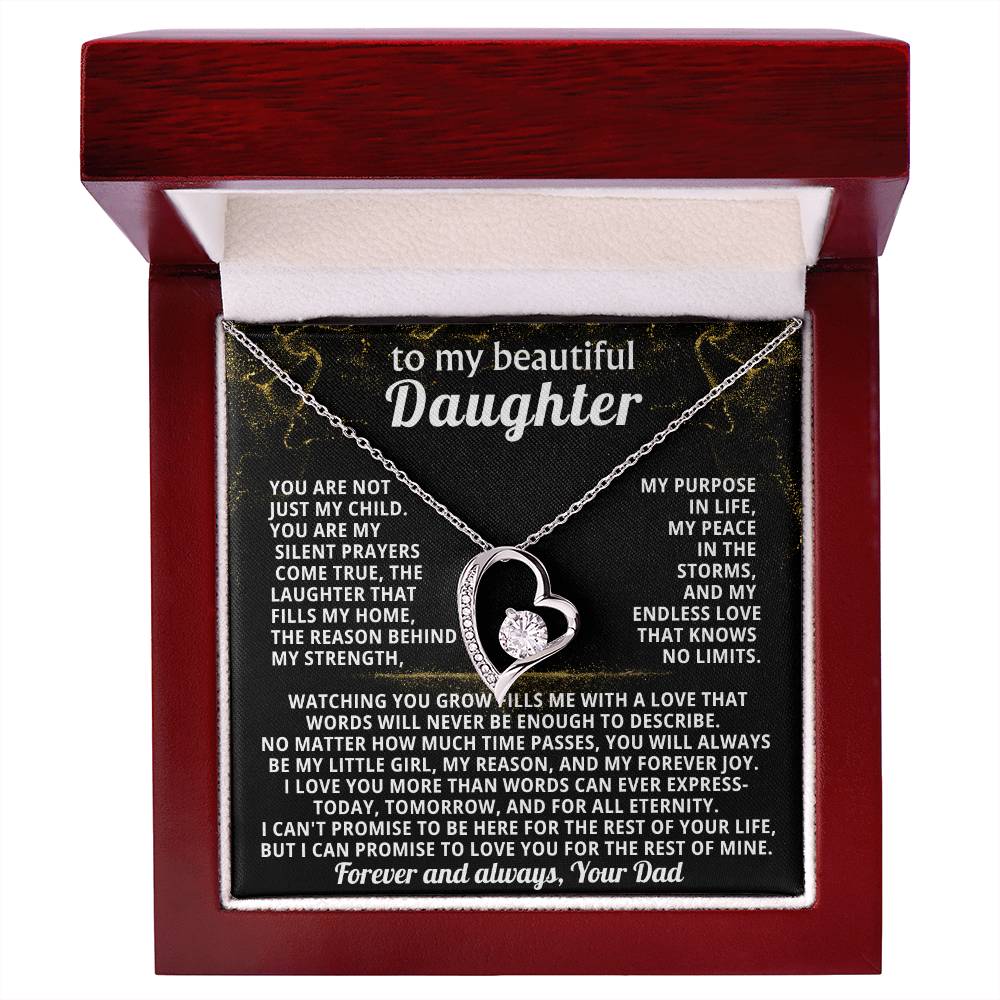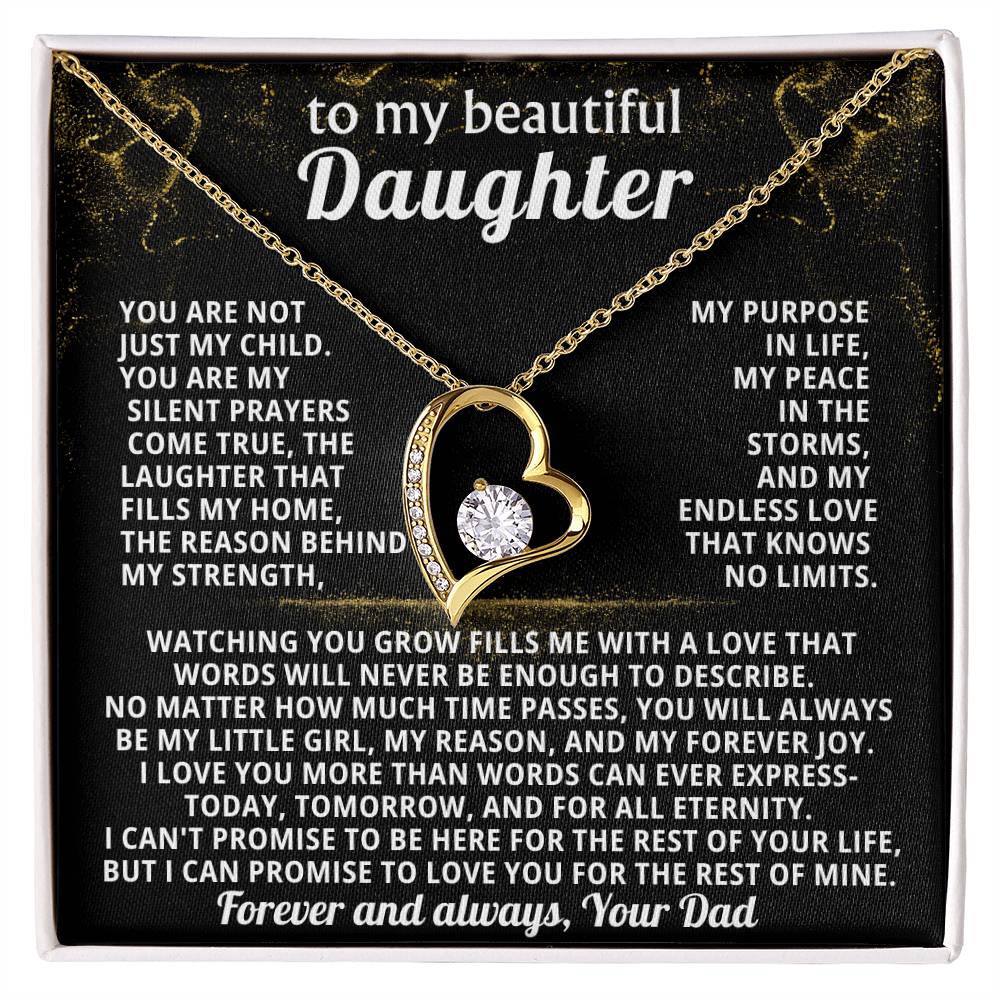 Quote On Card: TO MY BEAUTIFUL DAUGHTER, You are not just my child.You are my silent prayers come true, the laughter that fills my home,the reason behind my strength, my purpose in life, my peace in the storms, and my endless love that knows no limits.Watching you grow fills me with a love that words will never be enough to describe. No matter how much time passes, you will always be my little girl, my reason, and my forever joy. I love you more than words can ever express-today, tomorrow, and for all eternity.I can't promise to be here for the rest of your life, but I can promise to LOVE YOU for the rest of mine. Love, Your Dad