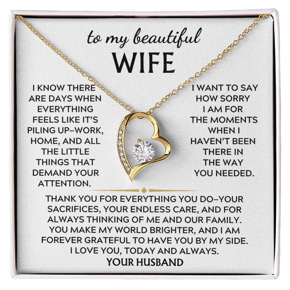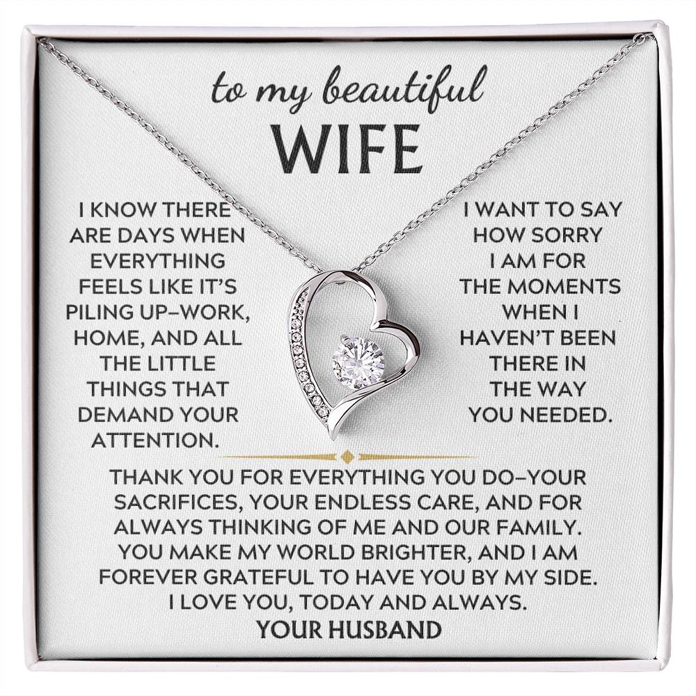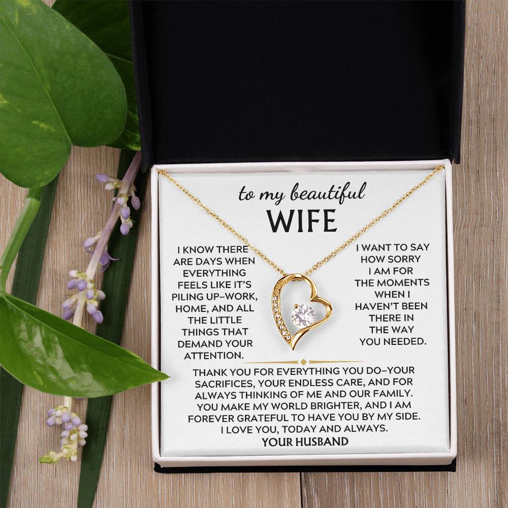 Quote On Card: To My Beautiful Wife, I know there are days when everything feels like it’s piling up—work, home, and all the little things that demand your attention. I want to say how sorry I am for the moments when haven’t been there in the way you needed.Thank you for everything you do—your sacrifices, your endless care, and for always thinking of me and our family. You make my world brighter, and I am forever grateful to have you by my side. I love you, today and always. Your Husband