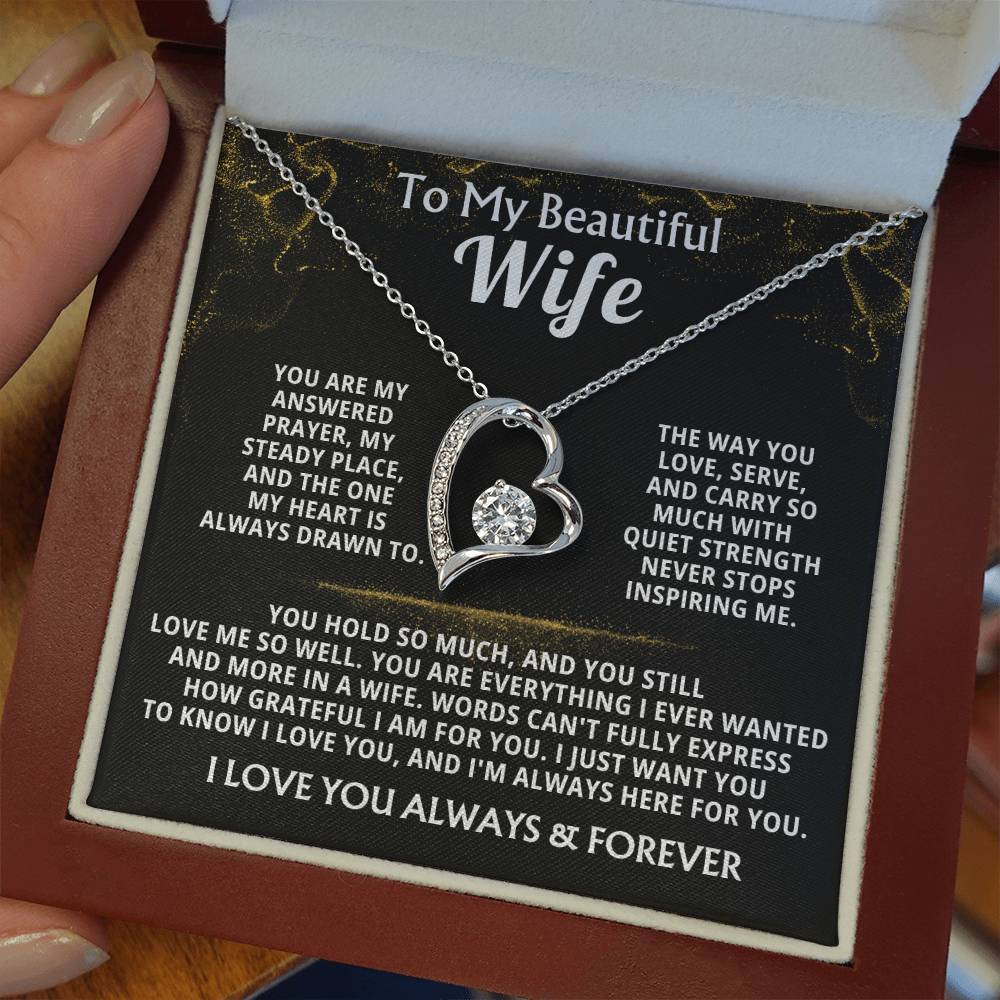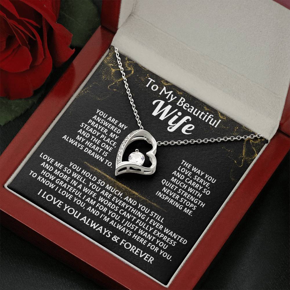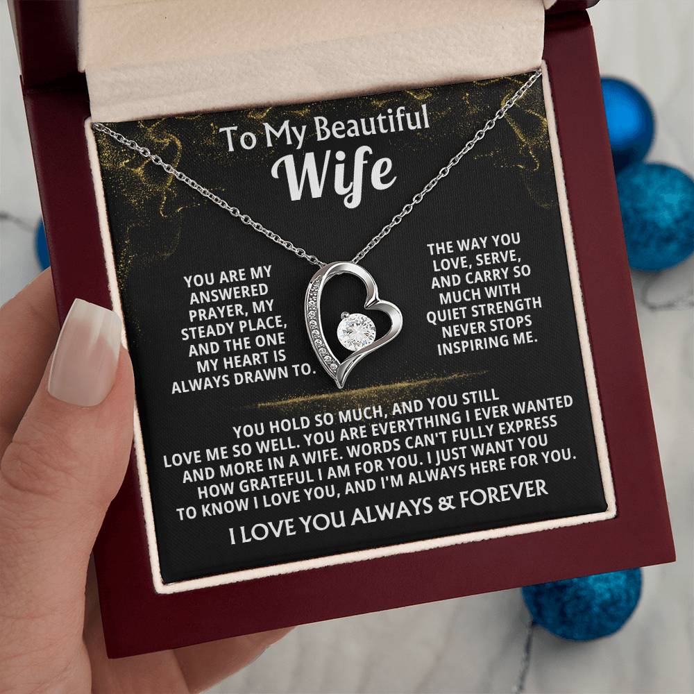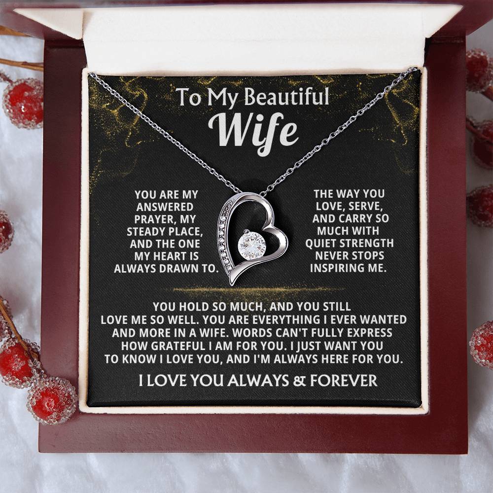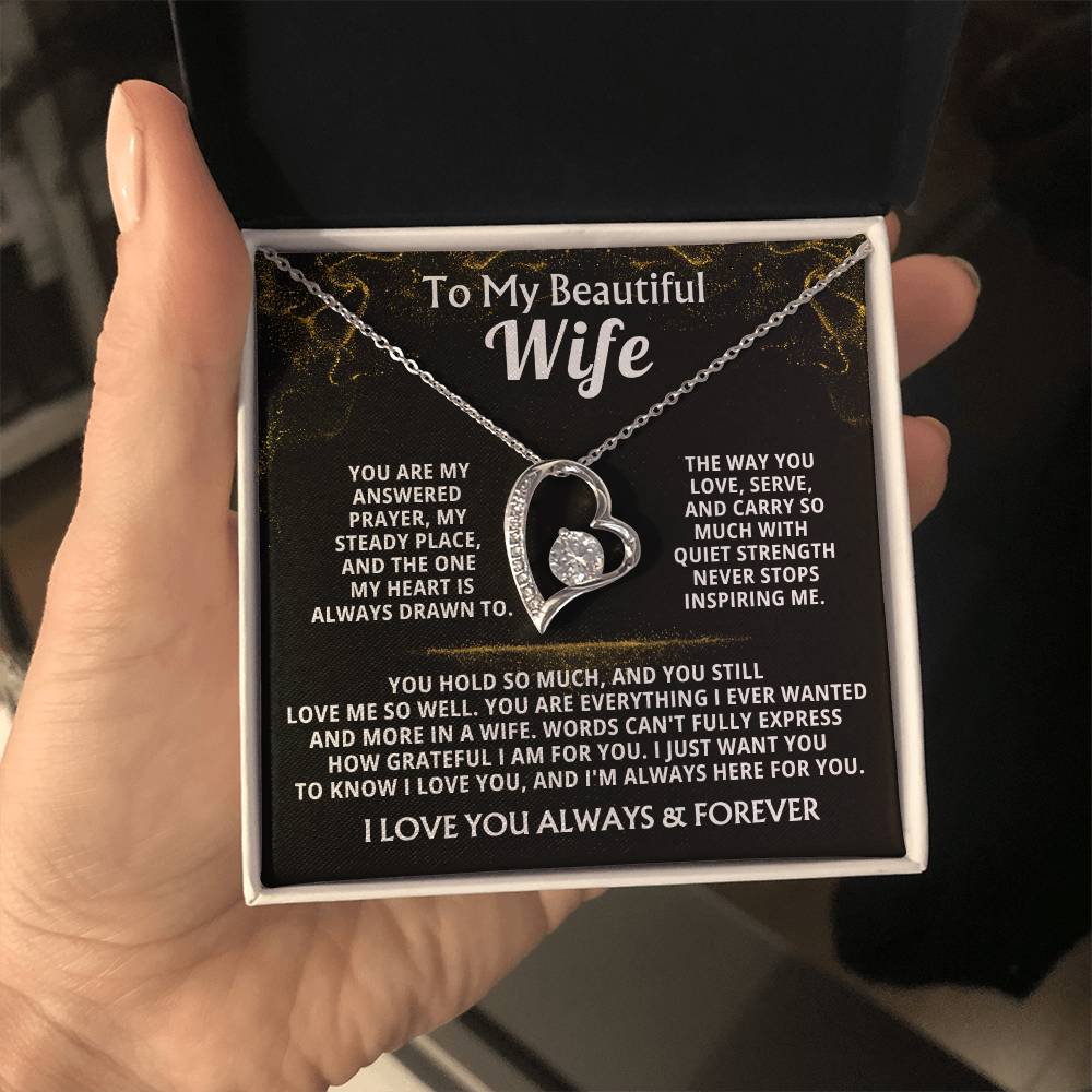 Quote On Card: To My Beautiful Wife, You are my answered prayer, my steady place, and the one my heart is always drawn to. The way you love, serve, and carry so much with quiet strength never stops inspiring me. You hold so much, and you still love me so well. You are everything I ever wanted and more in a wife. Words can't fully express how grateful I am for you. I just want you to know I love you, and I'm always here for you. I LOVE YOU ALWAYS & FOREVER