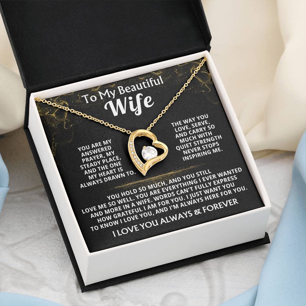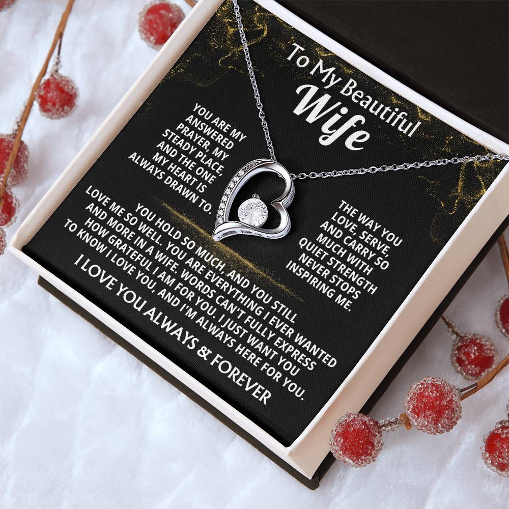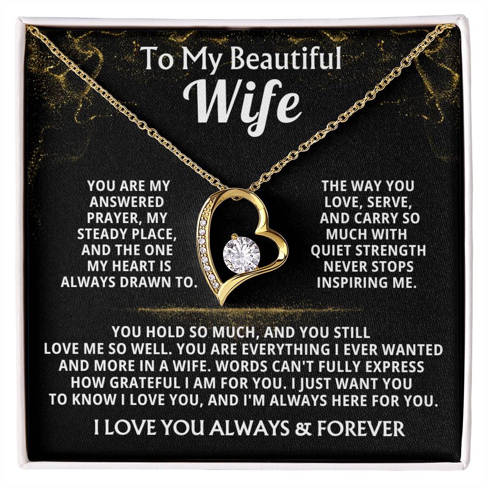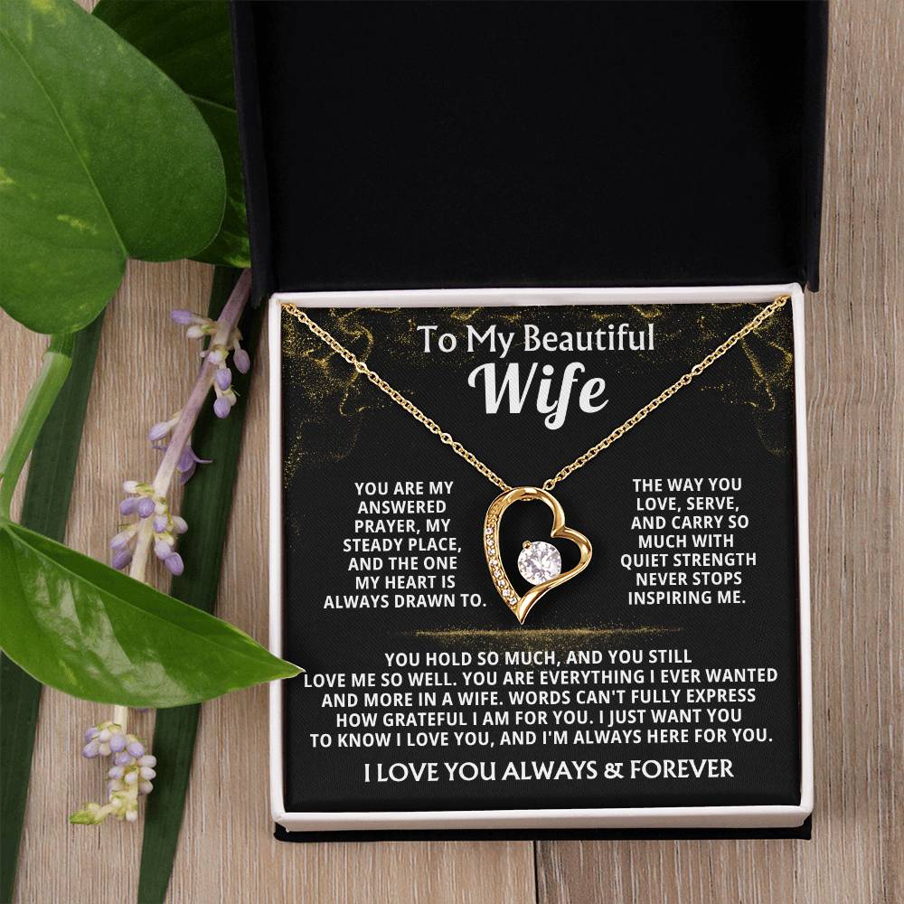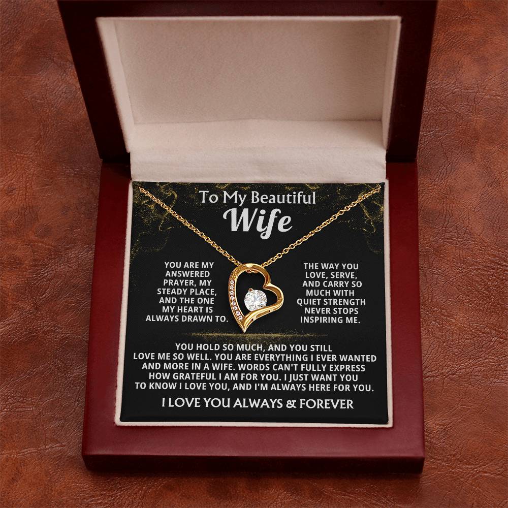 Quote On Card: To My Beautiful Wife, You are my answered prayer, my steady place, and the one my heart is always drawn to. The way you love, serve, and carry so much with quiet strength never stops inspiring me. You hold so much, and you still love me so well. You are everything I ever wanted and more in a wife. Words can't fully express how grateful I am for you. I just want you to know I love you, and I'm always here for you. I LOVE YOU ALWAYS & FOREVER