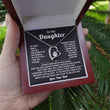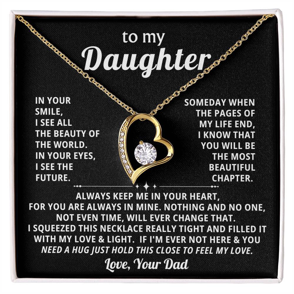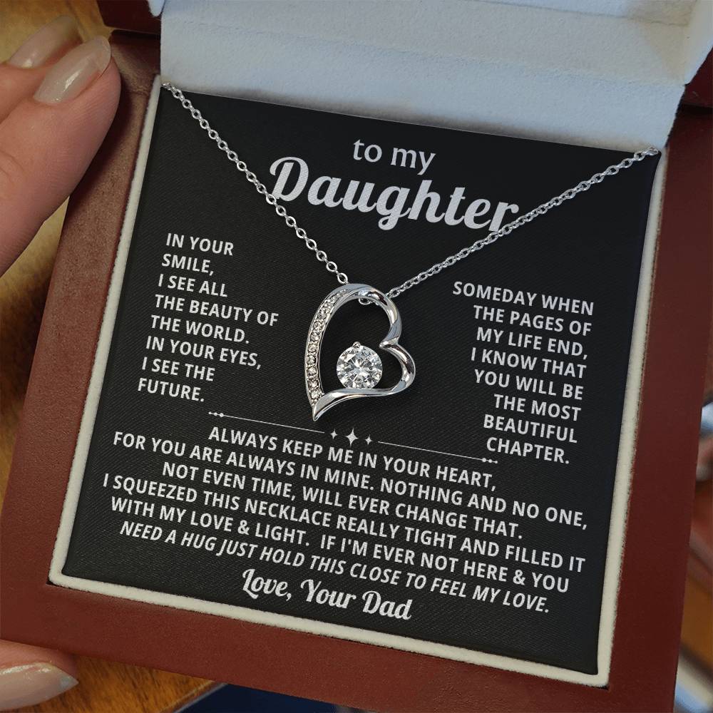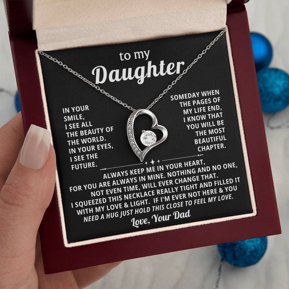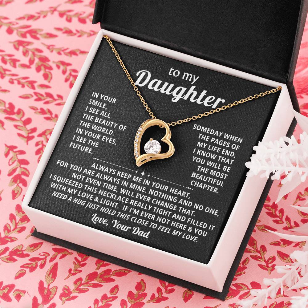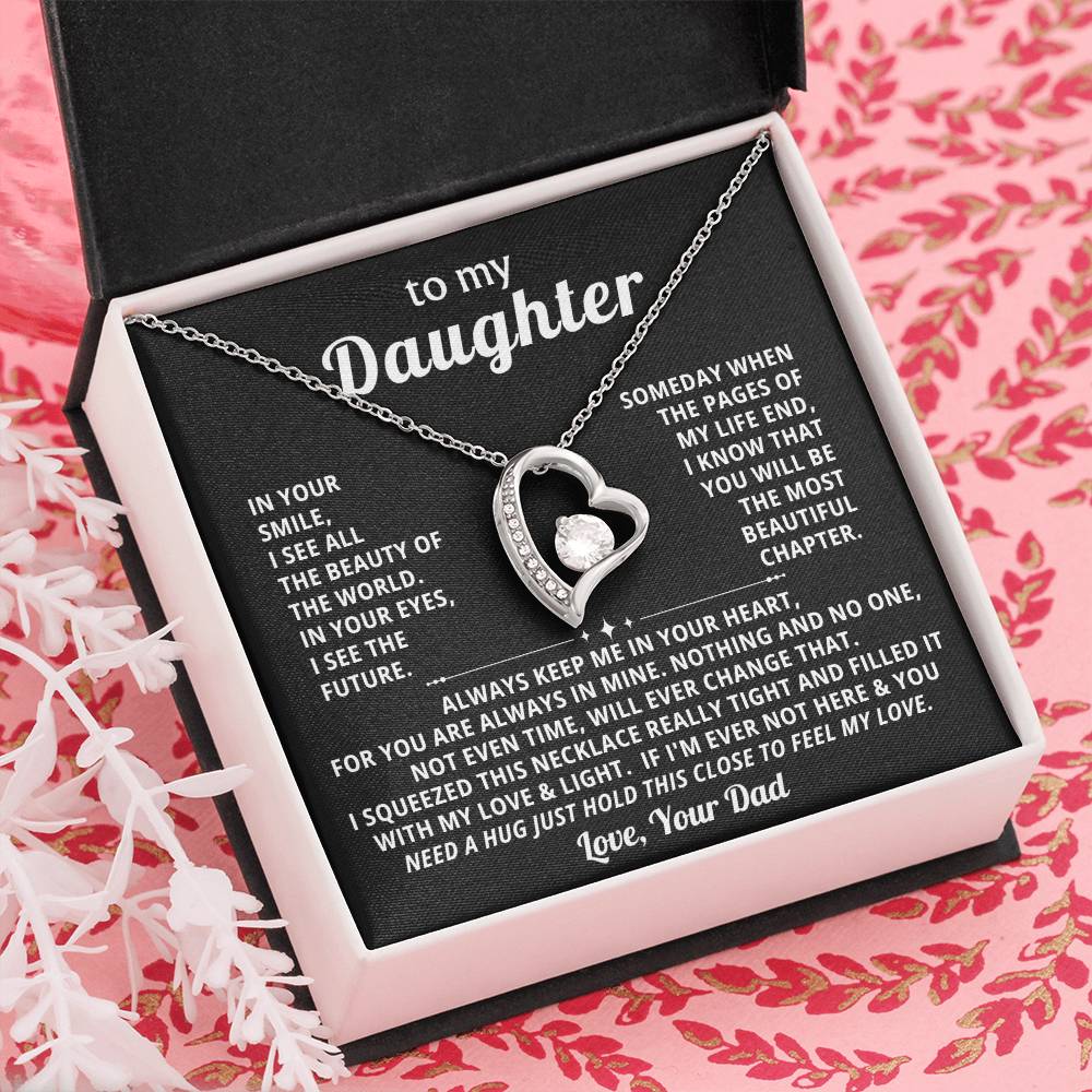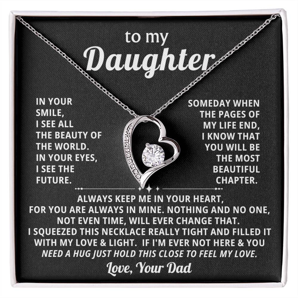 Quote On Card: To my beautiful Daughter. In your smile, I see all the beauty of the world. In your eyes, I see the future. Someday when the pages of my life end, I know that you will be the most beautiful chapter. Always keep me in your heart, for you are always in mine. Nothing and no one, not even time, will ever change that. I squeezed this necklace really tight and filled it with my love & light. If I'm ever not here & you need a hug just hold this close to feel my love.Love, Your Dad