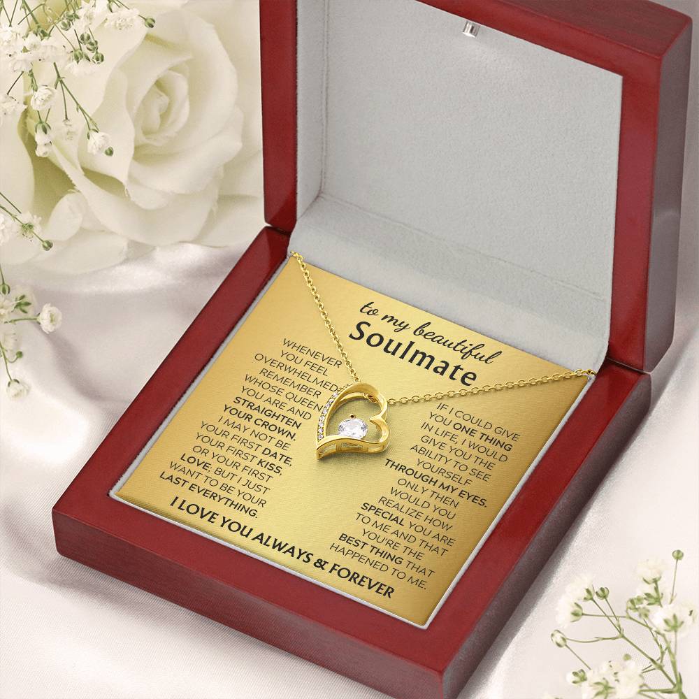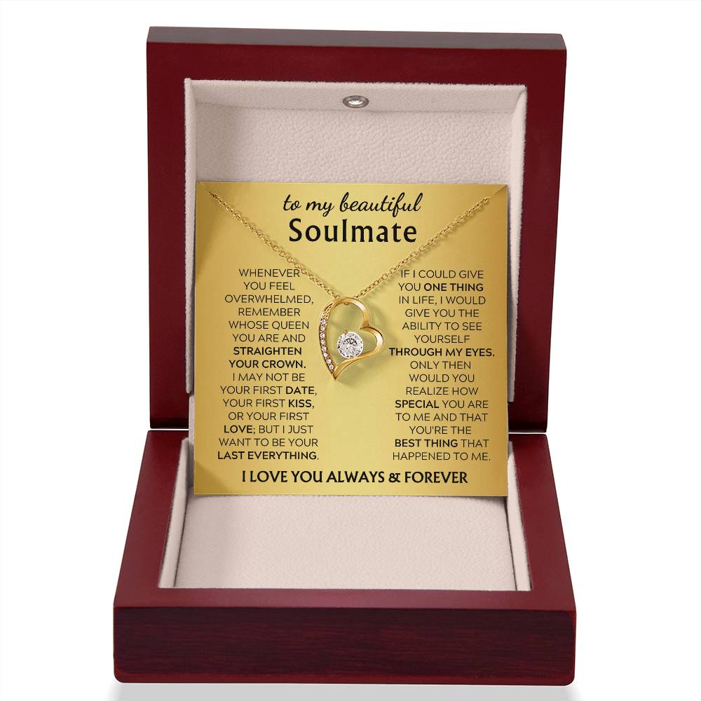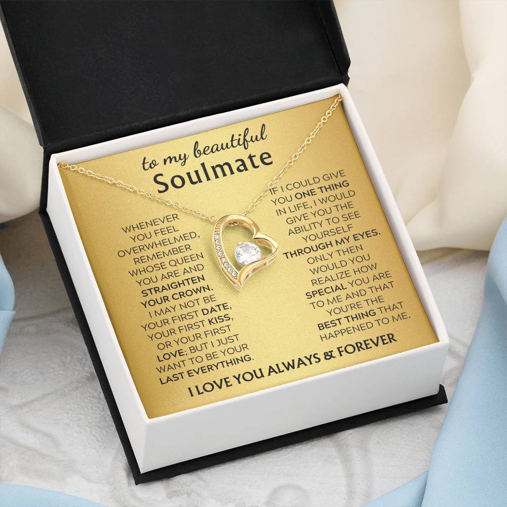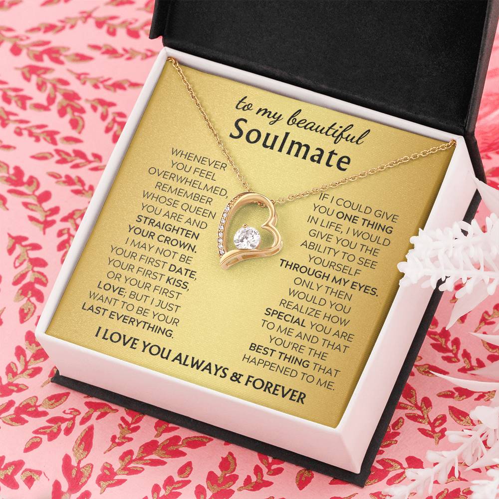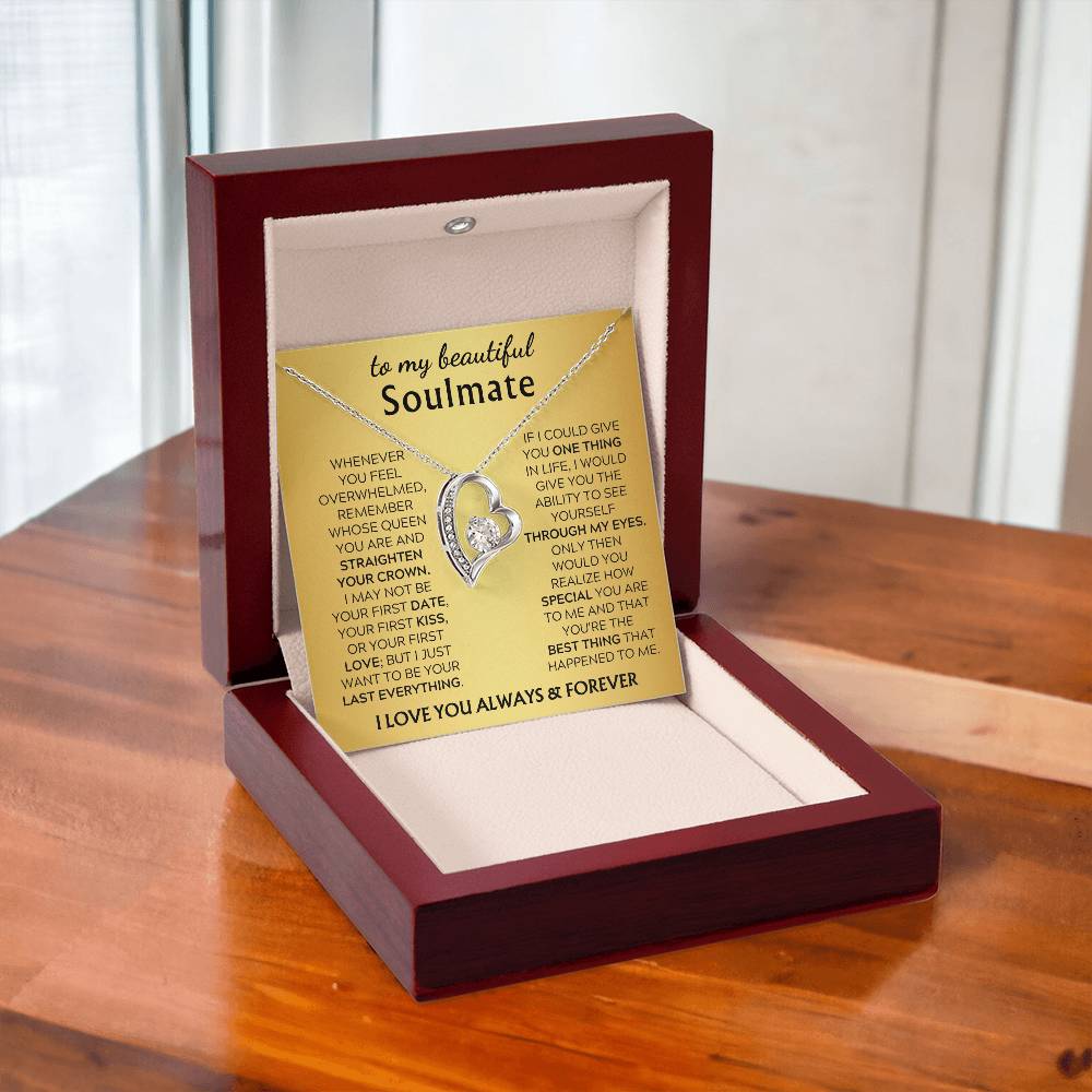 Quote On Card: To My Soulmate, WHENEVER YOU FEELOVERWHELMED, REMEMBER WHOSE QUEEN YOU ARE AND STRAIGHTEN YOUR CROWN. I MAY NOT BE YOUR FIRST DATE, YOUR FIRST KISS, OR YOUR FIRST LOVE; BUT I JUST WANT TO BE YOUR LAST EVERYTHING.IF I COULD GIVE YOU ONE THING IN LIFE, I WOULD GIVE YOU THE ABILITY TO SEE YOURSELF THROUGH MY EYES. ONLY THEN WOULD YOU REALIZE HOW SPECIAL YOU ARE TO ME AND THAT YOU'RE THE BEST THING THAT HAPPENED TO ME. I love you, forever and always.