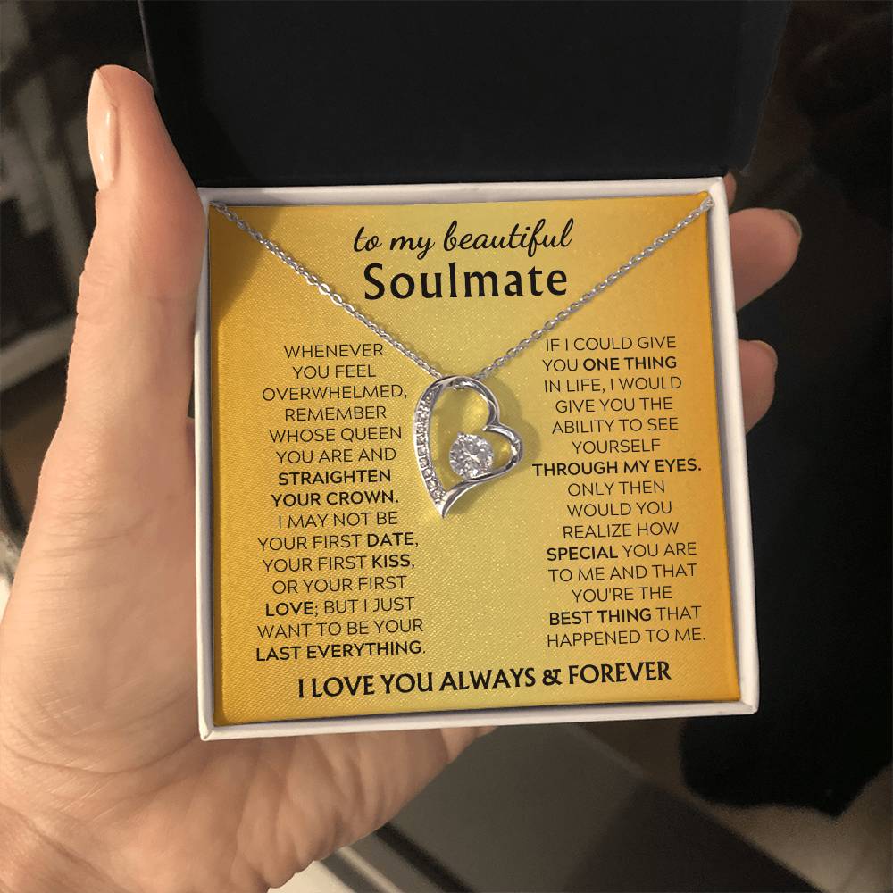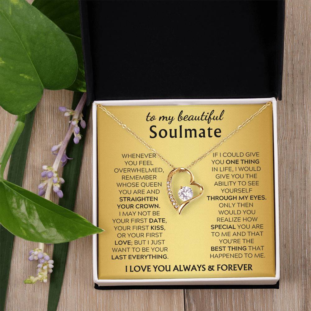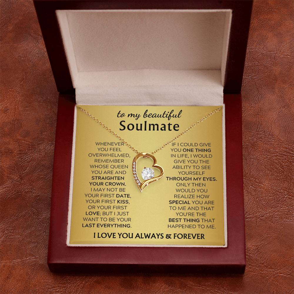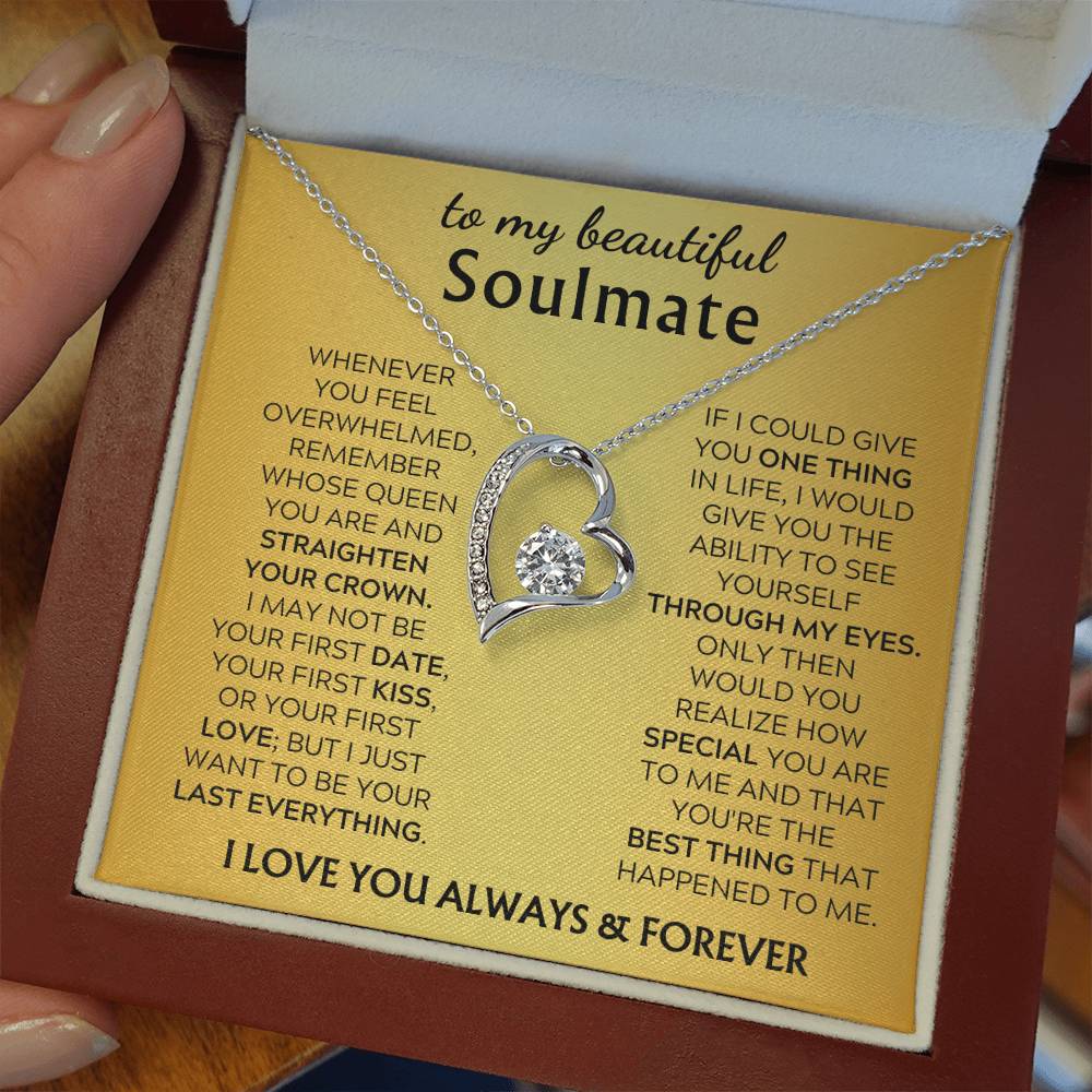 Quote On Card: To My Soulmate, WHENEVER YOU FEELOVERWHELMED, REMEMBER WHOSE QUEEN YOU ARE AND STRAIGHTEN YOUR CROWN. I MAY NOT BE YOUR FIRST DATE, YOUR FIRST KISS, OR YOUR FIRST LOVE; BUT I JUST WANT TO BE YOUR LAST EVERYTHING.IF I COULD GIVE YOU ONE THING IN LIFE, I WOULD GIVE YOU THE ABILITY TO SEE YOURSELF THROUGH MY EYES. ONLY THEN WOULD YOU REALIZE HOW SPECIAL YOU ARE TO ME AND THAT YOU'RE THE BEST THING THAT HAPPENED TO ME. I love you, forever and always.
