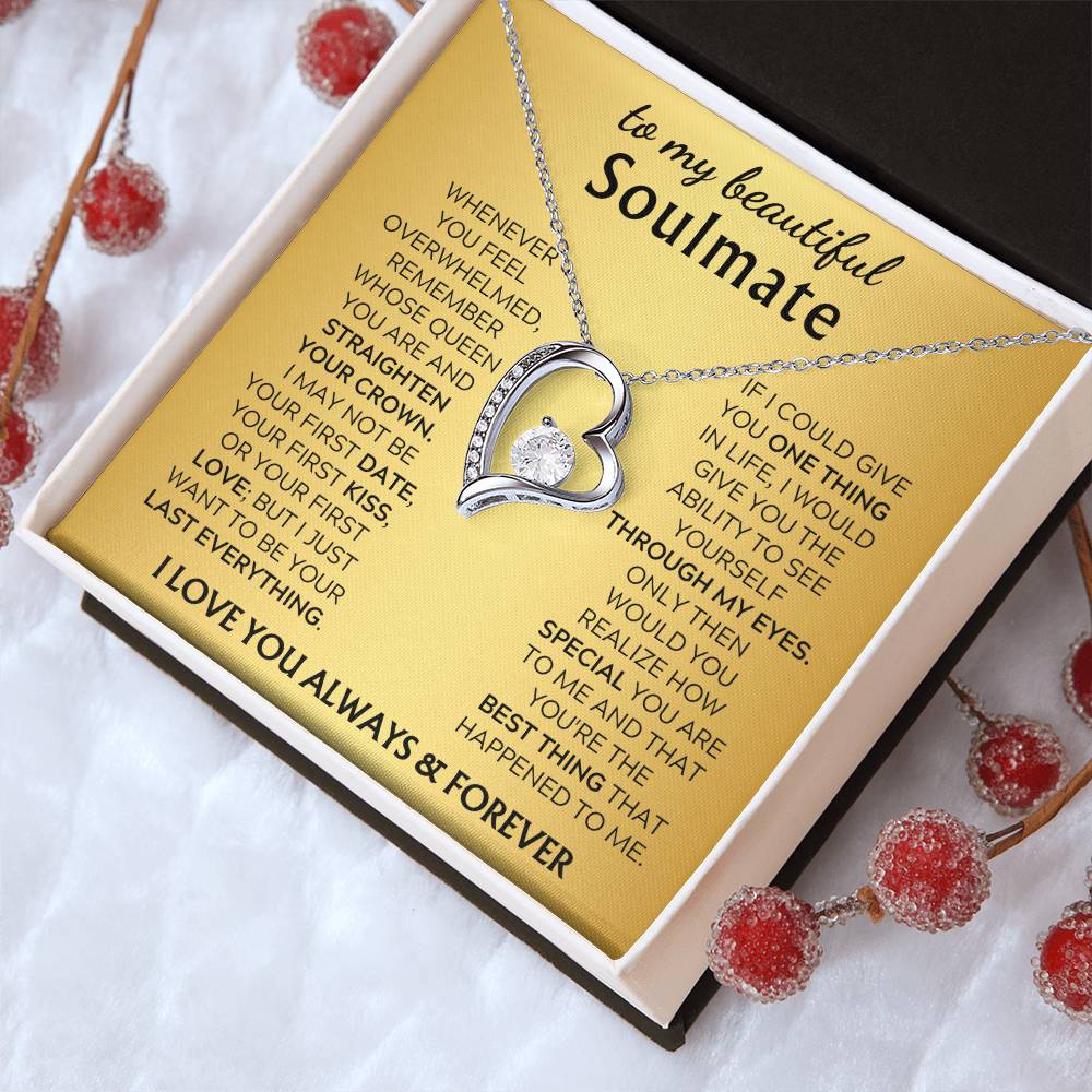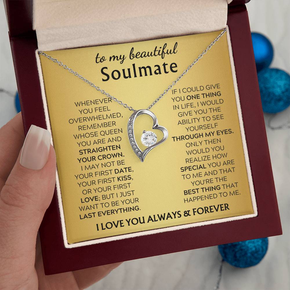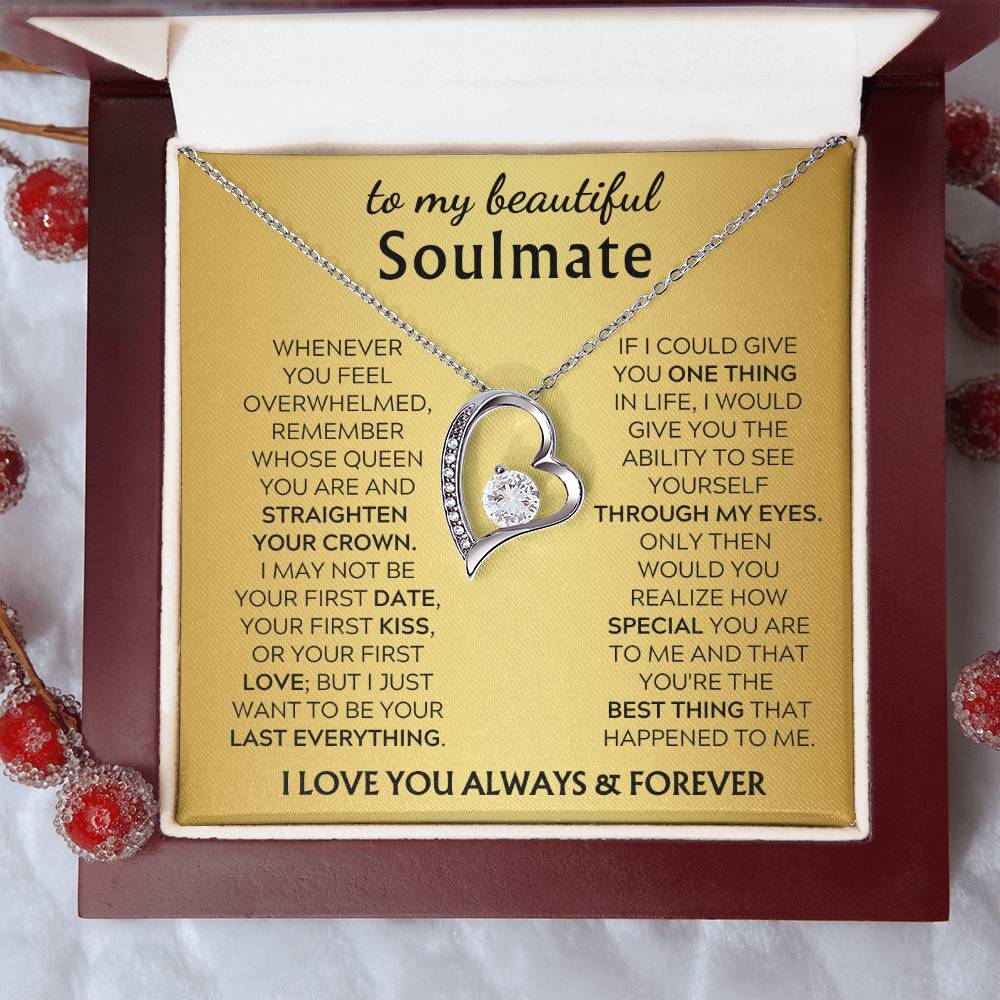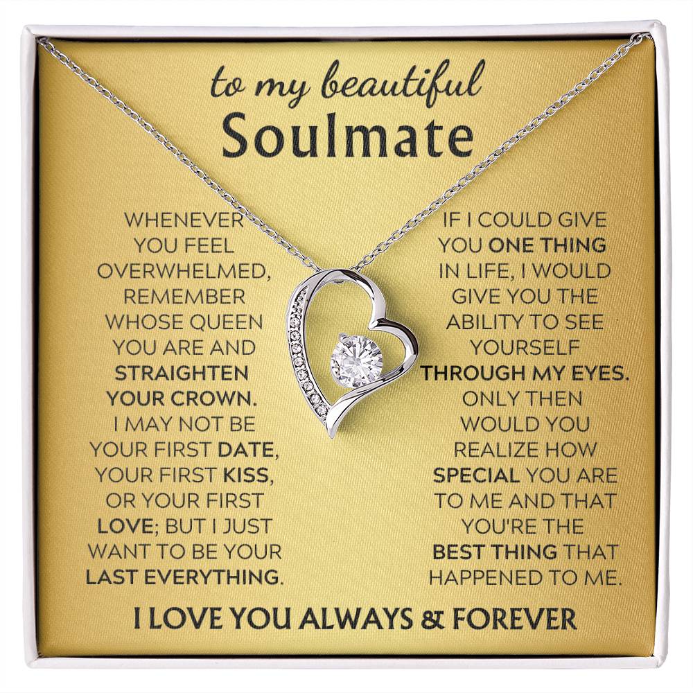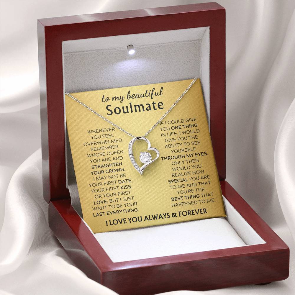 Quote On Card: To My Soulmate, WHENEVER YOU FEELOVERWHELMED, REMEMBER WHOSE QUEEN YOU ARE AND STRAIGHTEN YOUR CROWN. I MAY NOT BE YOUR FIRST DATE, YOUR FIRST KISS, OR YOUR FIRST LOVE; BUT I JUST WANT TO BE YOUR LAST EVERYTHING.IF I COULD GIVE YOU ONE THING IN LIFE, I WOULD GIVE YOU THE ABILITY TO SEE YOURSELF THROUGH MY EYES. ONLY THEN WOULD YOU REALIZE HOW SPECIAL YOU ARE TO ME AND THAT YOU'RE THE BEST THING THAT HAPPENED TO ME. I love you, forever and always.