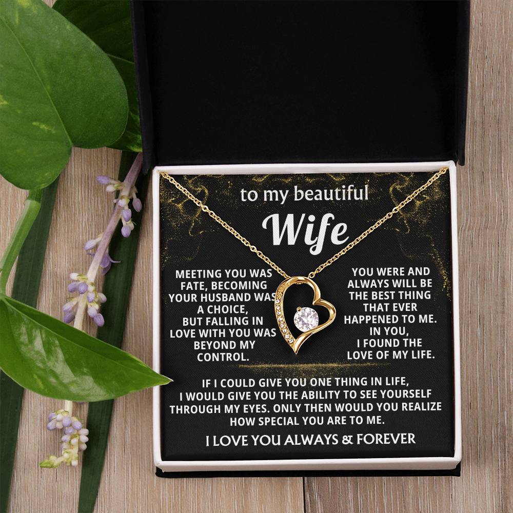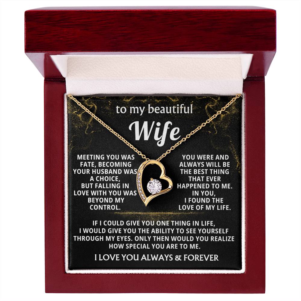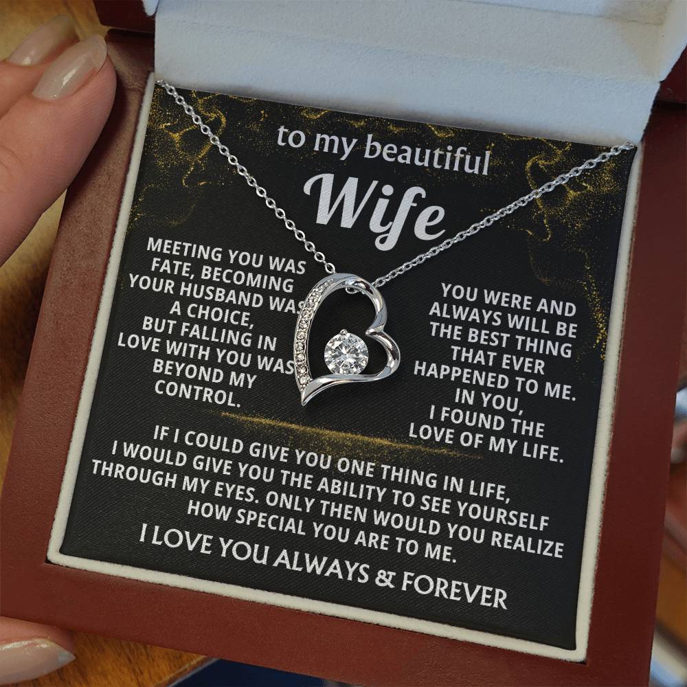 Quote On Card: TO MY BEAUTIFUL WIFE , Meeting you was fate, becoming your husband was a choice, but falling in love with you was beyond my control. You were and always will be the best thing that ever happened to me. In you, I found the love of my life. If I could only give you one thing in this life. I'd give you the ability to see for yourself how I see you, your beauty, how happy you make me, and how proud I am to be yours. Only then would you realize just how special you are to me. I LOVE YOU ALWAYS & FOREVER