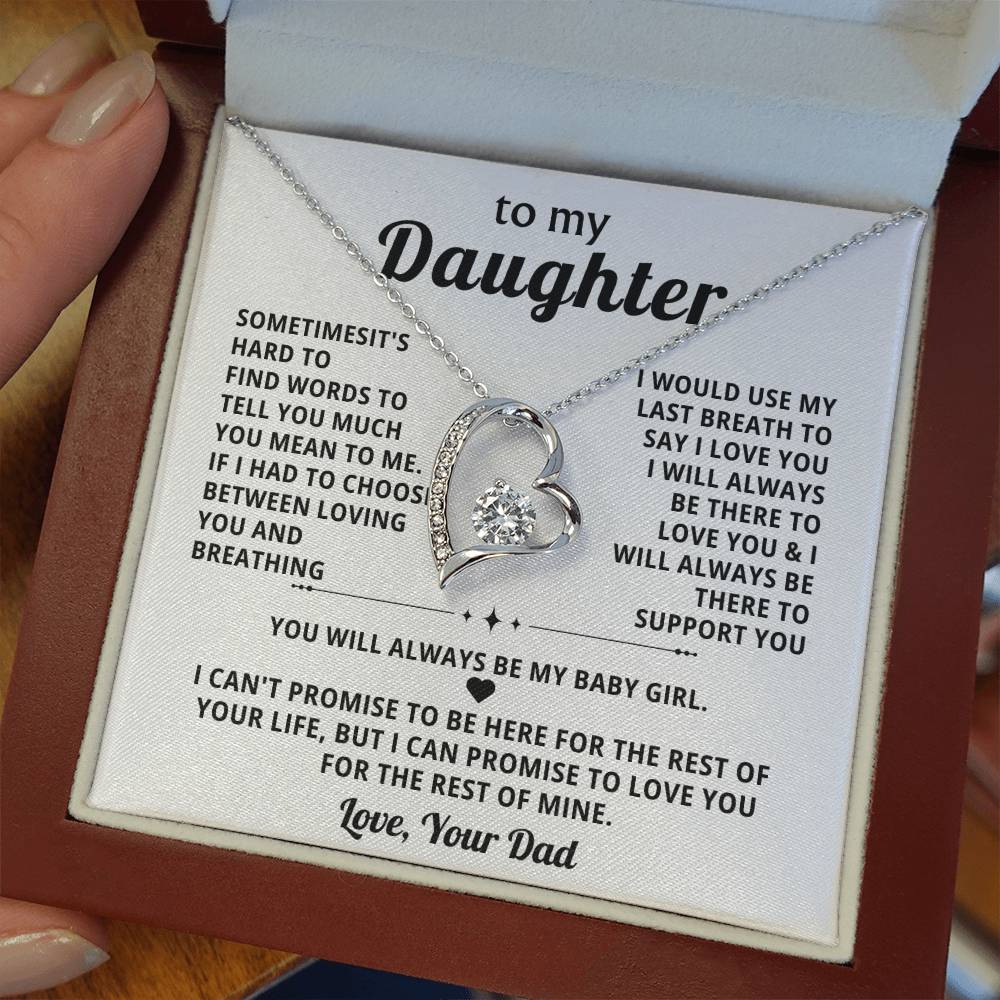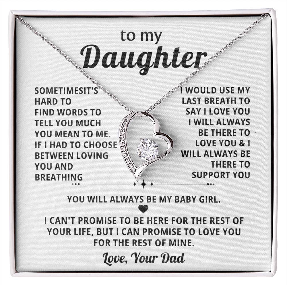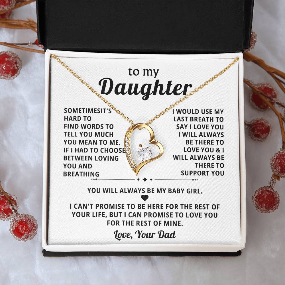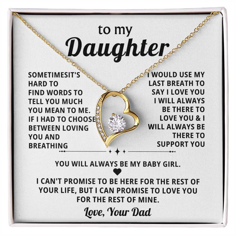 Quote On Card: To My Daughter, SOMETIMES IT'S HARD TO FIND WORDS TO TELL YOU MUCH YOU MEAN TO ME. IF I HAD TO CHOOSE BETWEEN LOVING YOU AND BREATHING .I WOULD USE MY LAST BREATH TO SAY I LOVE YOU . I WILL ALWAYS BE THERE TO LOVE YOU &I WILL ALWAYS BE THERE TO SUPPORT YOU YOU WILL ALWAYS BE MY BABY GIRL. I CAN'T PROMISE TO BE HERE FOR THE REST OF YOUR LIFE, BUT I CAN PROMISE TO LOVE YOU FOR THE REST OF MINE. Love, Your Dad