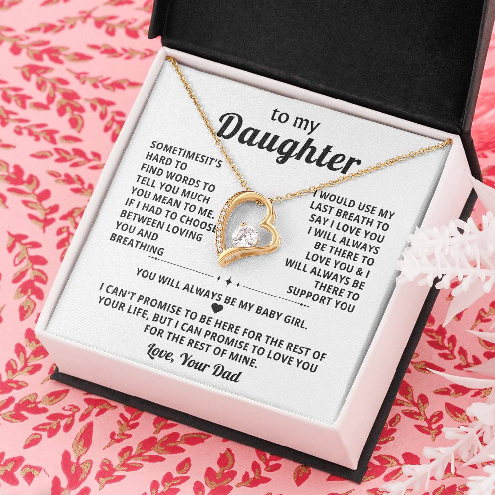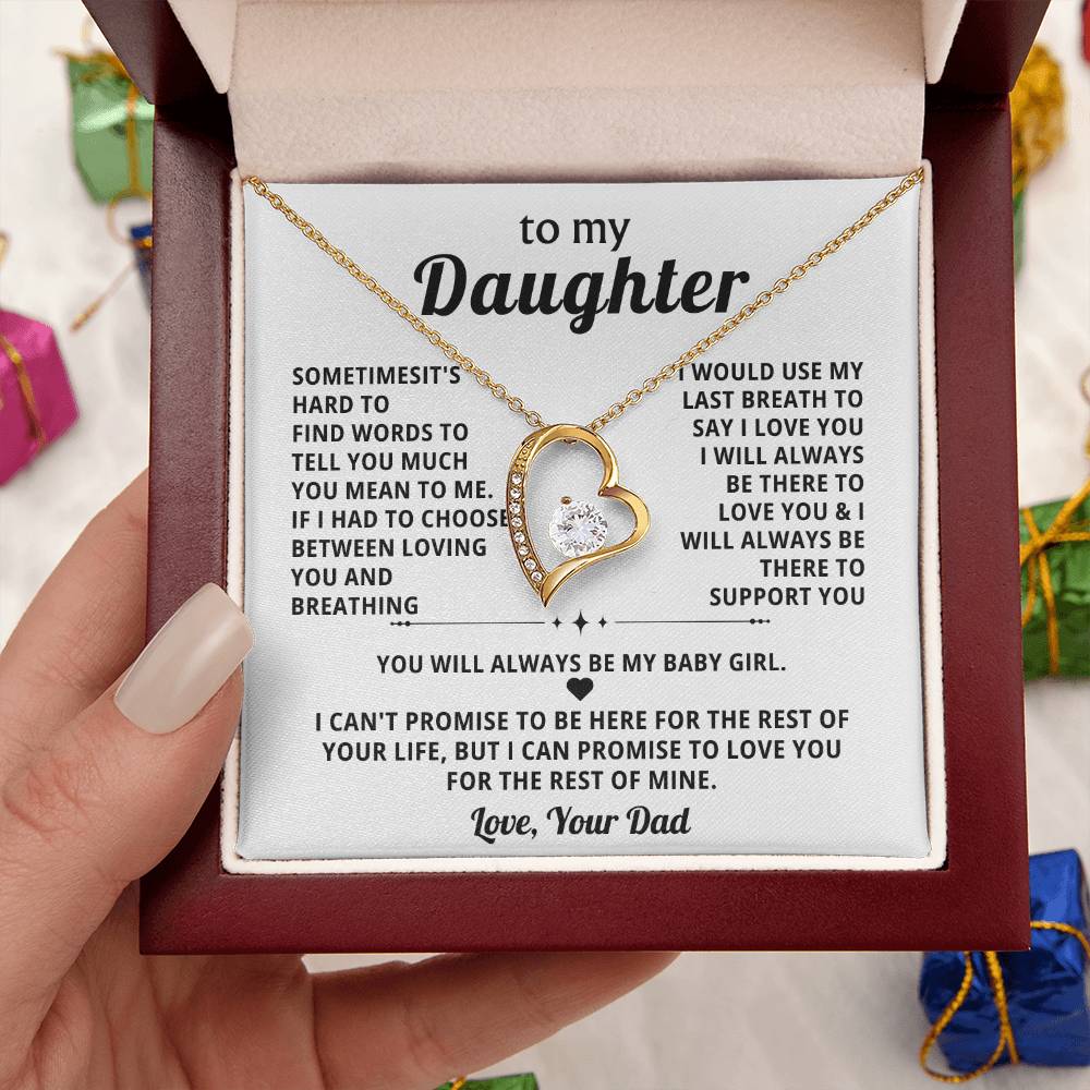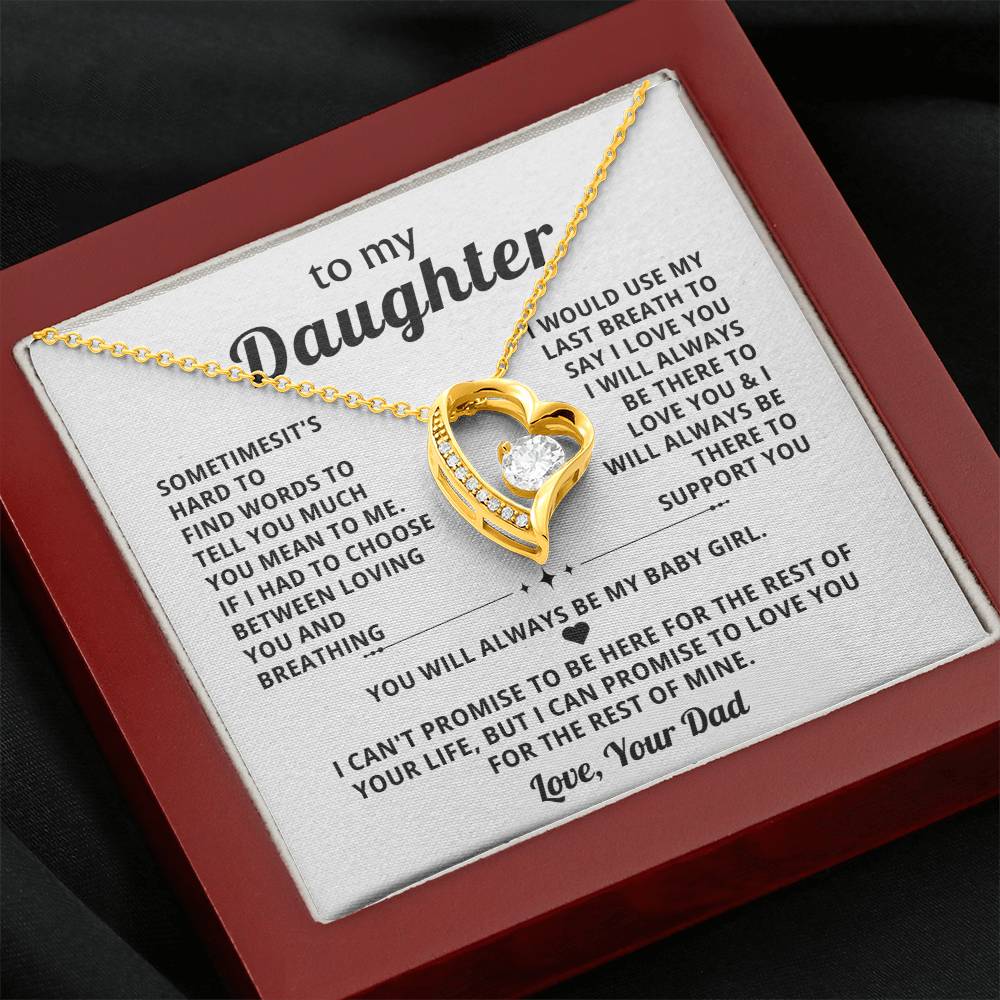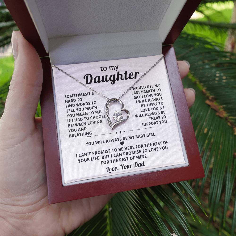 Quote On Card: To My Daughter, SOMETIMES IT'S HARD TO FIND WORDS TO TELL YOU MUCH YOU MEAN TO ME. IF I HAD TO CHOOSE BETWEEN LOVING YOU AND BREATHING .I WOULD USE MY LAST BREATH TO SAY I LOVE YOU . I WILL ALWAYS BE THERE TO LOVE YOU &I WILL ALWAYS BE THERE TO SUPPORT YOU YOU WILL ALWAYS BE MY BABY GIRL. I CAN'T PROMISE TO BE HERE FOR THE REST OF YOUR LIFE, BUT I CAN PROMISE TO LOVE YOU FOR THE REST OF MINE. Love, Your Dad