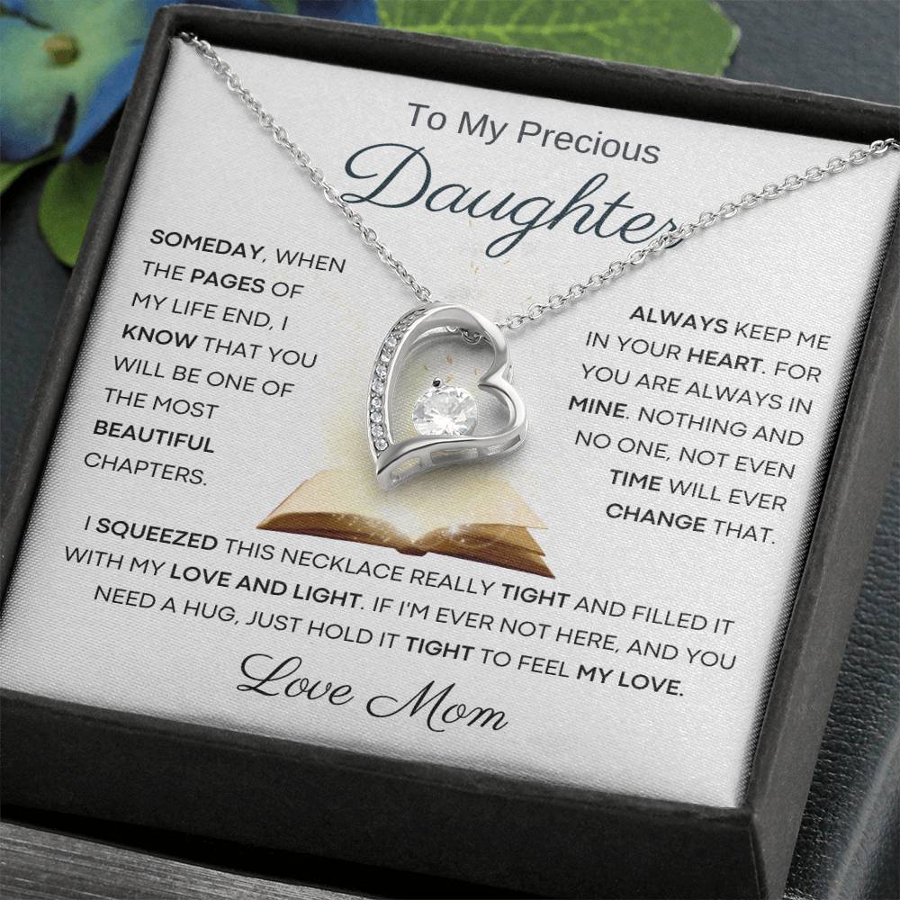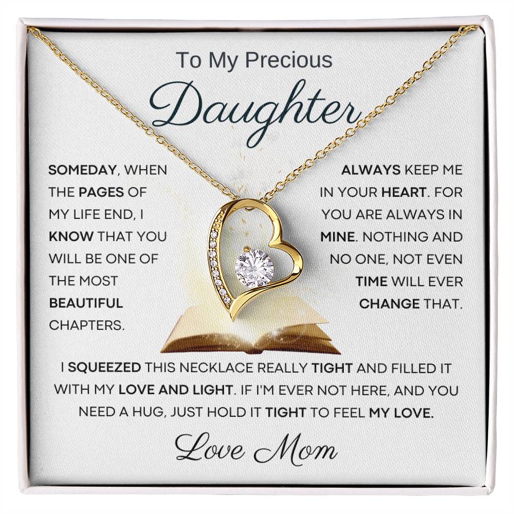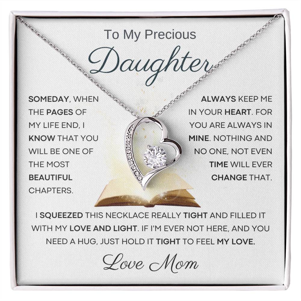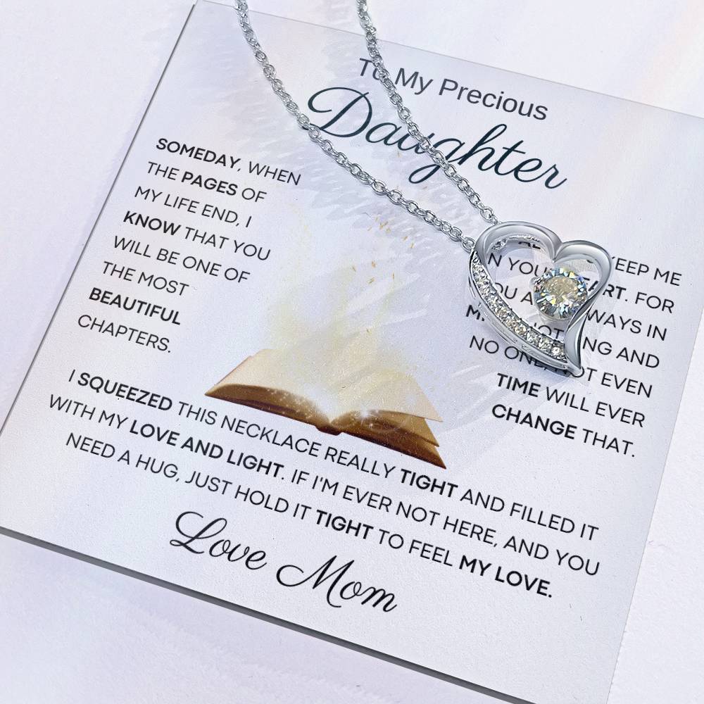 Quote On Card: To My Beautiful Daughter , Someday, When The Pages Of My Life End, I Know That You Will Be One Of The Most Beautiful Chapters. Always Keep Me In Your Heart. For You Are Always In Mine. Nothing And No One, Not Even Time Will Ever Change That .I Squeezed This Necklace Really Tight And Filled It With My Love, And Light. If I'm Ever Not Here, And You Need A Hug, Just Hold It Tight To Feel My Love. I Love You