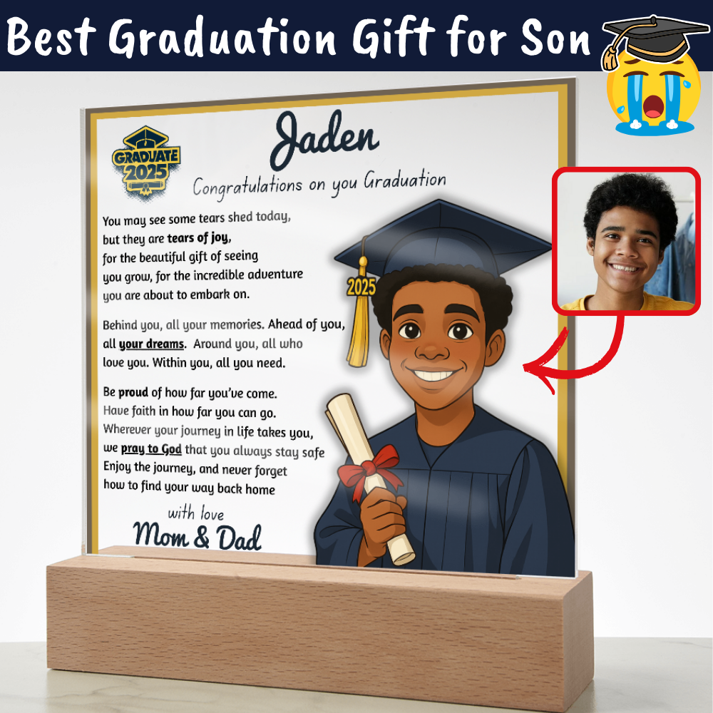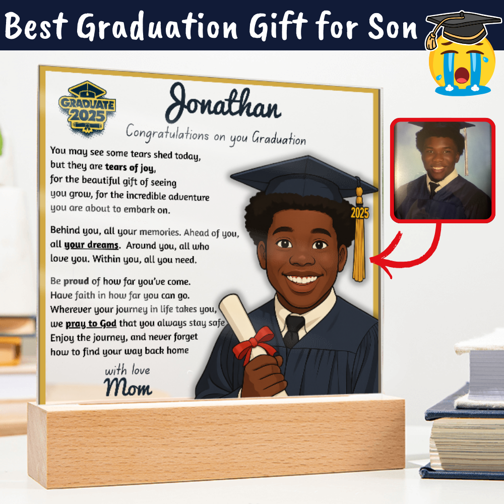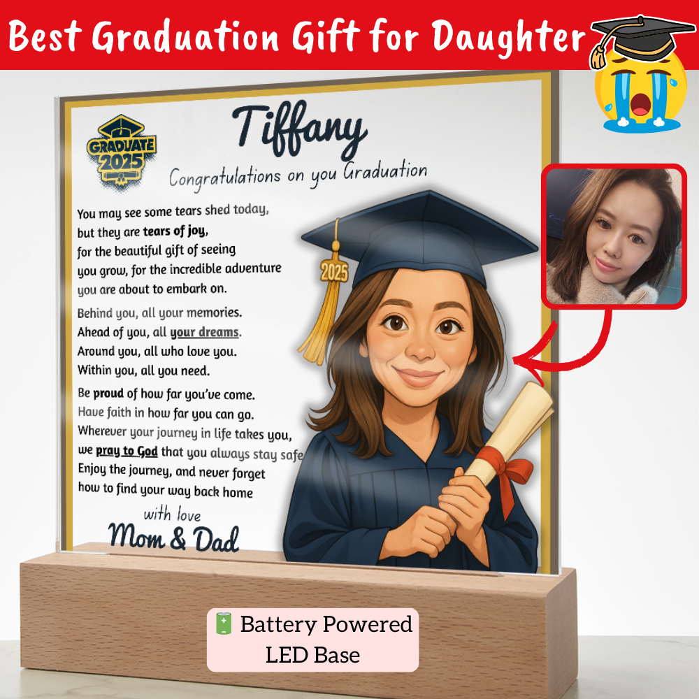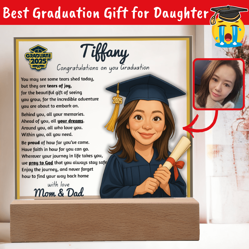 Make their graduation unforgettable with a beautiful, personalized acrylic plaque—featuring their name, outfit, skin tone, and a touching message. Crafted from premium crystal-clear acrylic and paired with a solid wooden base, it’s a keepsake they’ll display proudly for years.