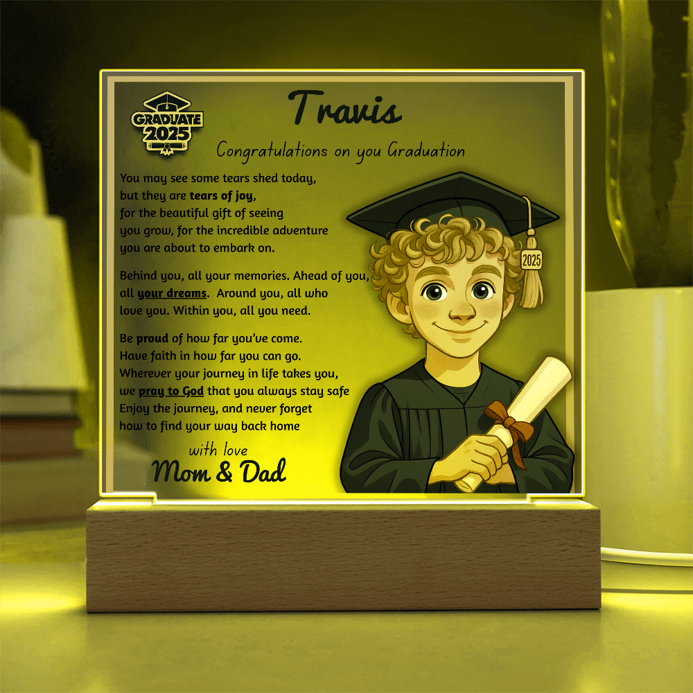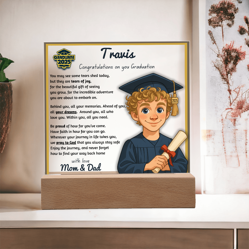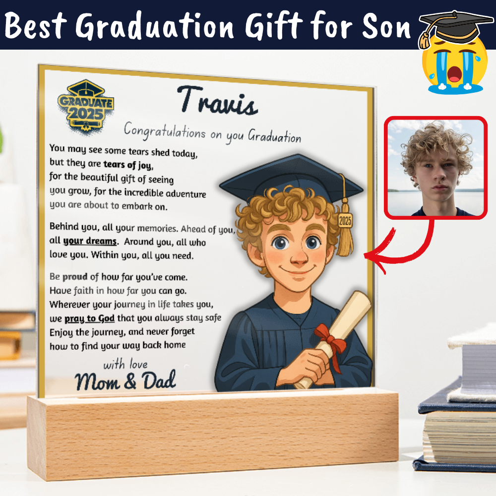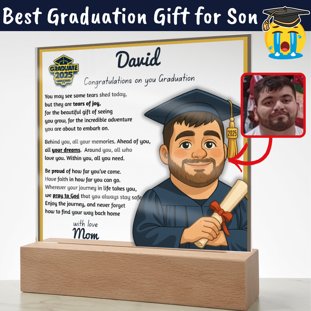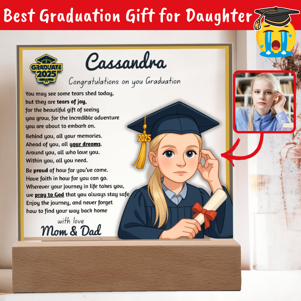 Make their graduation unforgettable with a beautiful, personalized acrylic plaque—featuring their name, outfit, skin tone, and a touching message. Crafted from premium crystal-clear acrylic and paired with a solid wooden base, it’s a keepsake they’ll display proudly for years.