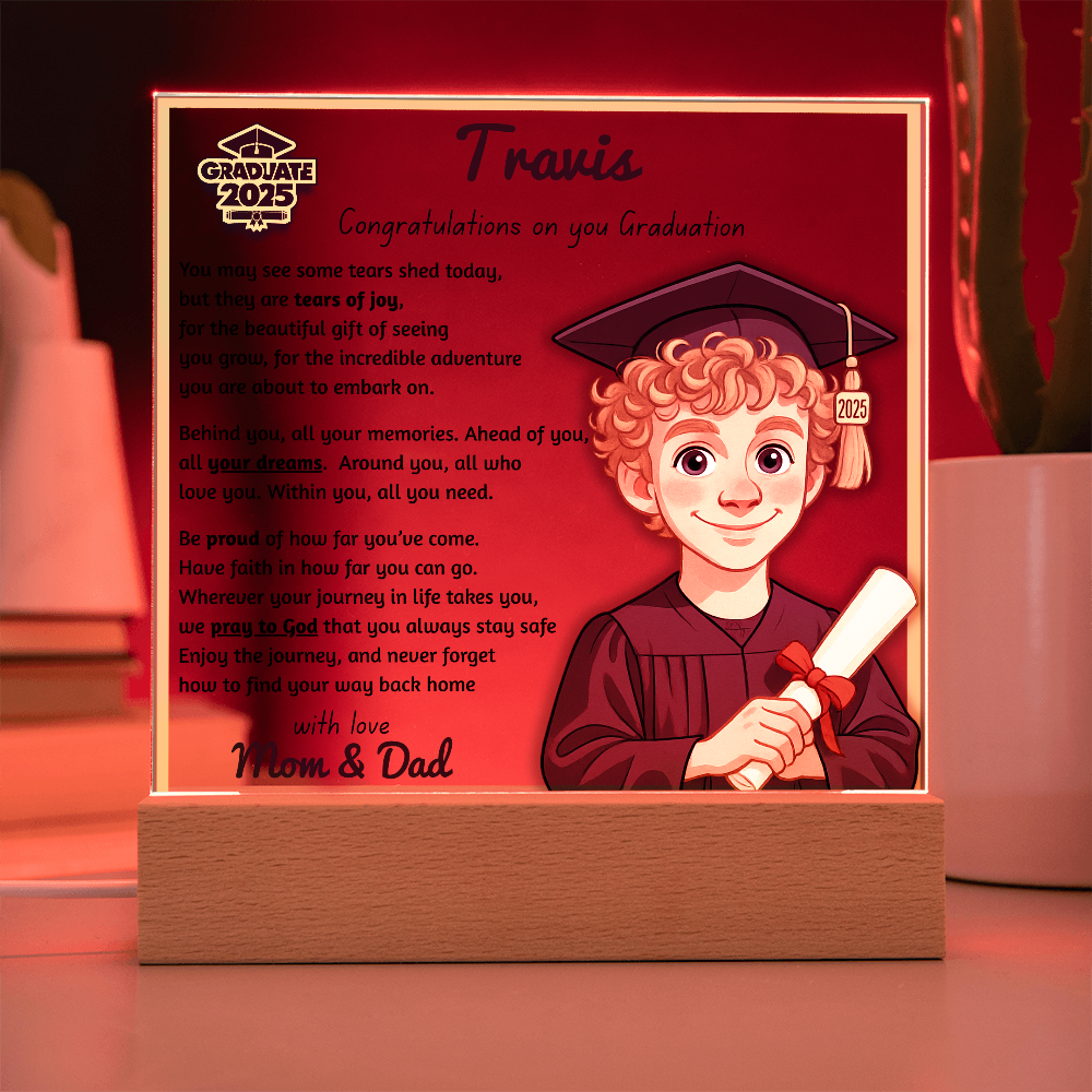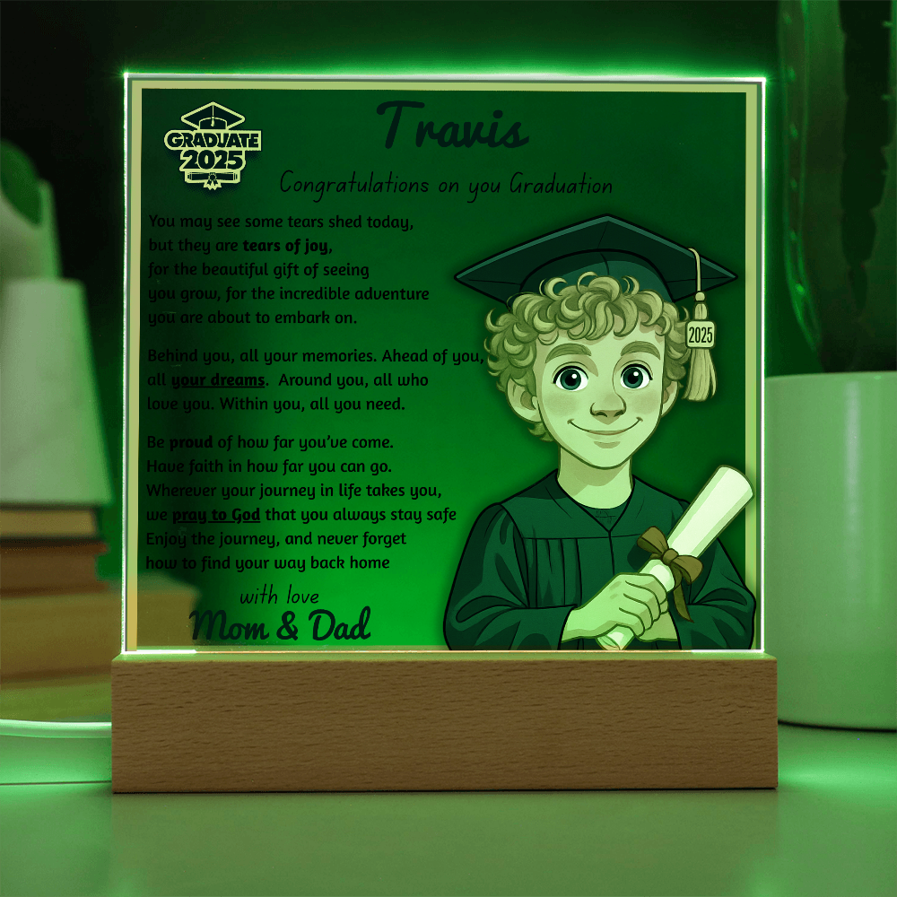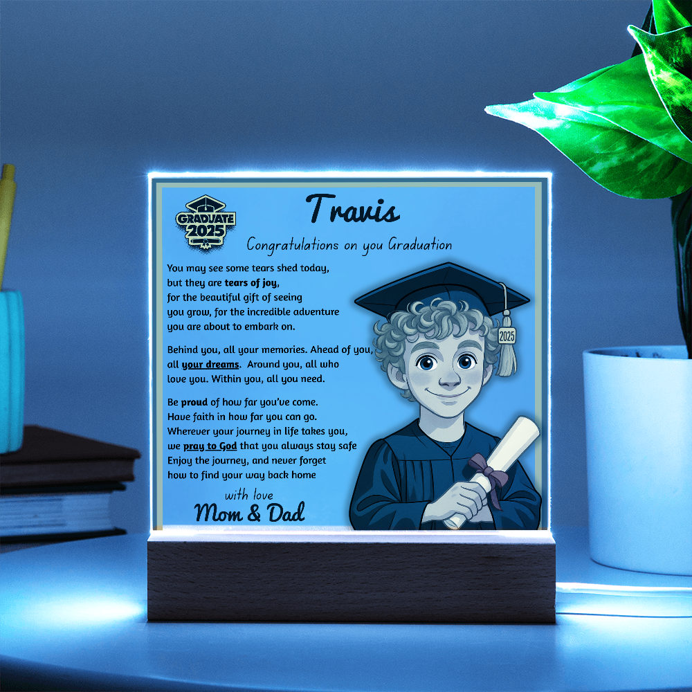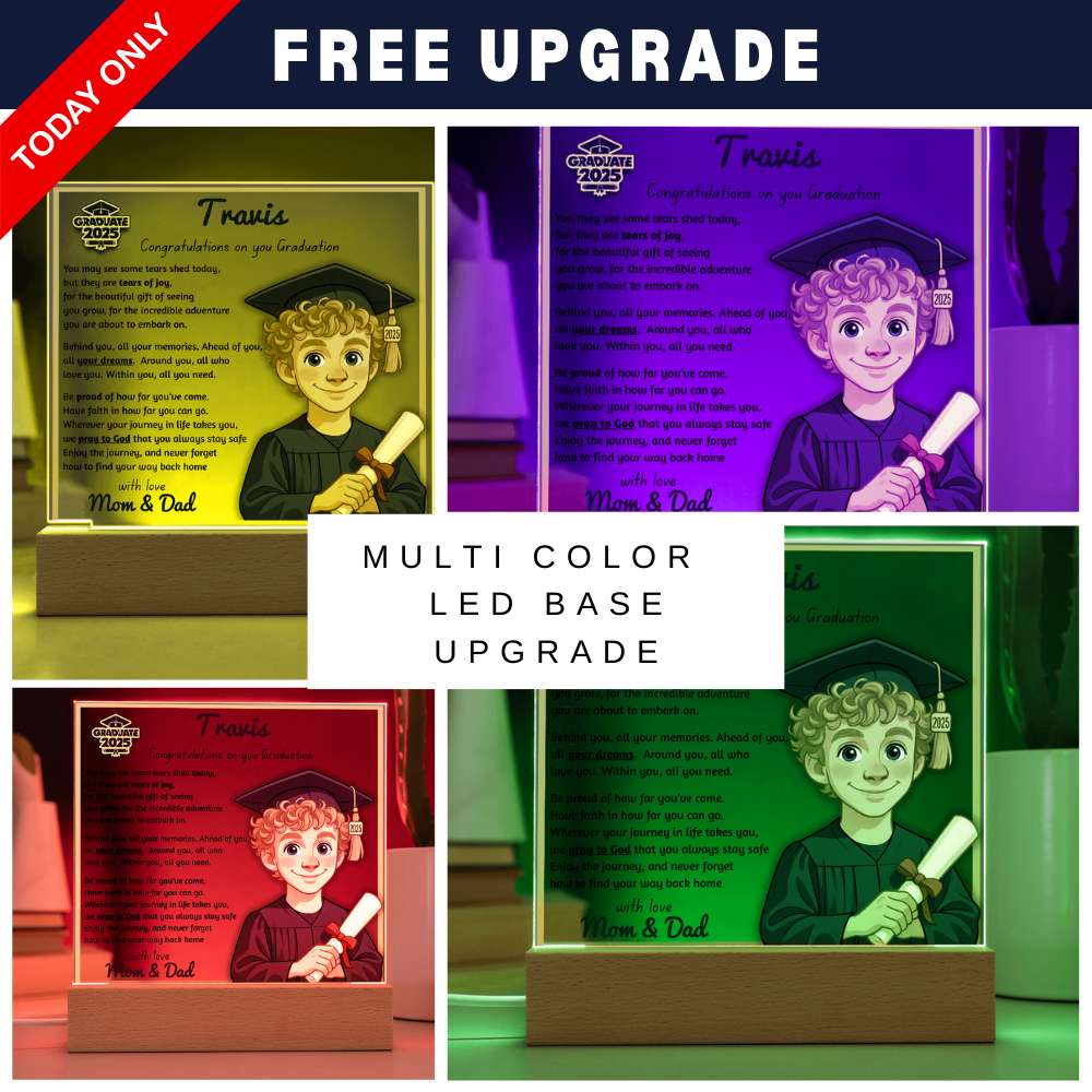 Make their graduation unforgettable with a beautiful, personalized acrylic plaque—featuring their name, outfit, skin tone, and a touching message. Crafted from premium crystal-clear acrylic and paired with a solid wooden base, it’s a keepsake they’ll display proudly for years.