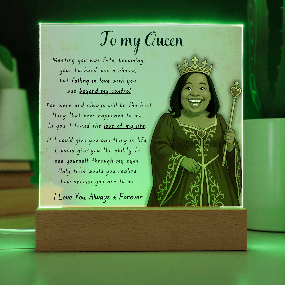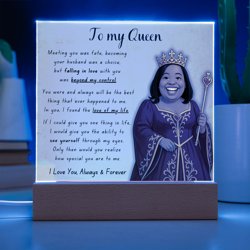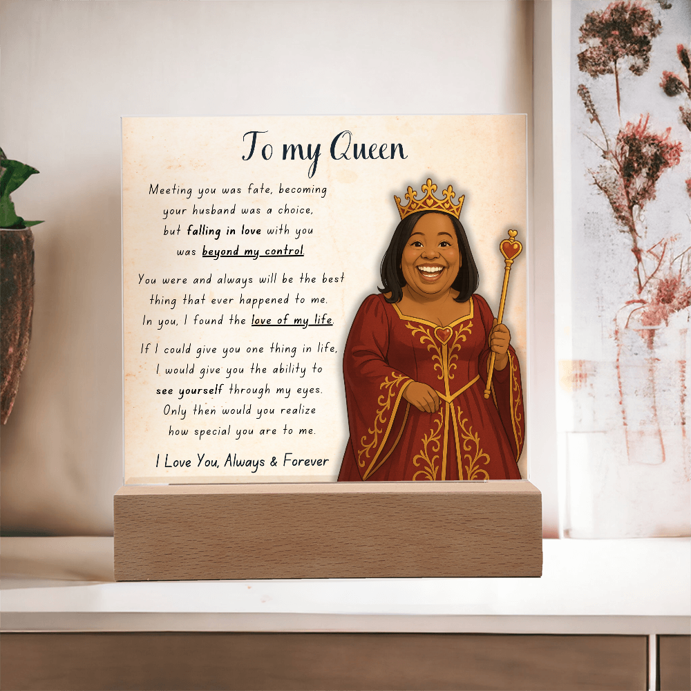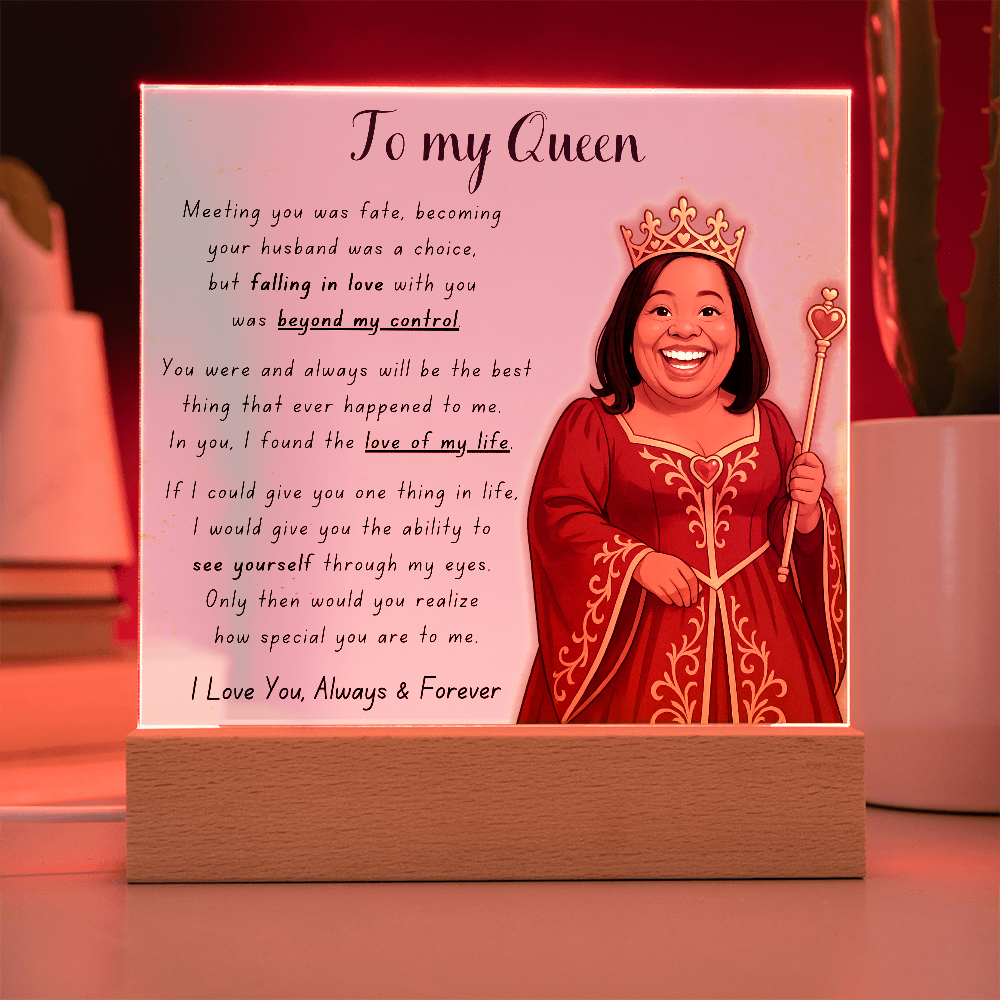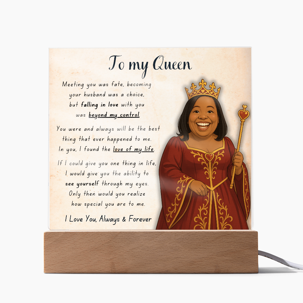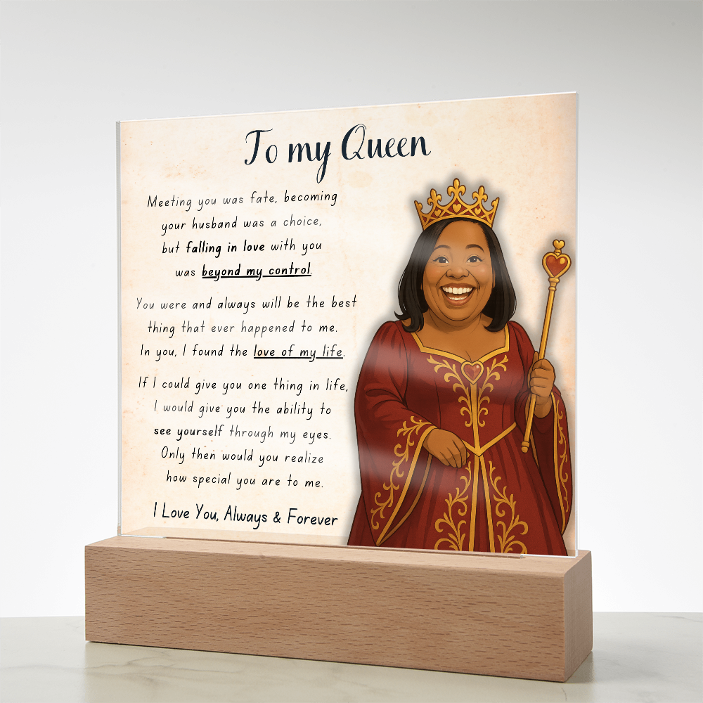 Celebrate your love story with a beautifully personalized acrylic plaque that honors your queen. This unique keepsake features a charming cartoon-style illustration of your wife as a radiant queenβcomplete with crown and scepterβand a heartfelt message sheβll never forget.