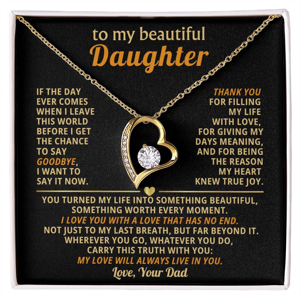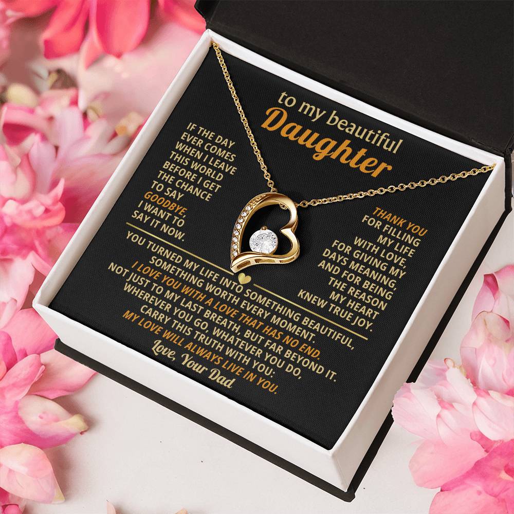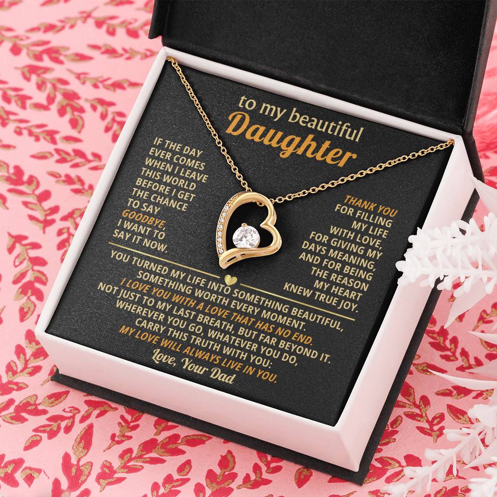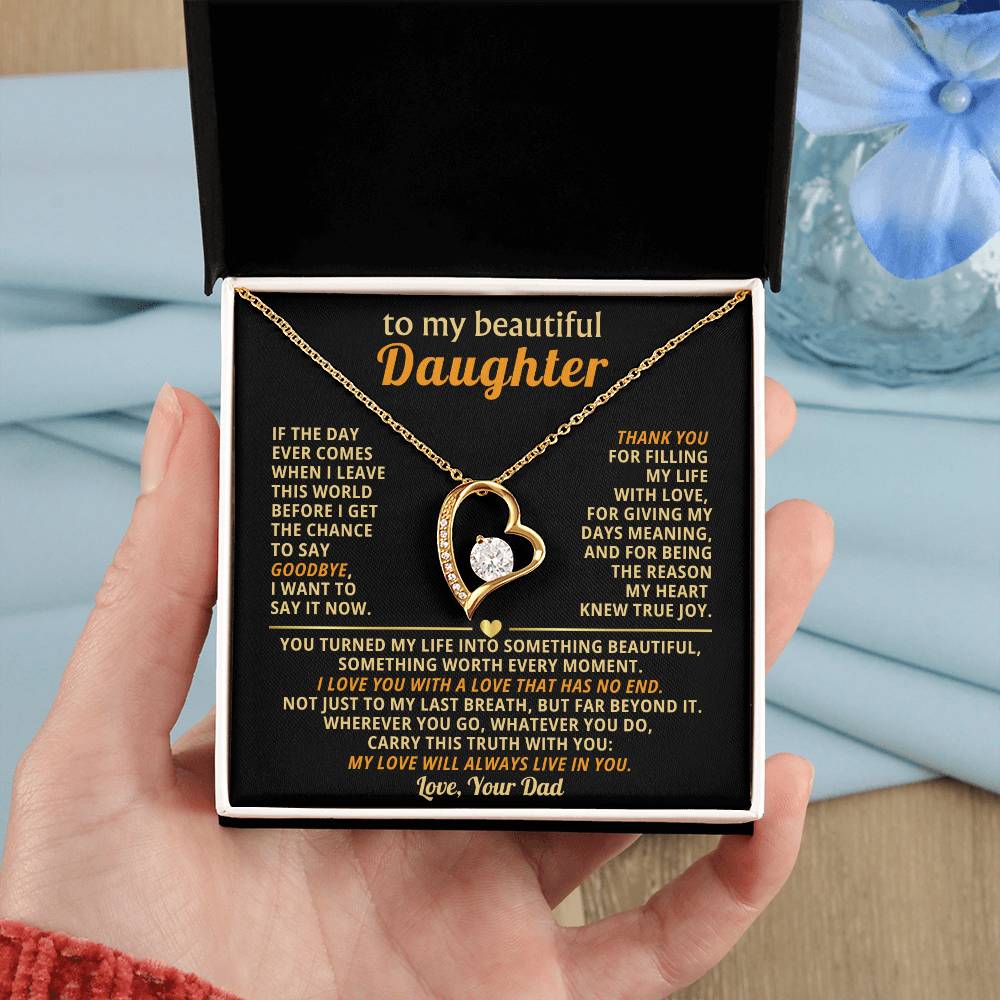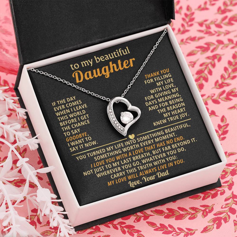 Quote On Card: TO MY BEAUTIFUL DAUGHTER, If the day ever comes when I leave this world before I get the chance to say goodbye, I want to say it now. Thank you for filling my life with love, for giving my days meaning, and for being the reason my heart knew true joy. You turned my life into something beautiful, something worth every moment. I love you with a love that has no end. Not just to my last breath, but far beyond it. Wherever you go, whatever you do, carry this truth with you: my love will always live in you. Love Your Dad