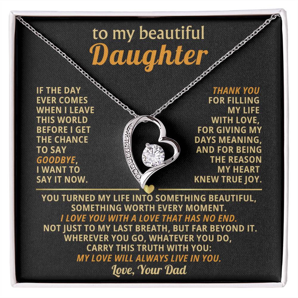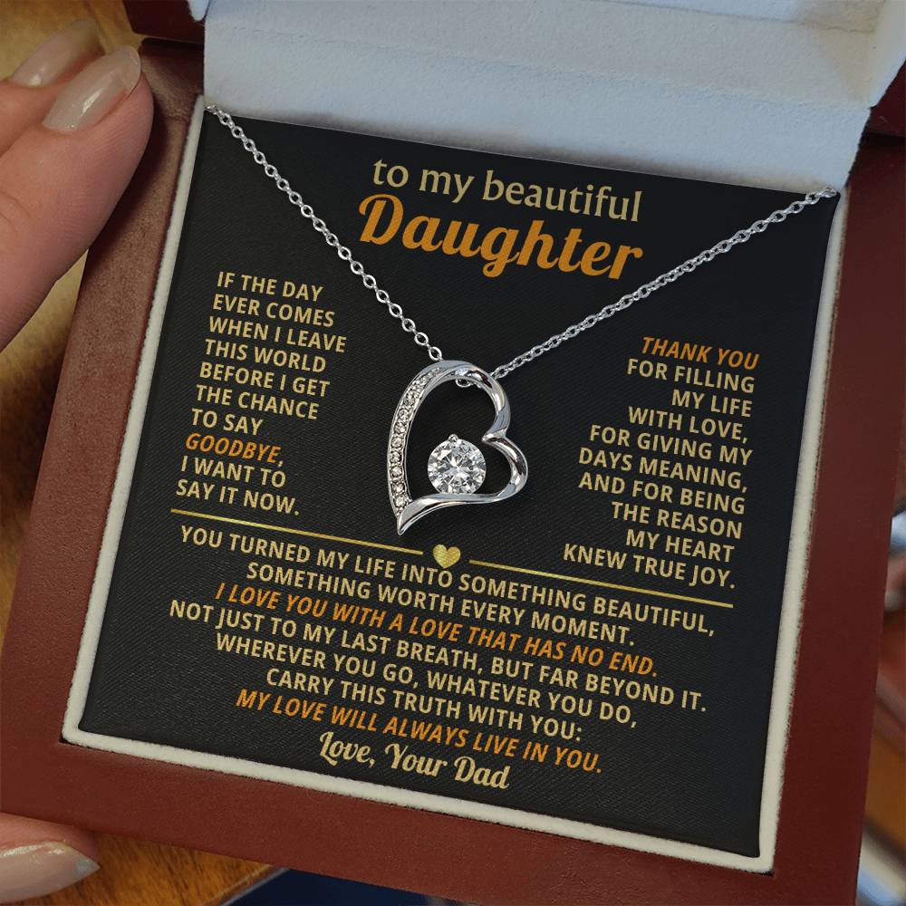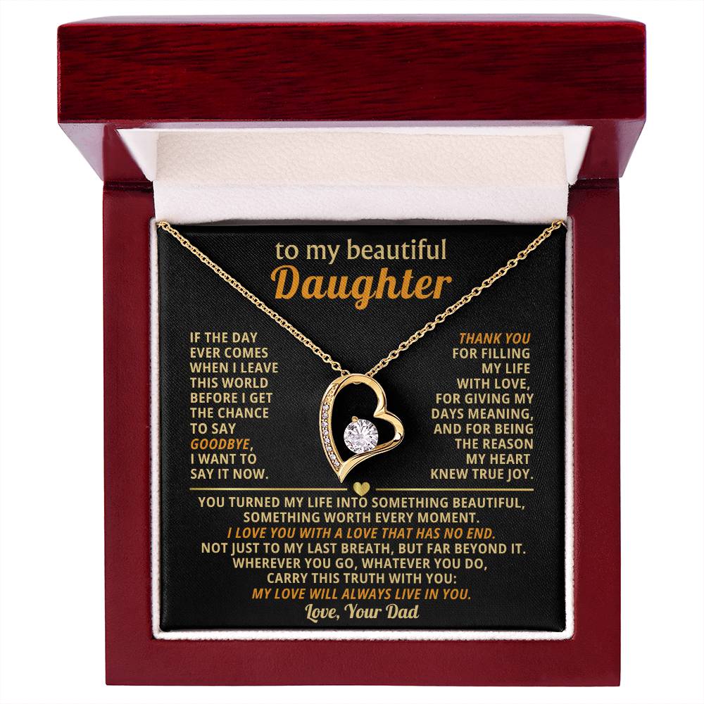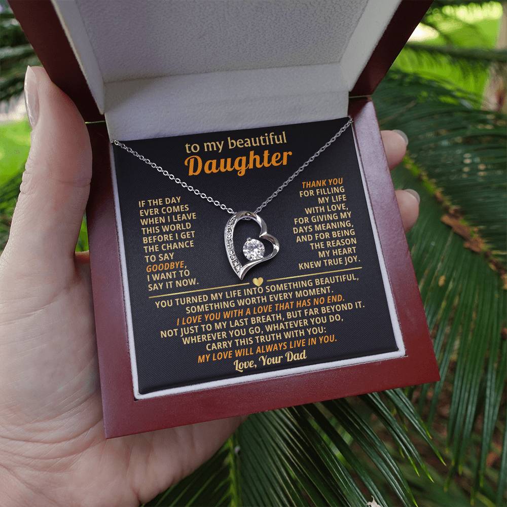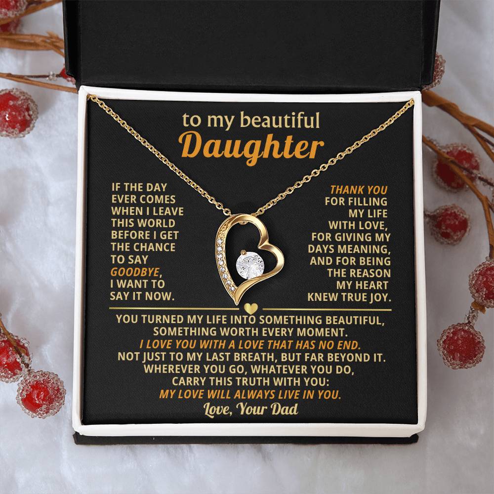 Quote On Card: TO MY BEAUTIFUL DAUGHTER, If the day ever comes when I leave this world before I get the chance to say goodbye, I want to say it now. Thank you for filling my life with love, for giving my days meaning, and for being the reason my heart knew true joy. You turned my life into something beautiful, something worth every moment. I love you with a love that has no end. Not just to my last breath, but far beyond it. Wherever you go, whatever you do, carry this truth with you: my love will always live in you. Love Your Dad