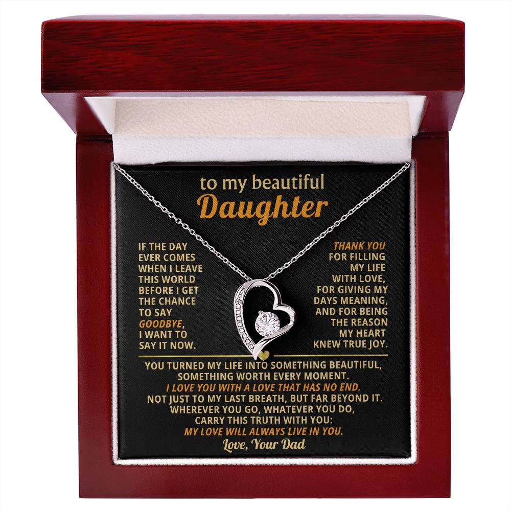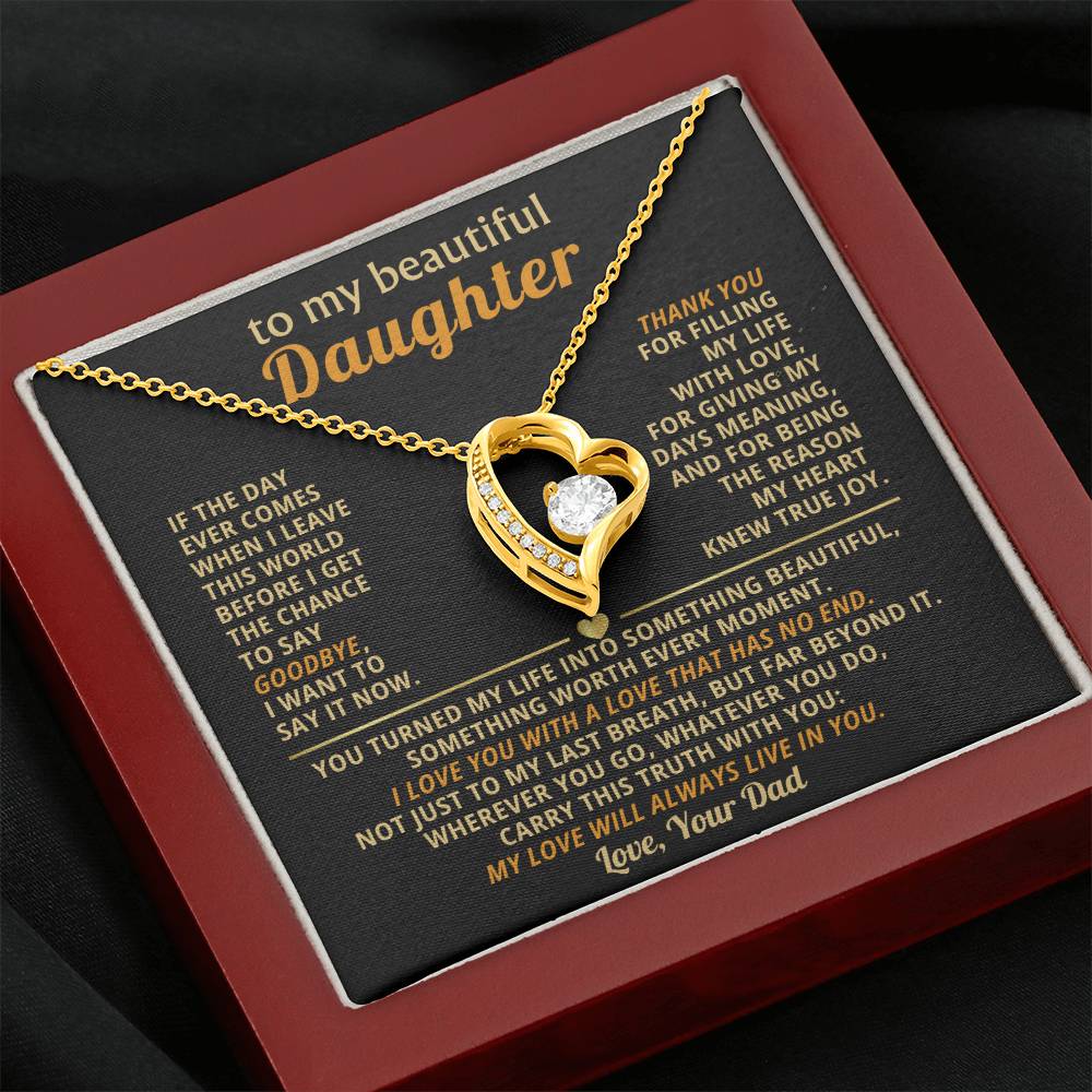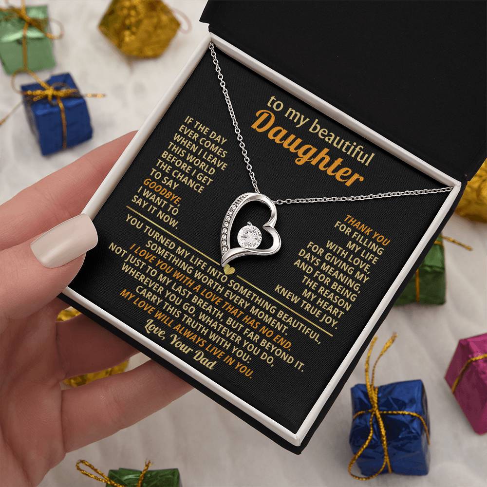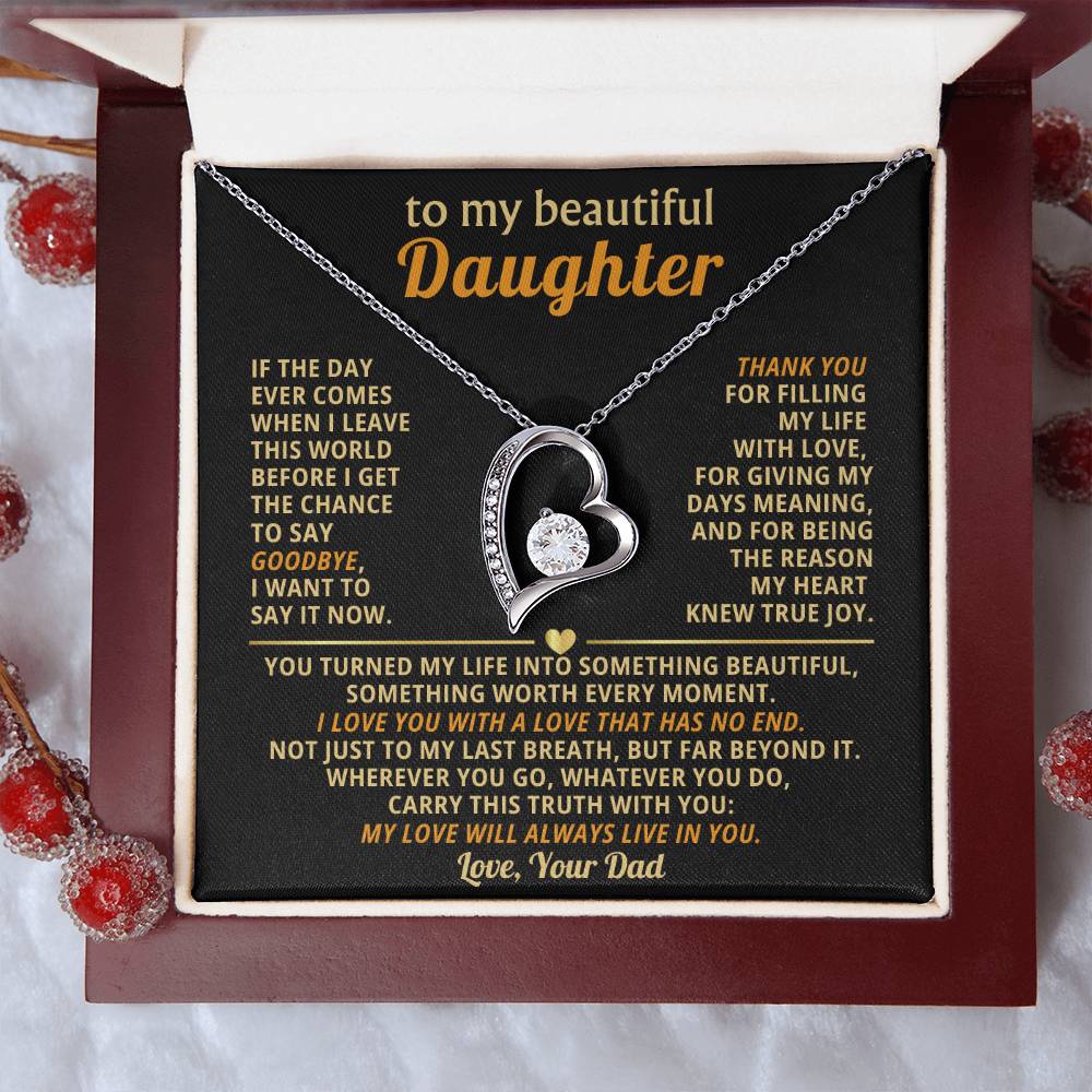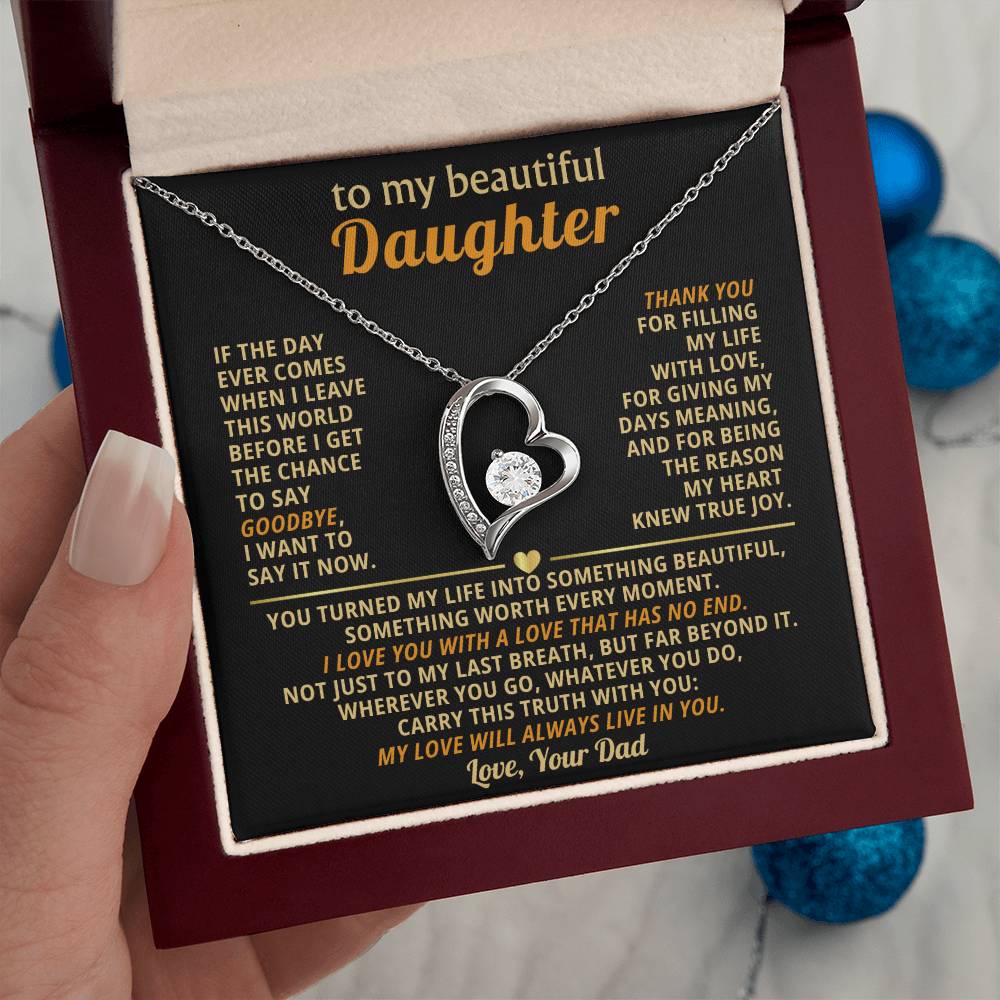 Quote On Card: TO MY BEAUTIFUL DAUGHTER, If the day ever comes when I leave this world before I get the chance to say goodbye, I want to say it now. Thank you for filling my life with love, for giving my days meaning, and for being the reason my heart knew true joy. You turned my life into something beautiful, something worth every moment. I love you with a love that has no end. Not just to my last breath, but far beyond it. Wherever you go, whatever you do, carry this truth with you: my love will always live in you. Love Your Dad