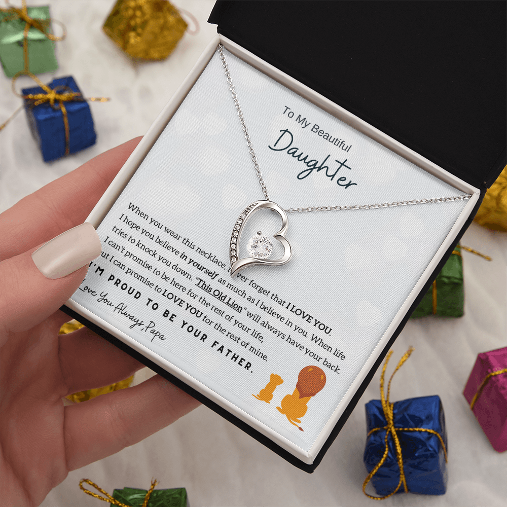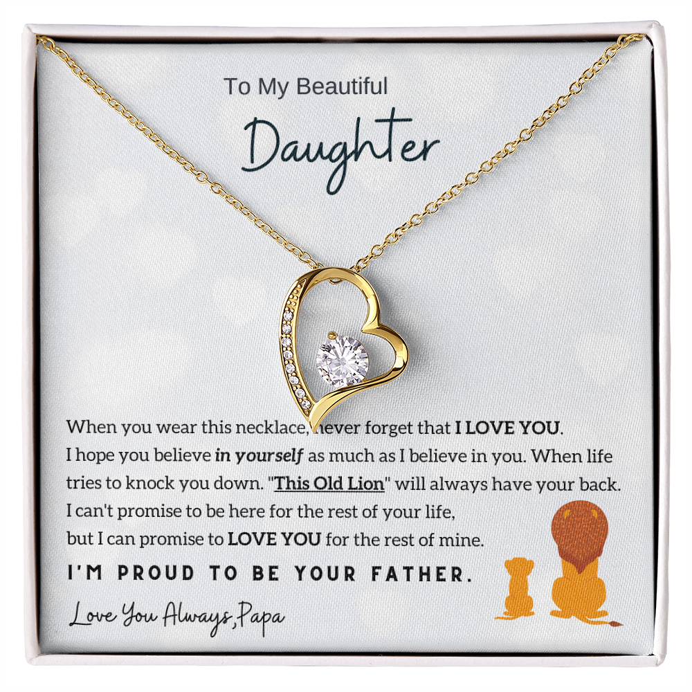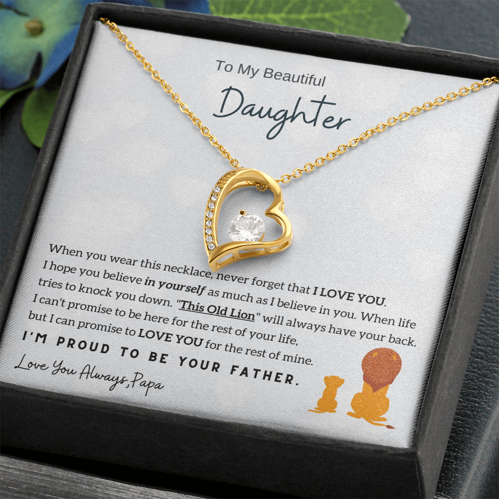 "To My Beautiful Daughter, When you wear this necklace, never forget that I LOVE YOU. I hope you believe in yourself as much as I believe in you. When life tries to knock you down. "This Old Lion" will always have your back. I can't promise to be here for the rest of your life, but I can promise to LOVE YOU for the rest of mine. I'm proud to be your FatherLove You Always, Dad"