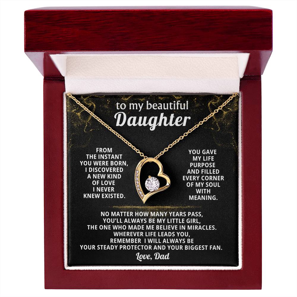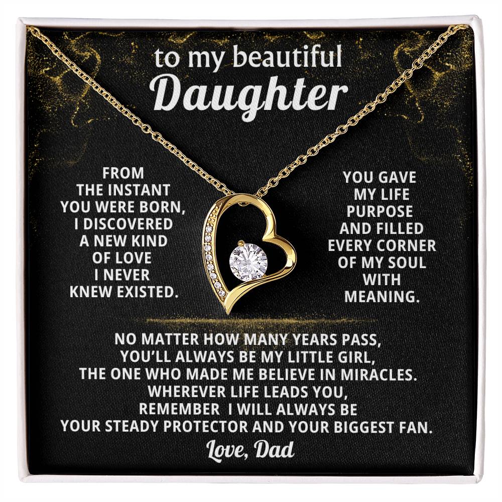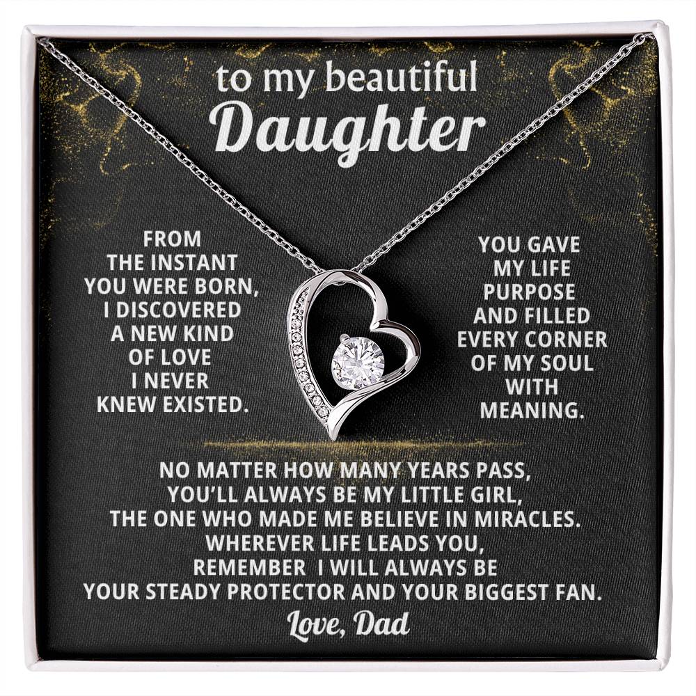 Quote On Card: TO MY BEAUTIFUL DAUGHTER, From the instant you were born, I discovered a new kind of love I never knew existed. You gave my life purpose and filled every corner of my soul with meaning. No matter how many years pass, you’ll always be my little girl, the one who made me believe in miracles. Wherever life leads you, remember I will always be your steady protector and your biggest fan. Love, Dad