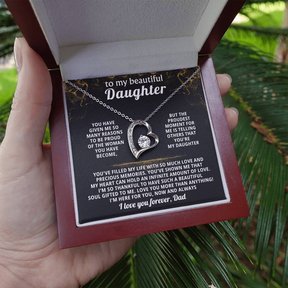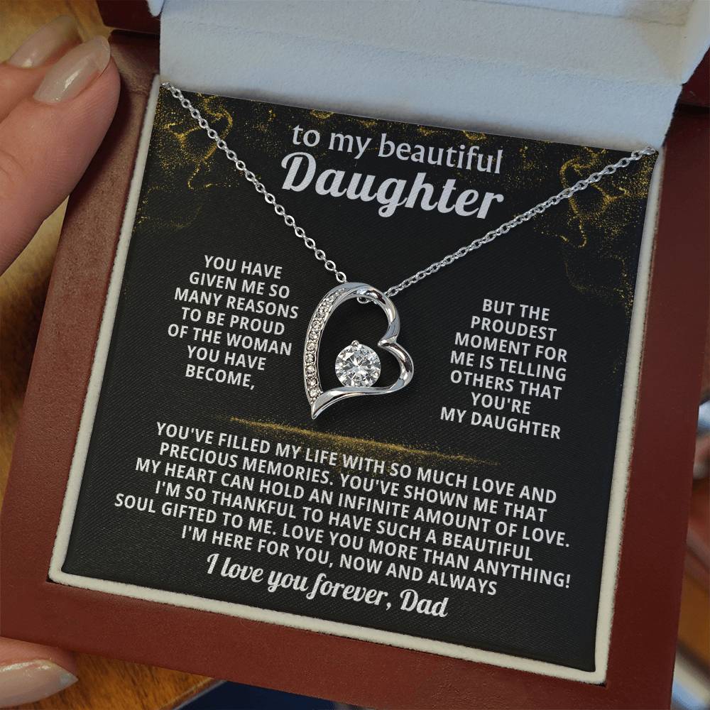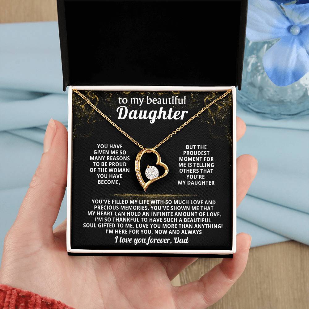 Quote On Card: TO MY BEAUTIFUL DAUGHTER, You have given me so many reasons to be proud of the woman you have become, but the proudest moment for me is telling others that you're my Daughter. You've filled my life with so much love and precious memories. You've shown me that my heart can hold an infinite amount of love. I'm so thankful to have such a beautiful soul gifted to me. Love you more than anything! I'm here for you, now and always, I love you forever, Dad